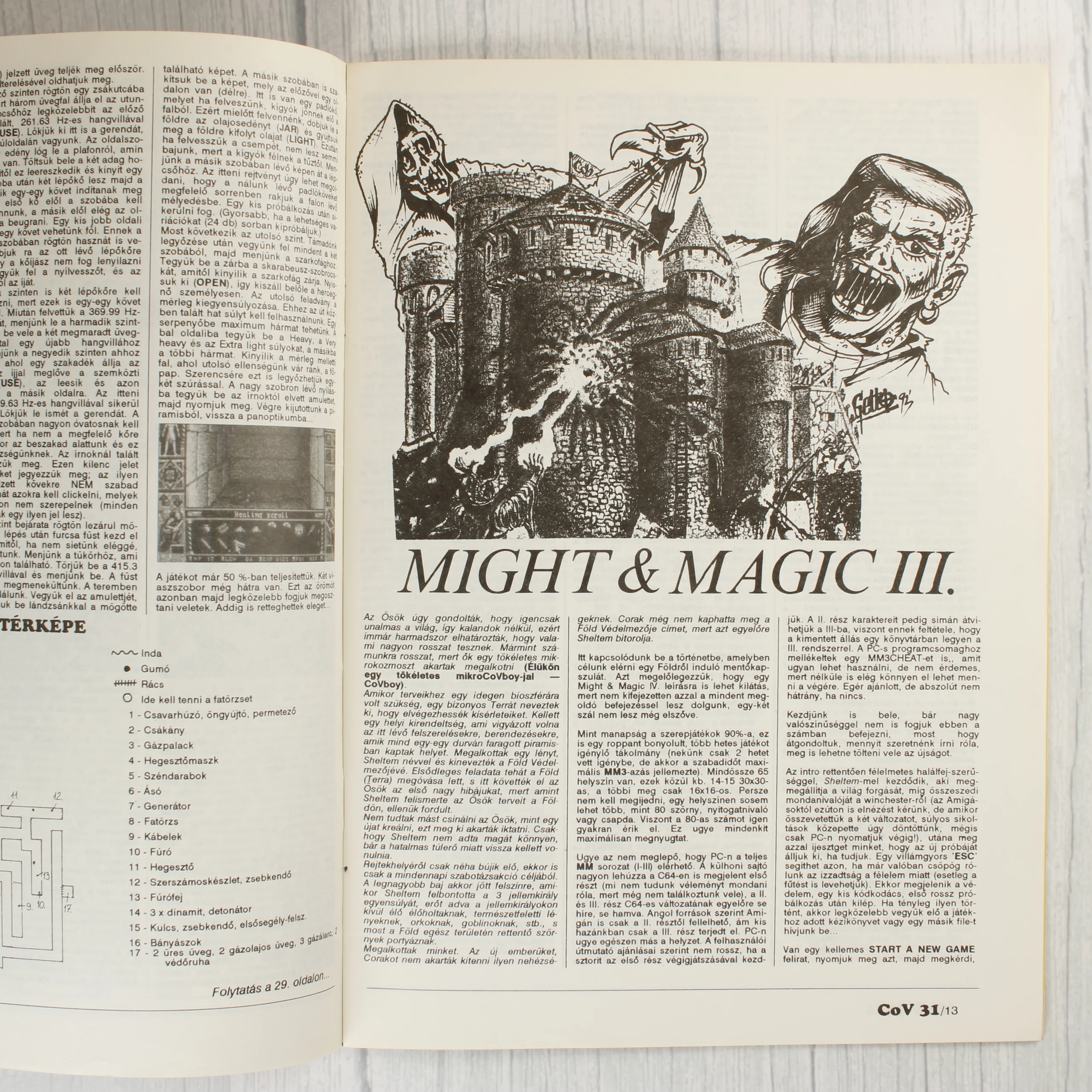 A Commodore Világ (CoV) számítástechnikai magazin 31. száma, amely 1993 januárjában jelent meg. A borítón egy csontvázas illusztráció látható, sárga és vörös tónusokkal, valamint a Might & Magic III. videójáték címe olvasható kiemelt betűkkel. A címlapon említésre kerülnek a C64, Amiga, PC és Plus/4 platformok, valamint olyan játékok, mint az M4 Sherman, a Mars Saga és a Transworld. A belső oldalakon fekete-fehér szöveges tartalom, illusztrációk és játékleírások találhatók. Az újság papír alapú, tűzött kötésű, a korának megfelelő állapotban van.