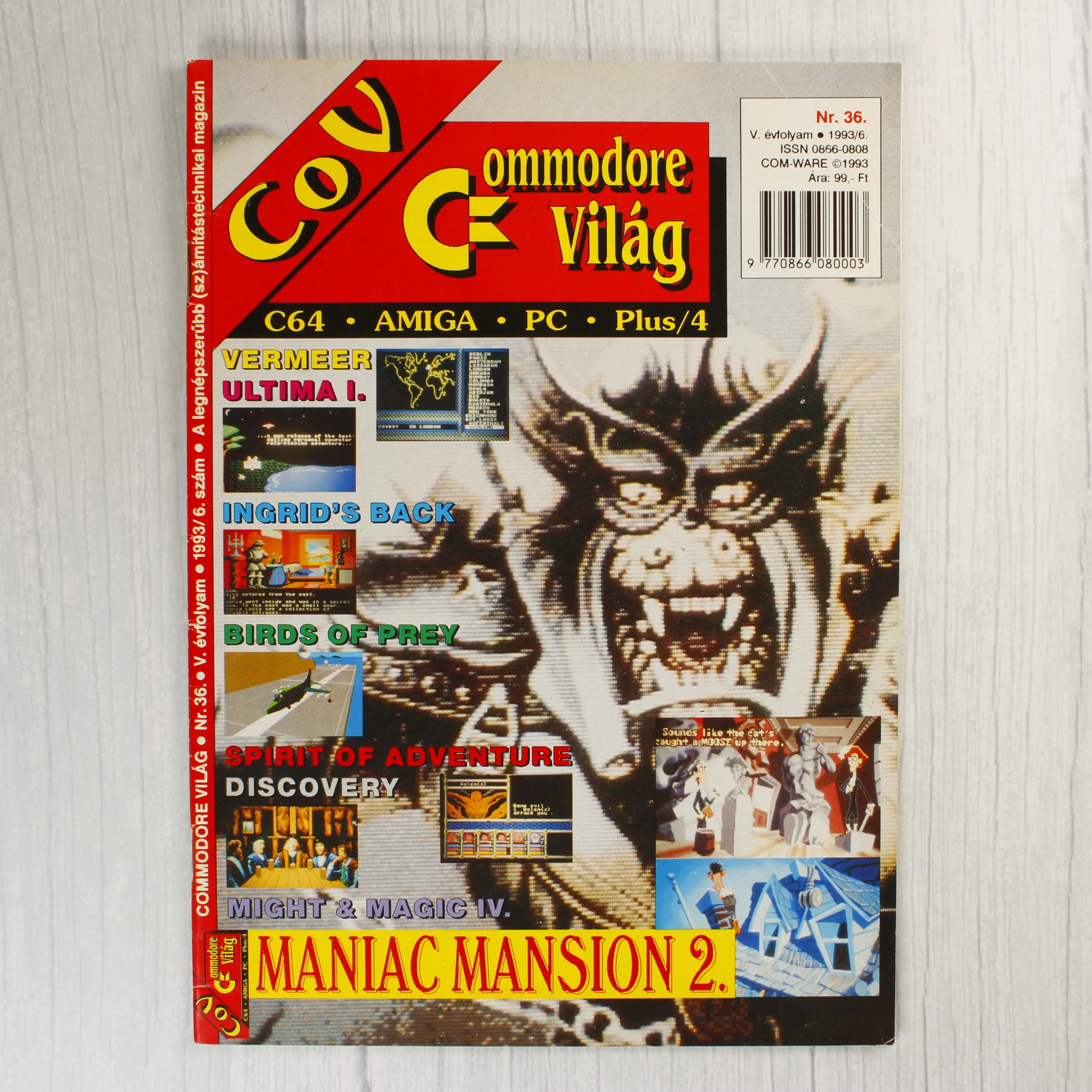 A Commodore Világ (COV) számítástechnikai magazin 36. száma, amely 1993 júniusában jelent meg. A címlapon egy nagyméretű, szemüveges, vicsorgó szörnyeteg grafikája látható, mellette pedig olyan klasszikus videójátékok címei és képernyőfotói szerepelnek, mint a Vermeer, Ultima I., Birds of Prey és a Maniac Mansion 2. A fejlécben a C64, Amiga, PC és Plus/4 platformok nevei olvashatók. A belső oldalon a Might and Magic IV: Clouds of Xeen című szerepjáték részletes leírása és végigjátszása található, fekete-fehér szövegezéssel és illusztrációkkal. A papír a korának megfelelő, enyhén sárgult állapotban van, a széleken minimális kopás tapasztalható.