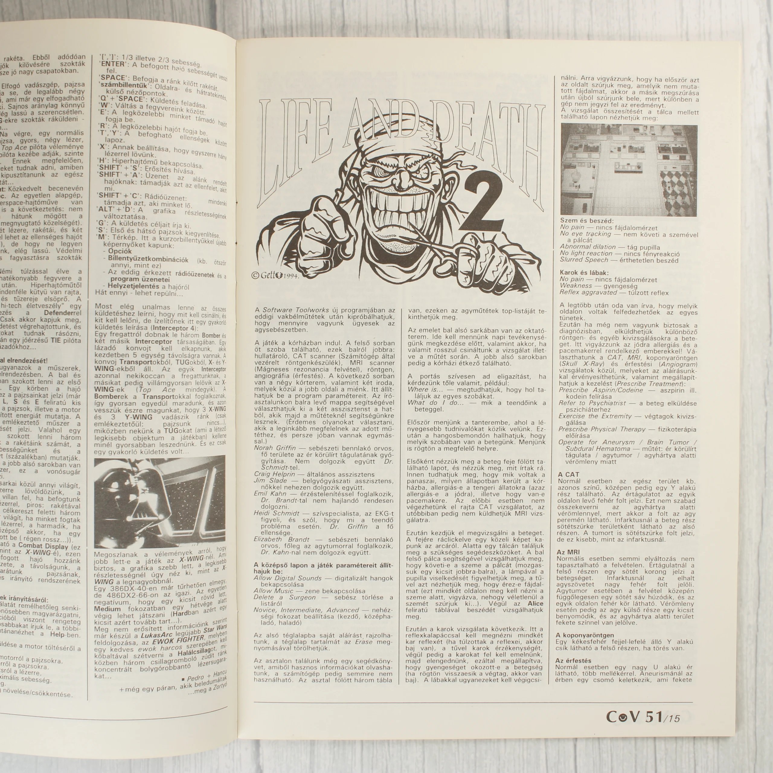 A Commodore Világ (COV) számítástechnikai magazin 1994. decemberi, 51. száma. A borítón egy nagyméretű, vöröses tónusú emberi szem látható, amelyben egy robbanás tükröződik. A címlapon olyan videójátékok címei és képernyőfotói szerepelnek, mint a Master of Magic, Tie Fighter, Arcade Pool, Crystal Kingdom Dizzy, Colonization és a Life and Death II. A fejlécben a C64, Amiga, PC és Plus/4 platformok jelzései láthatóak. A magazin belső oldala fekete-fehér nyomású, szöveges leírásokat és illusztrációkat tartalmaz a Life and Death 2 című játékhoz. A papír az éleknél enyhén sárgult, ami a korából adódó természetes állapot.