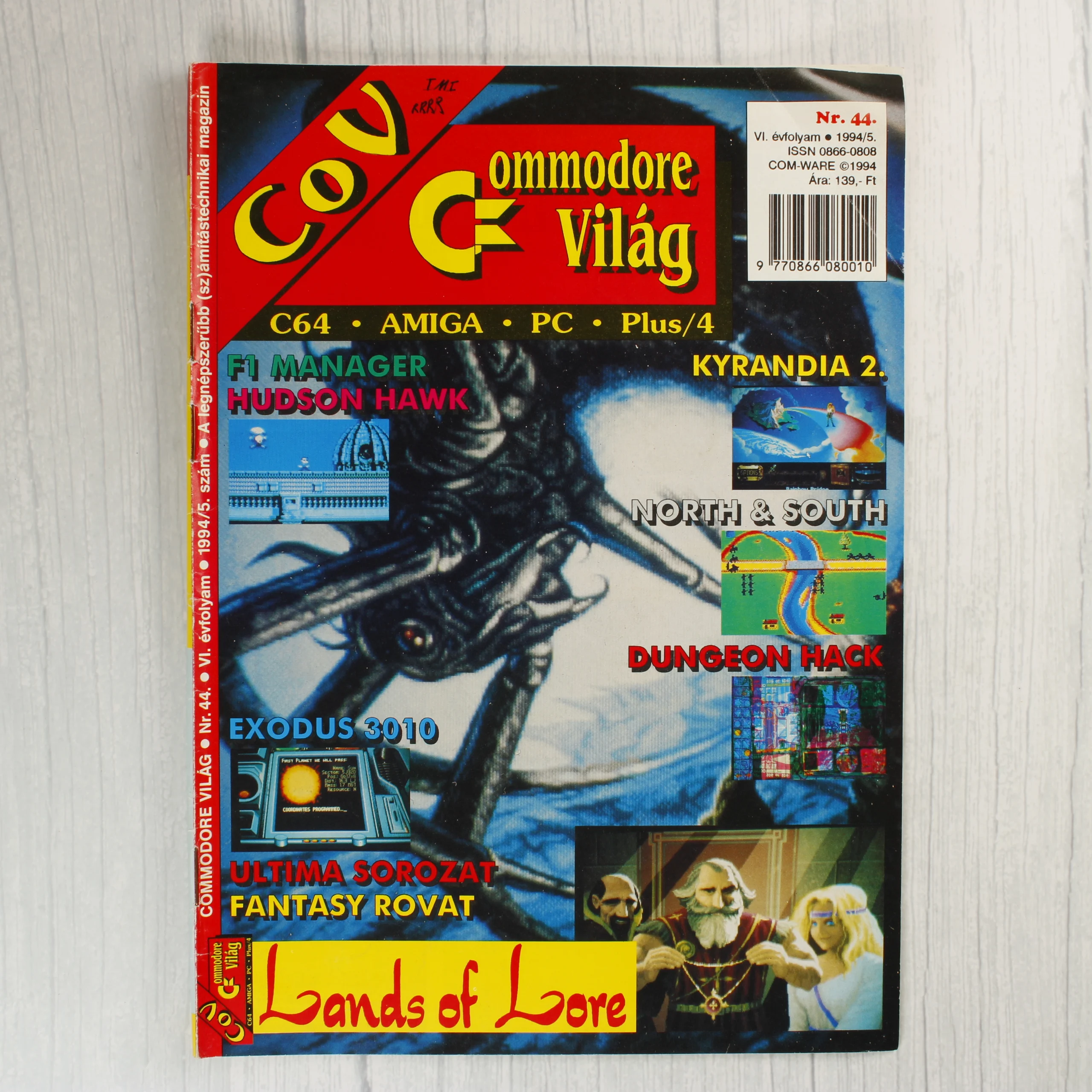 A Commodore Világ (COV) számítástechnikai magazin 44. száma, amely 1994 májusában jelent meg. A borítón színes illusztrációk láthatók különböző videójátékokból, többek között a Lands of Lore, Hudson Hawk és North & South címekből. A címlapon a C64, Amiga, PC és Plus/4 platformok logói szerepelnek. A magazin belső oldalai fekete-fehér nyomtatásúak, szöveges leírásokat, képernyőmentéseket és illusztrációkat tartalmaznak a Hudson Hawk játékról. A kiadvány tűzött kötésű, a borító fényes felületű, a belső lapok matt papírra készültek.