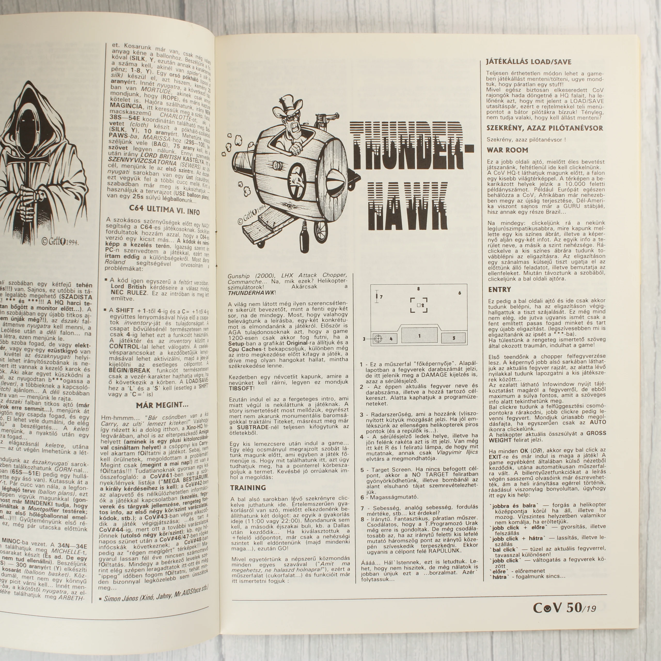 A Commodore Világ (COV) számítástechnikai magazin 50. jubileumi száma látható, amely 1994 novemberében jelent meg. A borítón színes illusztráció látható, amelyen egy sárga páncélos, vicsorgó karakter dominál. A címlapon olyan videójátékok címei olvashatók, mint a Doom II, Empire, Thunderhawk és az Ultima sorozat. A magazin C64, Amiga, PC és Plus/4 platformokkal foglalkozik. A jobb alsó sarokban egy sárga sáv hirdeti az 52 oldalas bővített terjedelmet. A belső oldalakon fekete-fehér szöveges tartalom, játékleírások és képernyőmentések láthatóak, többek között a Thunderhawk című játékról. A papír állapota a korának megfelelő, a széleken minimális kopás tapasztalható.