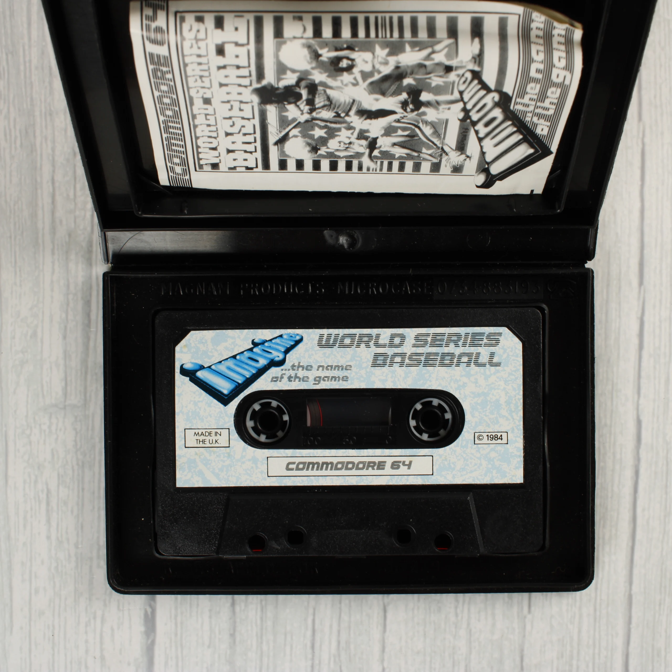 A World Series Baseball egy Commodore 64 platformra megjelent videójáték, amely mágnesszalagos kazetta formátumban került forgalomba. A termék egy fekete műanyag tokban található, amely tartalmazza az eredeti színes borítót és egy fekete-fehér használati útmutatót is. A borítón baseball-játékosok és pompomlányok láthatóak az amerikai zászló színeivel és csillagaival a háttérben. A kazetta fekete színű, fehér alapú címkével, amelyen kék feliratok és az Imagine logója látható. A hátoldalon négy képernyőkép mutatja be a játékmenetet, valamint angol nyelvű leírás olvasható a szoftver funkcióiról. A csomagolás és a hordozó fizikai állapota megkímélt, a korszakra jellemző minimális kopásnyomokkal.