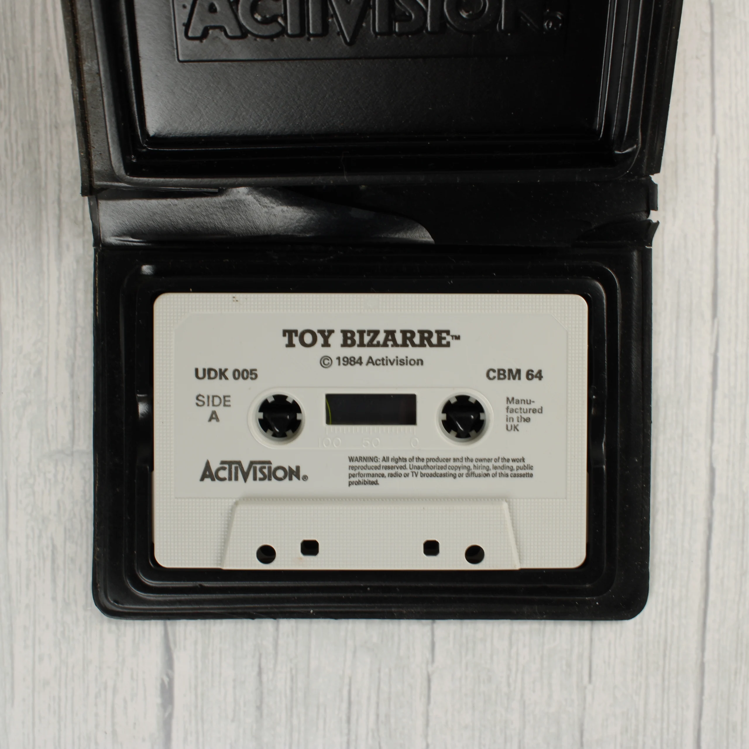 A Toy Bizarre című videójáték Commodore 64 platformra készült kiadása. A csomag egy fekete műanyag tokot és egy fehér színű magnókazettát tartalmaz. A borító grafikája egy piros ajándékdobozt ábrázol, amelyen egy színes bábu keze tör át. A tok elején egy sárga kör alakú matrica jelzi a kompatibilitást a Commodore 64 géppel. A hátoldalon angol nyelvű leírás, egy képernyőkép a játékból és a gyártó, az Activision adatai láthatóak. A kazetta címkéje letisztult, fekete feliratokkal tartalmazza a játék címét, a kiadási évet és a modellszámot. A termék az 1984-es évből származik, az Egyesült Királyságban gyártották.