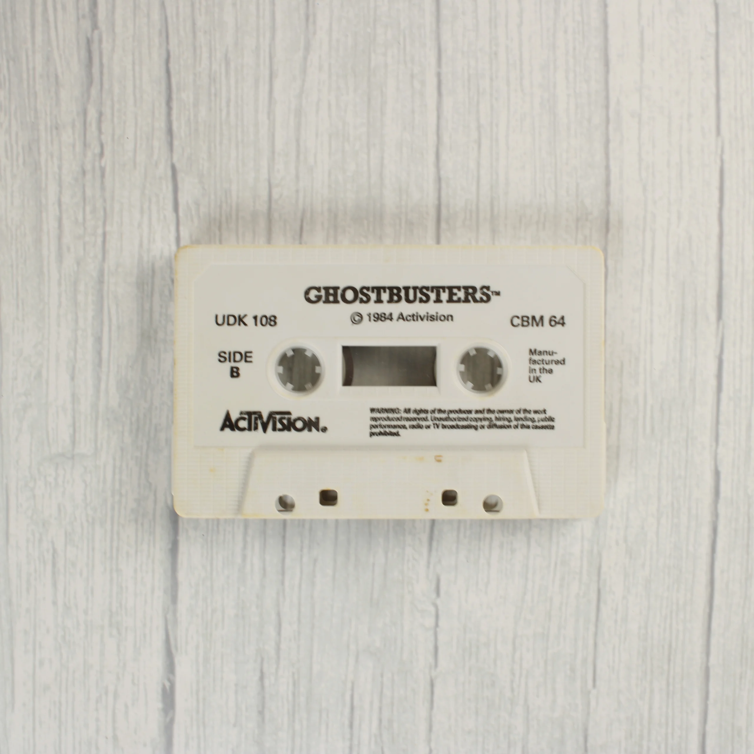 A Ghostbusters videójáték Commodore 64 platformra készült kiadása. A csomag egy fekete műanyag tokot és egy fehér színű mágnesszalagos kazettát tartalmaz. A tok előlapján a film ikonikus logója és a három főszereplő látható, míg a hátoldalon játékmenetből származó képernyőfotók és technikai adatok szerepelnek. A kazetta fehér műanyag házzal rendelkezik, rajta fekete feliratokkal, amelyek jelzik a címet, a kiadót és a platformot. A termék az 1984-es Activision kiadás, amely az Egyesült Királyságban készült.