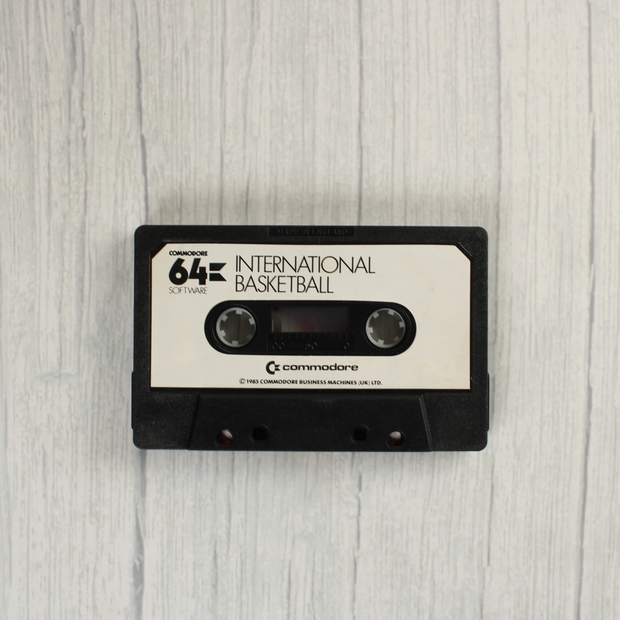 A Commodore 64 platformra megjelent International Basketball videójáték eredeti kiadása. A csomag tartalmazza a fekete műanyag tokot a színes papírborítóval, valamint magát az adathordozó kazettát. A borító elején egy kosárlabda-mérkőzés pillanatképe látható, a felső sarokban a jellegzetes Commodore 64 Software logóval. A hátoldalon angol nyelvű leírás és egy képernyőkép található a játékról. A kazetta fekete házas, fehér címkével, amelyen a játék címe és a gyártó adatai szerepelnek. A termék Angliában készült.