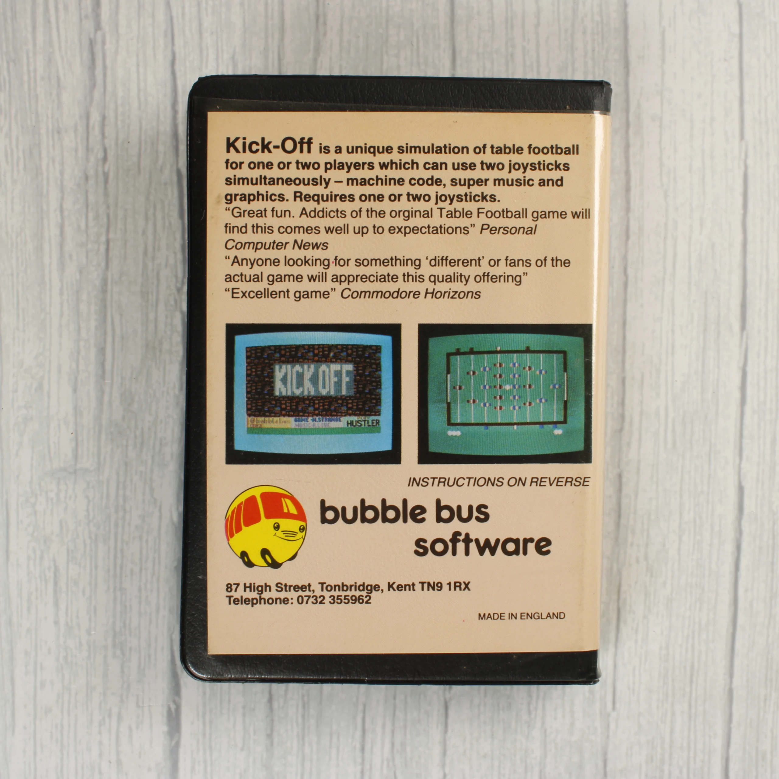 A Kick-Off című videójáték Commodore 64 platformra készült kiadása, amely egy fekete műanyag tokban található. A borítón egy sárga-piros csíkos mezben lévő labdarúgó látható rúgás közben, a háttérben kék sziluettekkel és egy nagyméretű futballlabdával. A kiadó a Bubble Bus Software. A csomag tartalmazza az eredeti mágnesszalagos kazettát is, amely fehér címkével és fekete feliratokkal rendelkezik. A tok hátoldalán angol nyelvű leírás és két képernyőkép látható a játékmenetről. A termék Angliában készült.