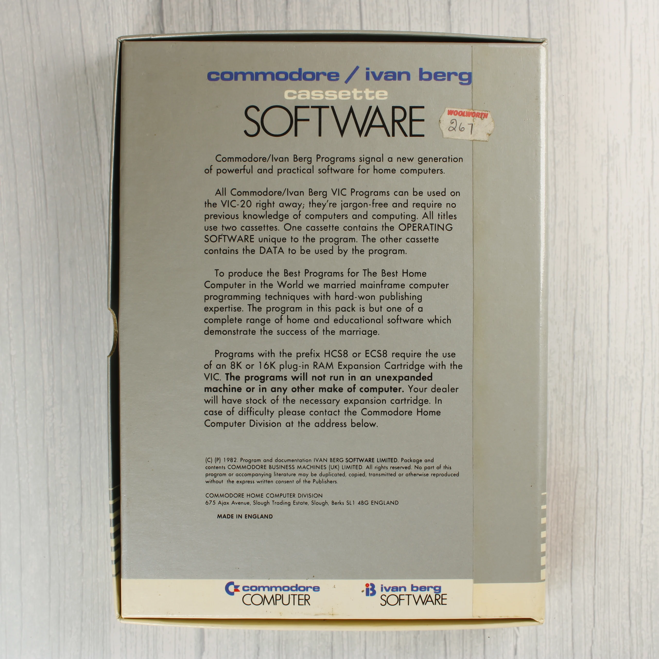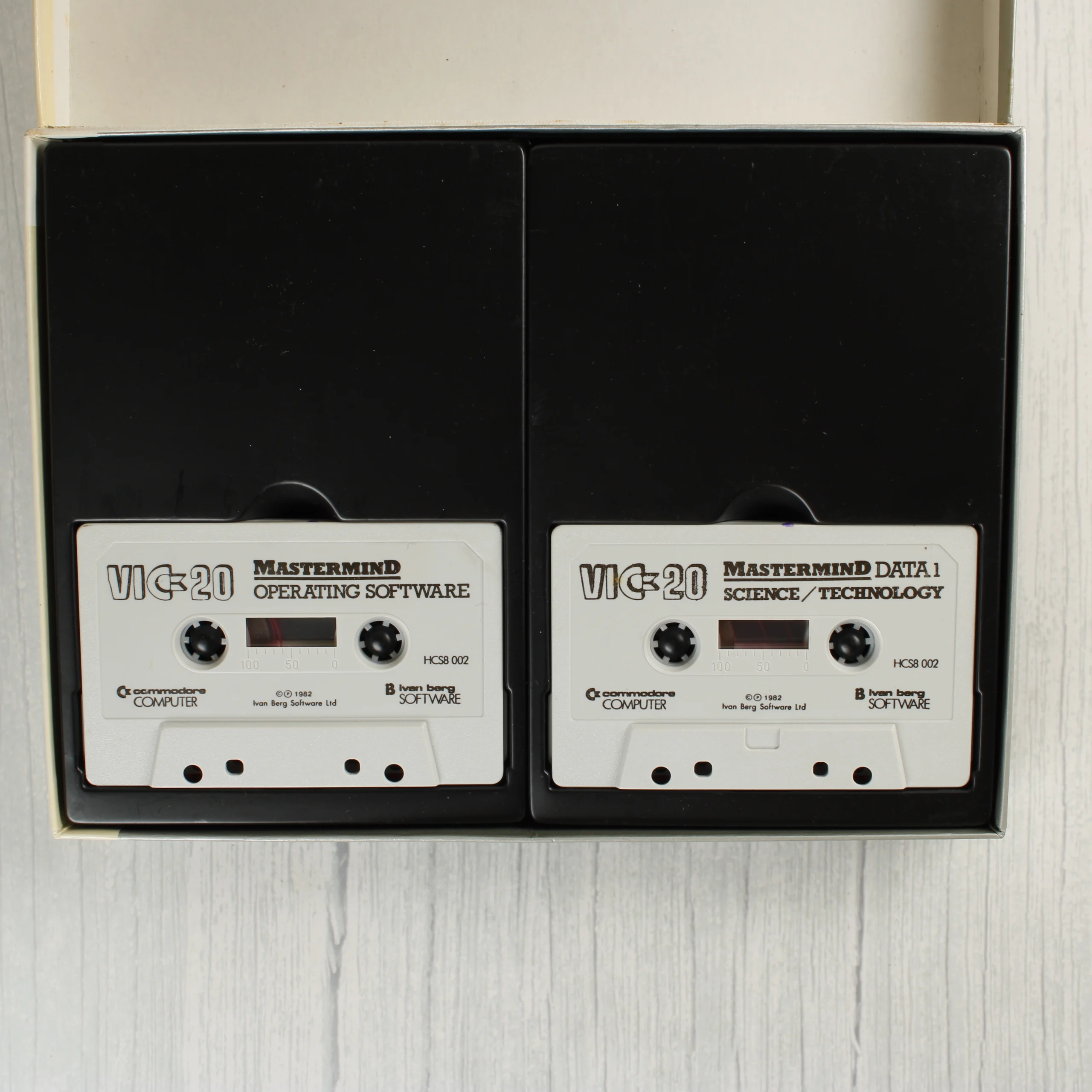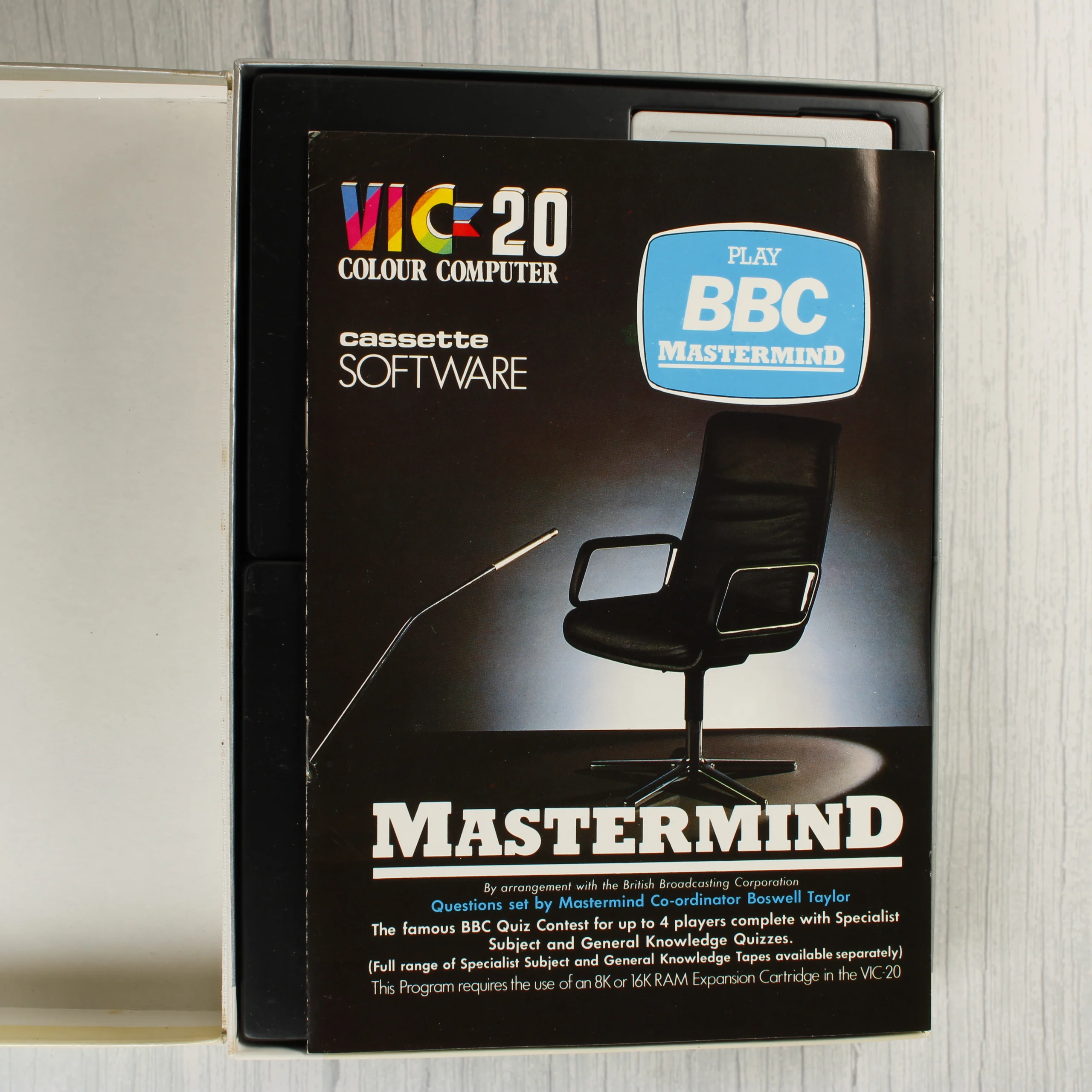 A Commodore VIC-20 számítógéphez készült Mastermind videójáték szoftvercsomagja. A készlet egy szürke kartondobozt, egy használati útmutatót és két darab fehér színű magnókazettát tartalmaz. A doboz elején a BBC Mastermind kvízműsor ikonikus fekete széke látható. Az egyik kazetta az operációs szoftvert, a másik a tudományos és technológiai adatokat tartalmazza. A csomagoláson a Commodore és az Ivan Berg Software logói szerepelnek. A doboz hátoldalán részletes angol nyelvű leírás olvasható a szoftver használatáról és a szükséges memóriabővítésről. A termék az 1982-es évből származik, és Angliában készült.