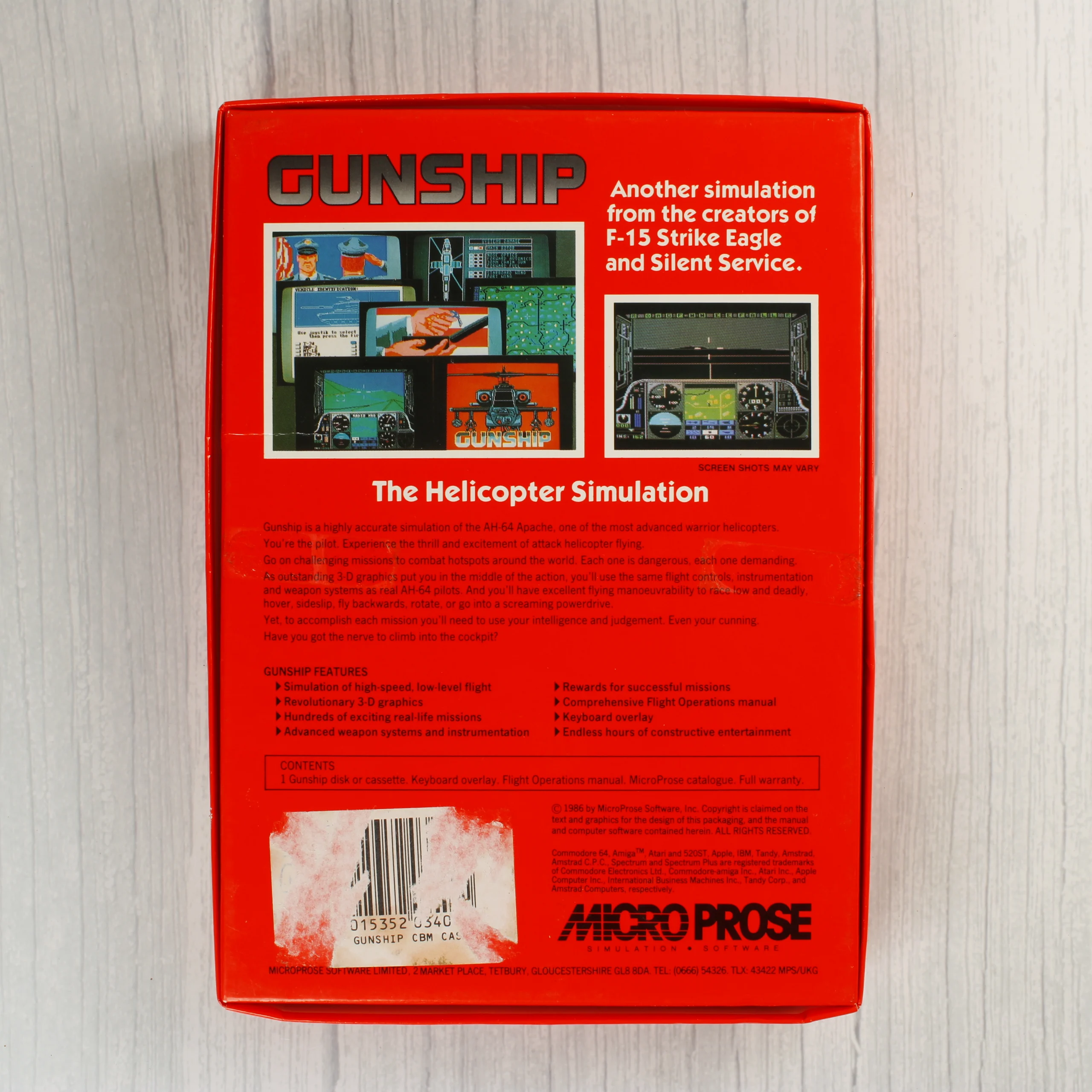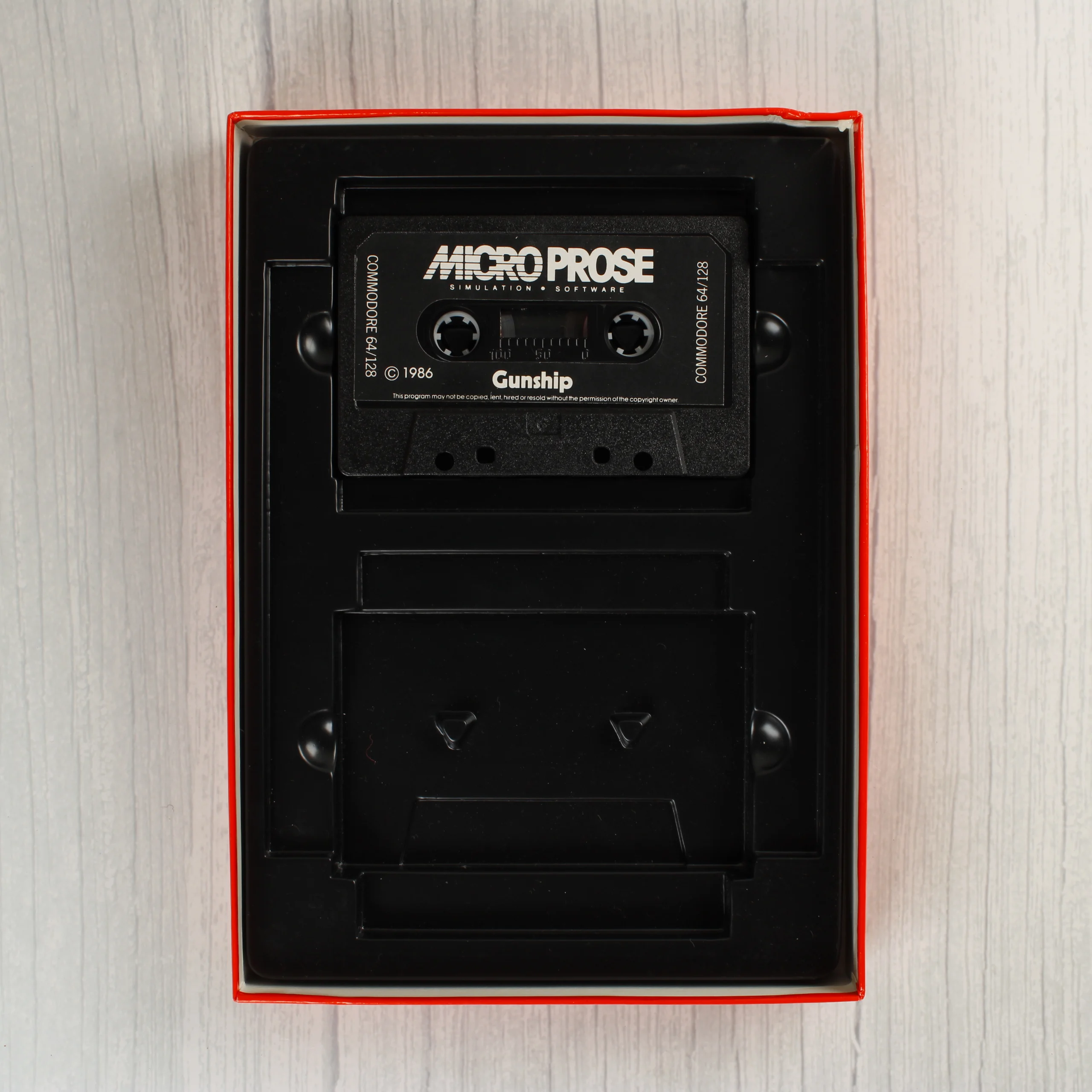 A MicroProse által kiadott Gunship című helikopter-szimulátor videójáték Commodore 64/128 platformra. A csomag egy élénkvörös kartondobozt tartalmaz, amelynek elején egy AH-64 Apache harci helikopter látható akció közben. A doboz hátoldalán játékmenet-képernyőképek és angol nyelvű leírás található. A készlet része egy eredeti, fekete színű műanyag kazetta, amelyen fehér feliratok jelzik a címet és a kiadót, valamint egy részletes, 'Operations Manual' feliratú használati útmutató füzet. A belső fekete műanyag tálca rögzíti az adathordozót. A dobozon egy régi árcímke vagy azonosító matrica maradványa látható a bal felső sarokban.