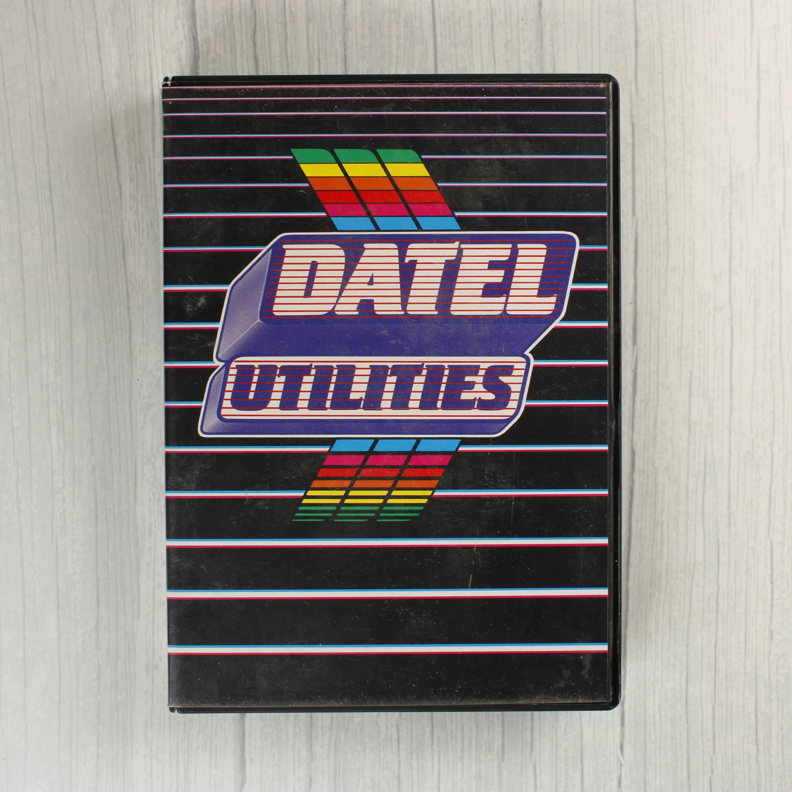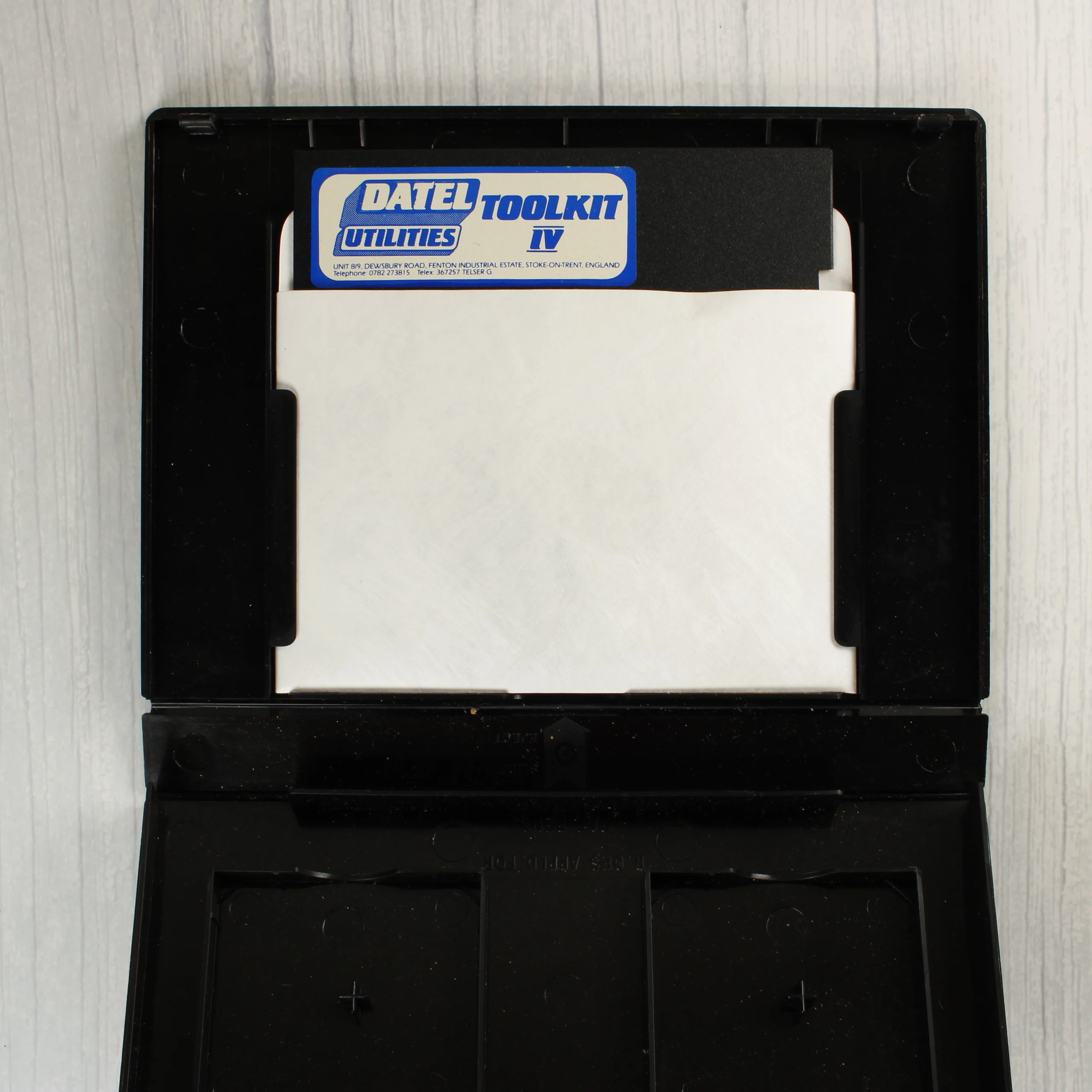 A Datel Utilities Toolkit IV szoftvercsomagja, amely egy fekete műanyag tokban található. A tok elején és hátulján vízszintes színes csíkozás látható, középen a Datel Utilities logóval. A belső részben egy fekete színű, 3 colos floppy lemez helyezkedik el fehér papírtokban. A lemezen kék-fehér címke található Datel Toolkit IV felirattal és a gyártó elérhetőségeivel. A tok és a lemez felületein használatból eredő apróbb karcok és porszemcsék láthatóak, de a szerkezeti épségük megmaradt. A papírtok enyhén gyűrött a széleinél.