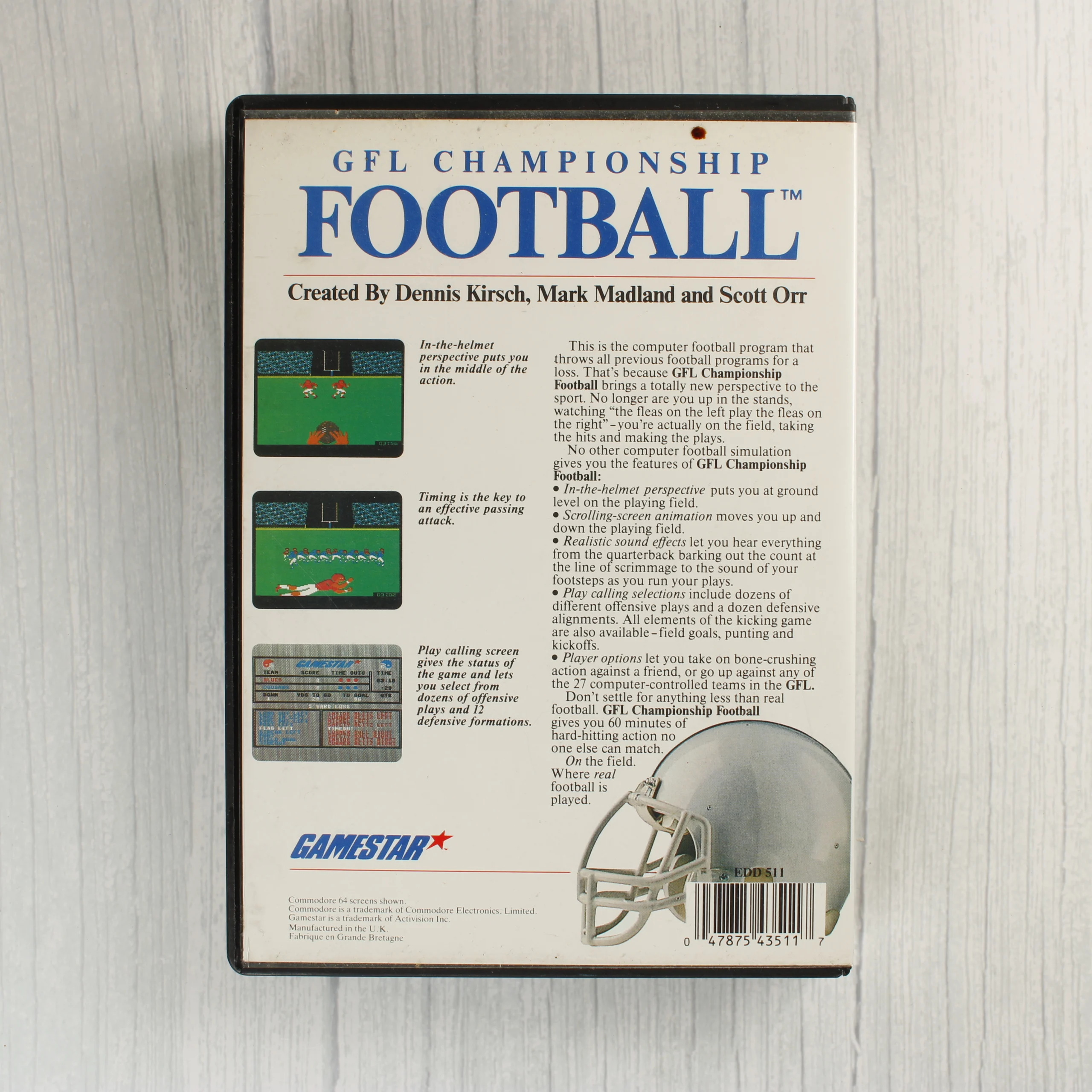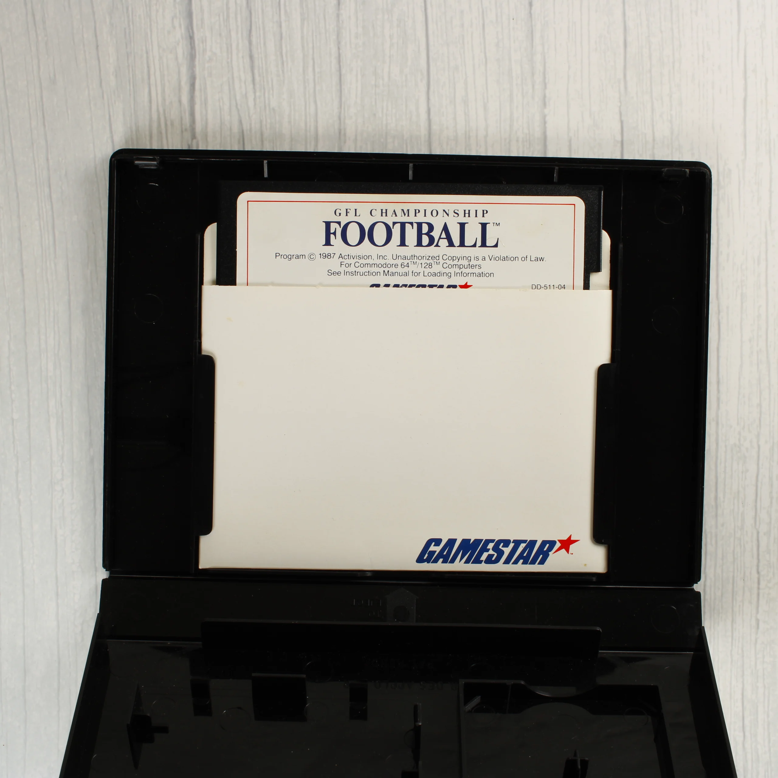 A GFL Championship Football egy amerikai futball szimulátor Commodore 64 és 128 számítógépekre. A termék egy fekete műanyag tokban található, amely tartalmazza a szoftvert hordozó 5,25 colos floppy lemezt egy fehér papírtokban. A borítón egy akciófotó látható, amelyen egy 11-es mezszámú játékos tartja a labdát. A hátoldalon három képernyőkép mutatja be a játékmenetet, köztük a sisak belső nézetét és a taktikai választófelületet. A kiadvány a Gamestar márkanév alatt jelent meg, a fejlesztők Dennis Kirsch, Mark Madland és Scott Orr. A csomagolás és a lemez címkéje angol nyelvű feliratokat tartalmaz. A tok és a papírtok állapota megkímélt, a színek élénkek, a felületeken csak minimális használati nyom látható.