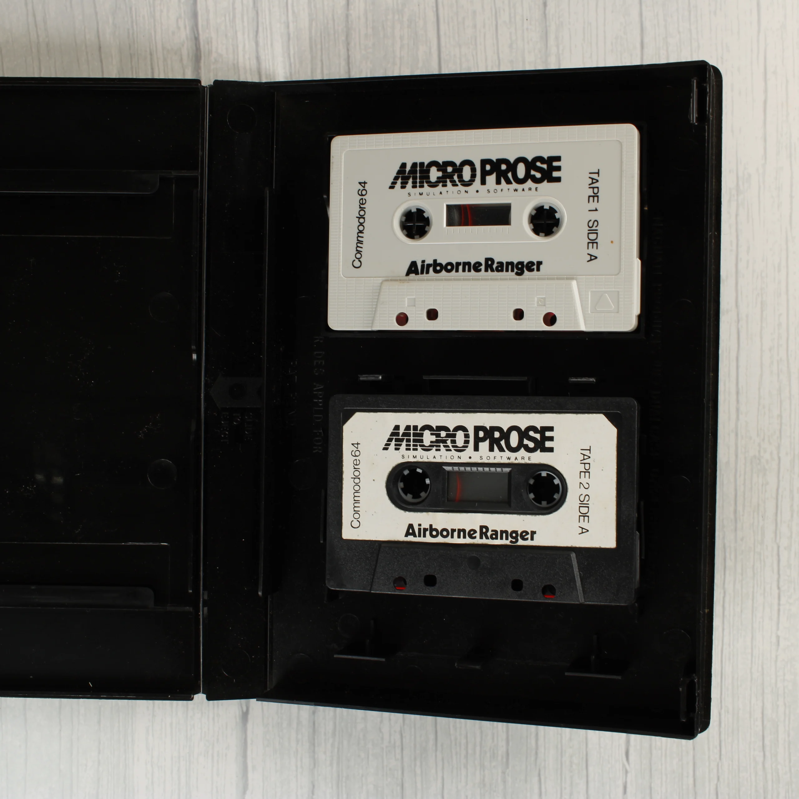 Az Airborne Ranger című videójáték Commodore 64 platformra készült kiadása. A csomag egy fekete műanyag tokot tartalmaz, amelyben két darab magnókazetta található: egy fehér és egy fekete színű. A tok elején a játék színes illusztrációval ellátott kézikönyve látható, amely katonai jeleneteket és egy ejtőernyős egységet ábrázol. A kézikönyv felső részén a technikai azonosító és a kiadás dátuma szerepel. A belső részben a kazetták mellett egy papír alapú billentyűzet-sablon vagy segédlet is helyet kapott, amely a játék irányításához szükséges funkciókat mutatja be. A MicroProse által kiadott szoftver fizikai hordozói és a kísérő dokumentáció láthatóan használt, de egyben lévő állapotban vannak.