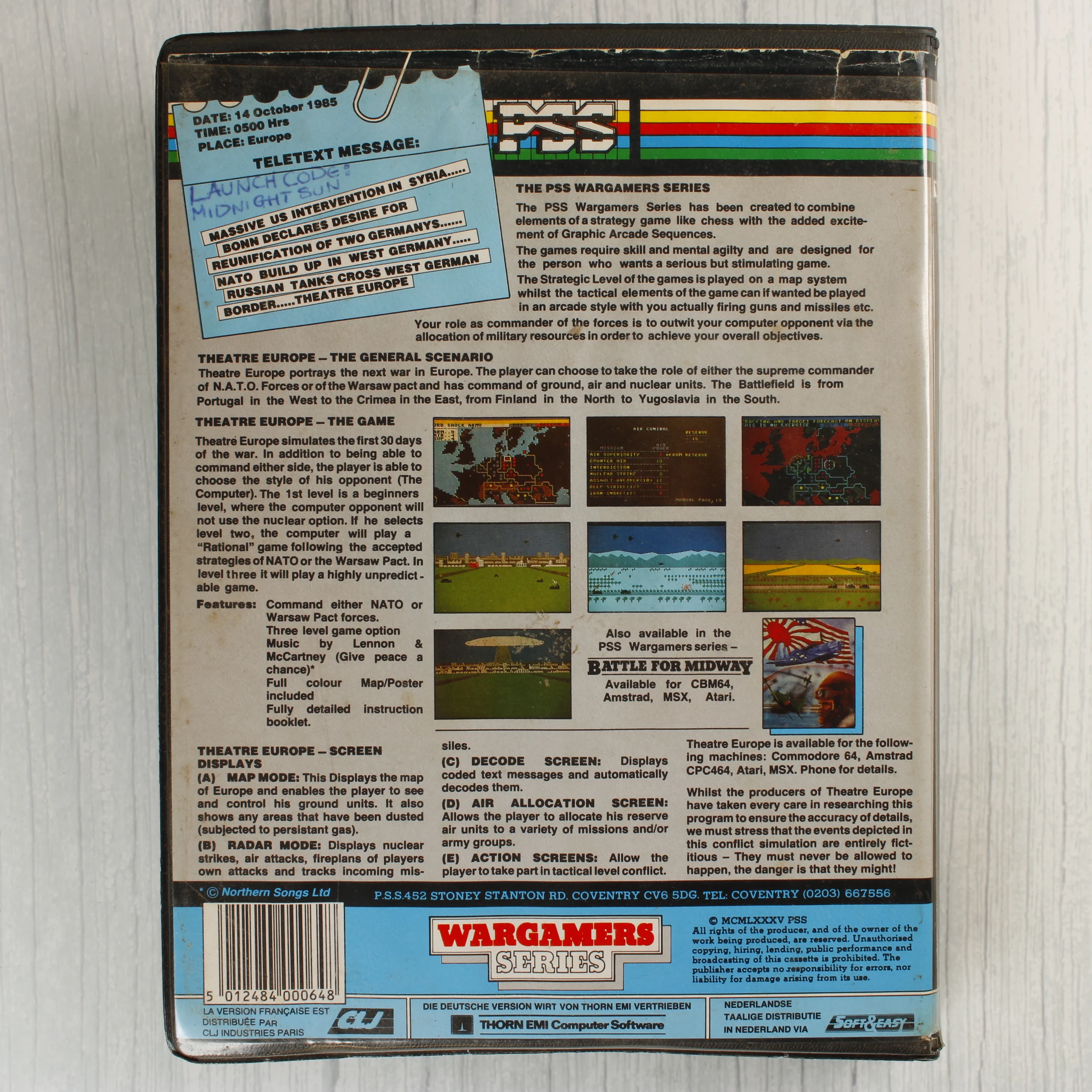 A Theatre Europe egy stratégiai videójáték Commodore 64 platformra, amely a PSS Wargamers Series tagja. A termék egy nagyméretű, fekete műanyag tokban érkezik, amelynek elején színes illusztráció látható szovjet és amerikai zászlókkal, rakétákkal és egy sakktábla-mintás térképpel. A csomag tartalmazza az eredeti mágnesszalagos kazettát, amely fehér színű, fekete feliratokkal és a PSS logójával ellátott. A tok hátoldalán részletes angol nyelvű leírás, képernyőmentések és a játék jellemzői olvashatóak. A borítón látható grafika a hidegháborús konfliktus szimulációjára utal. A kazetta a tok belső, formázott műanyag ágyában helyezkedik el. A csomagoláson látható a vonalkód és a kiadó adatai is.