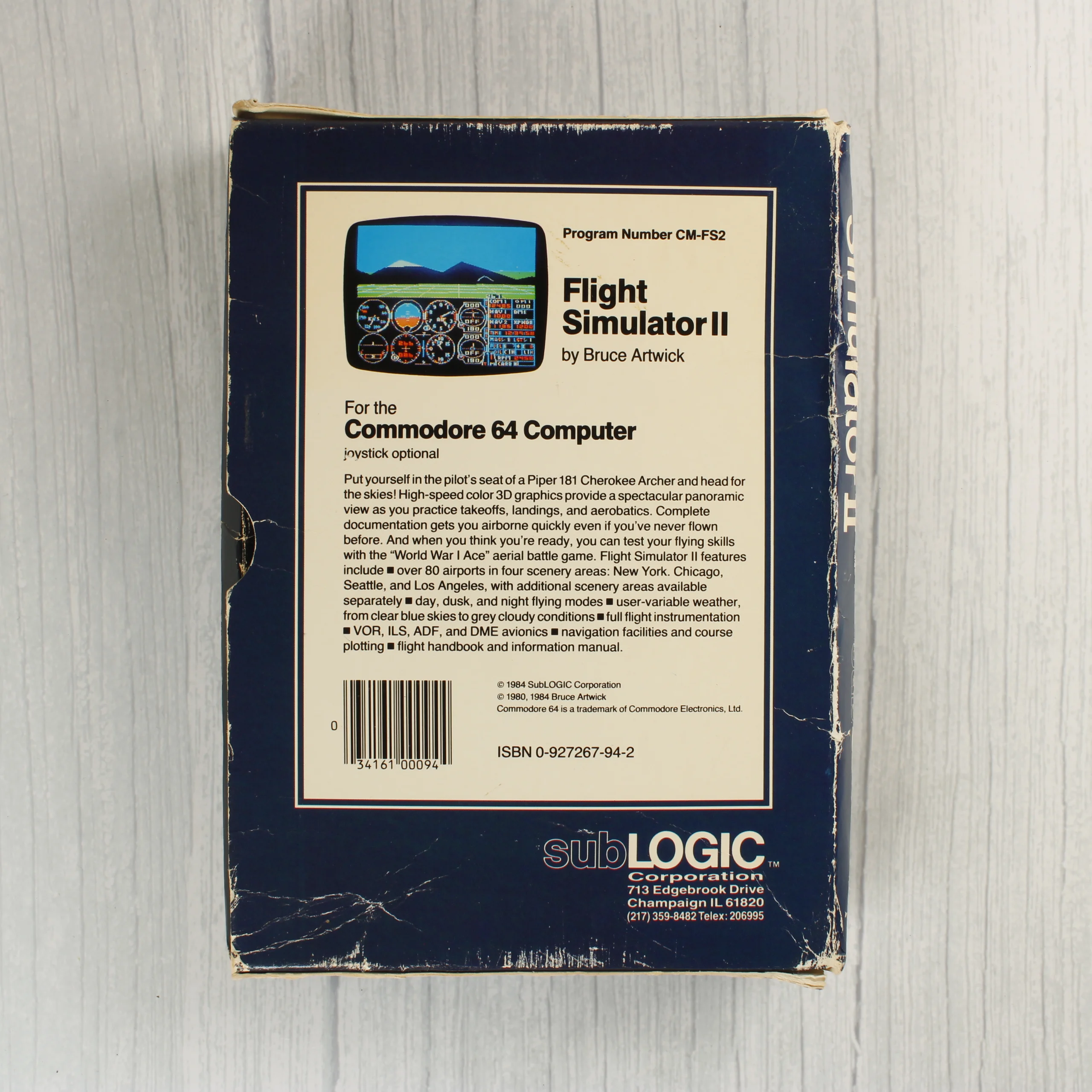 A Flight Simulator II videójáték Commodore 64 számítógépre kiadott változata. A csomag tartalmazza az eredeti kartondobozt, egy 5,25 colos floppy lemezt papírtokban, két darab kézikönyvet (Pilot's Operating Handbook és Flight Physics & Aircraft Control), egy Flight Reference Card segédletet, navigációs térképeket és egy gépelt kiadási megjegyzést. A doboz grafikája egy pilótát ábrázol a műszerfal előtt, a háttérben hegyekkel. A dobozon egy sárga árcédula látható. A kiadvány a subLOGIC Corporation terméke, Bruce Artwick munkája.