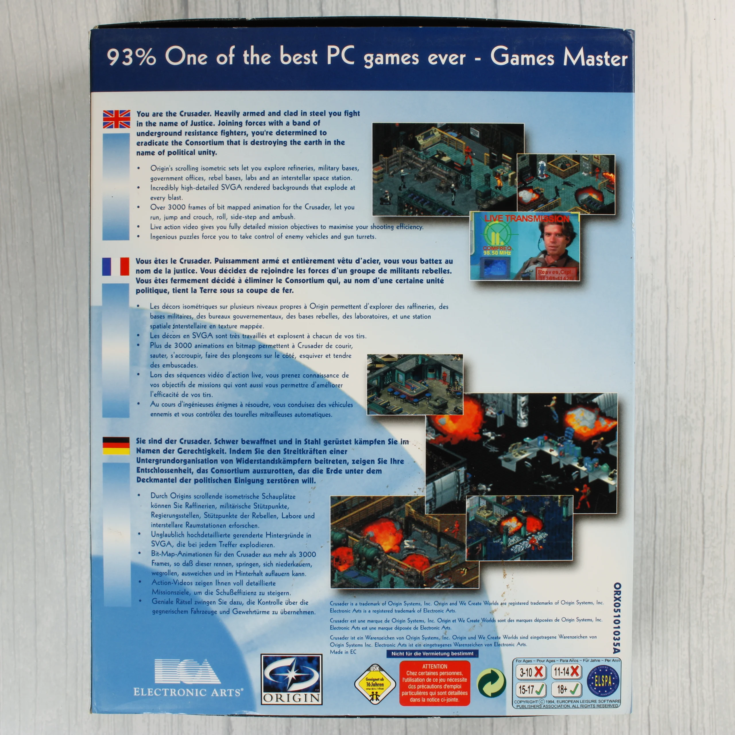 A Crusader: No Remorse című videójáték PC-s kiadása, amely az Electronic Arts Classics sorozatában jelent meg. A csomag tartalmazza a nagyméretű kartondobozt, amelyen egy vörös páncélos katona látható futurisztikus környezetben. A doboz hátoldalán angol, francia és német nyelvű leírások, valamint játékmenet-képek találhatók. A készlet része egy fekete borítójú, színes illusztrációval ellátott használati útmutató, egy belső információs füzet, valamint a játék CD-ROM lemeze egy normál CD-tokban. A lemez felülete vörös és fekete grafikával díszített. A csomagoláson látható az Origin és az Electronic Arts logója, valamint a 16 éven felülieknek szóló USK besorolás.