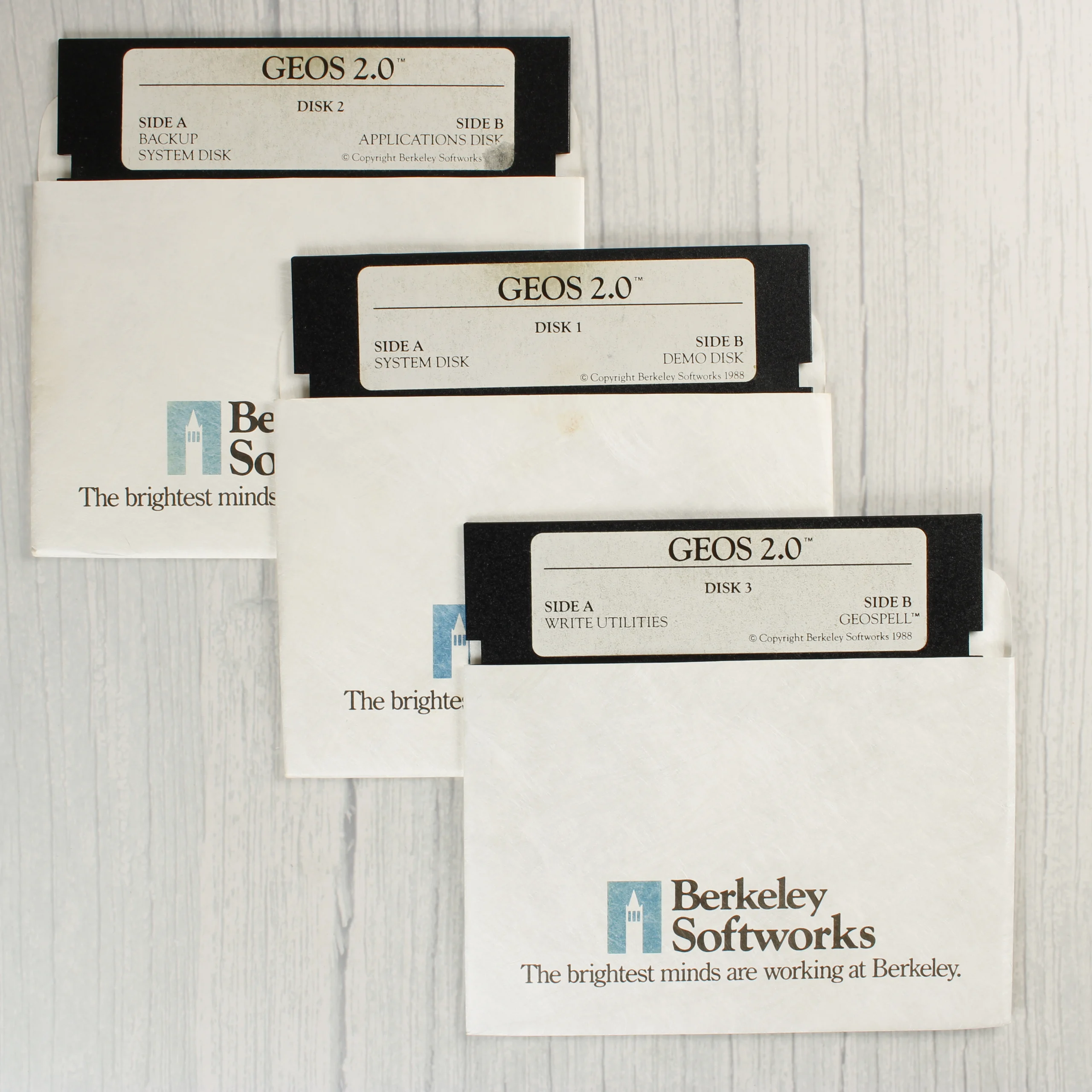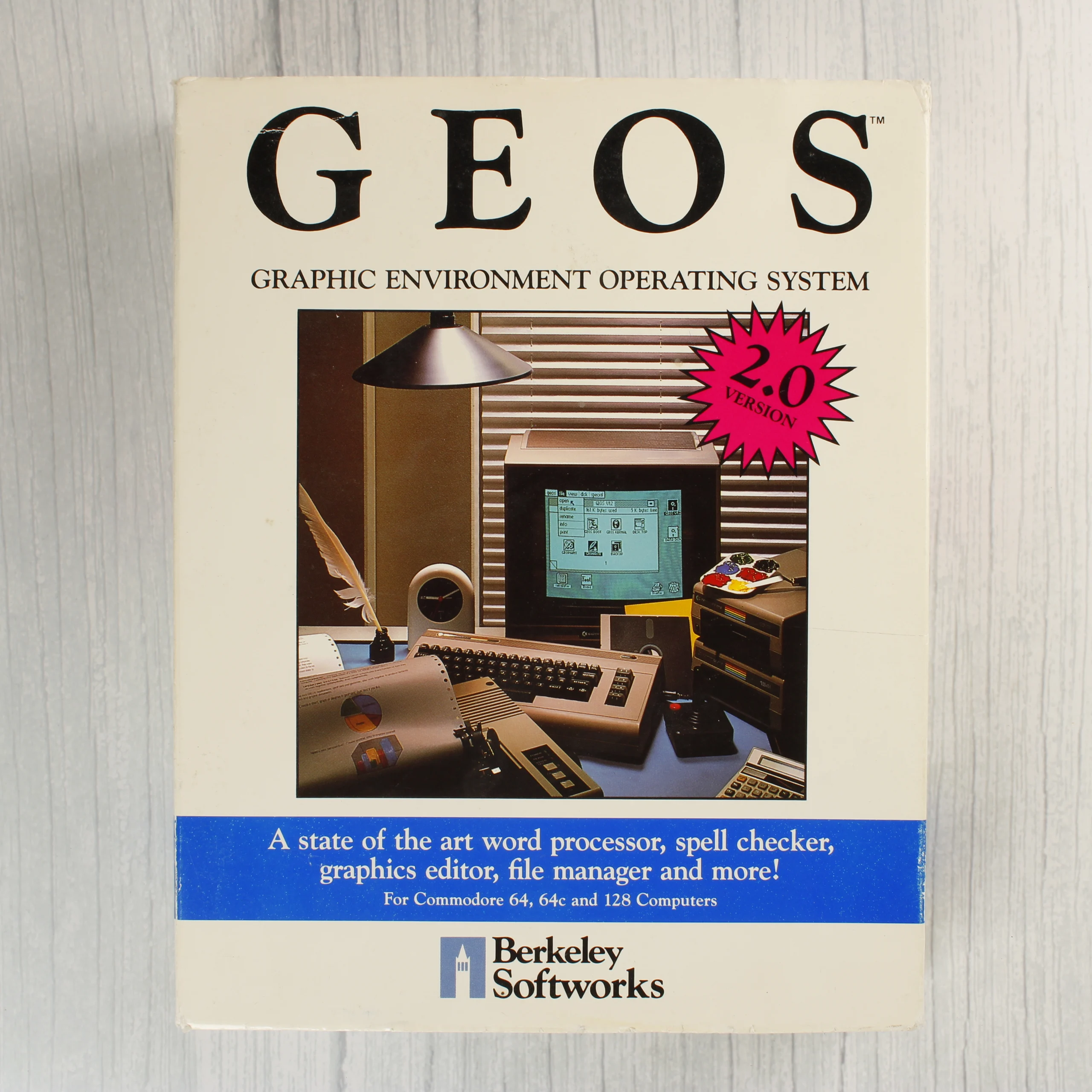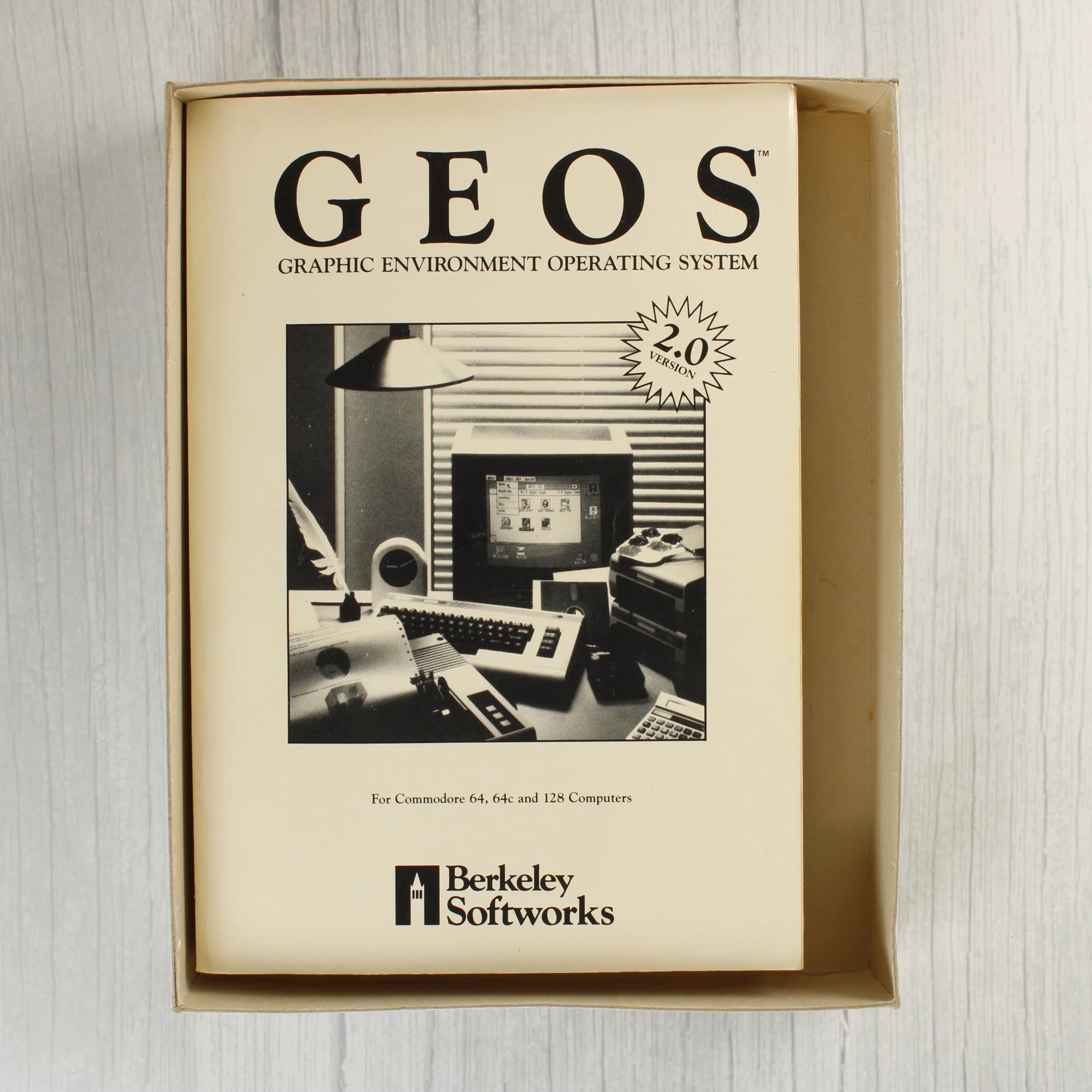 A Berkeley Softworks által kiadott GEOS 2.0 operációs rendszer Commodore 64, 64c és 128 számítógépekhez. A csomag tartalmazza az eredeti kartondobozt, egy vaskos felhasználói kézikönyvet és három darab 5,25 colos floppy lemezt papírtokban. A szoftver grafikus környezetet, szövegszerkesztőt (geoWrite), rajzprogramot (geoPaint) és egyéb segédprogramokat kínál. A doboz elején színes illusztráció látható egy korabeli számítógépes munkaállomásról, a hátoldalon pedig részletes leírás olvasható a funkciókról és a rendszerkövetelményekről. A lemezeken a GEOS 2.0 felirat, valamint a lemez sorszáma és az oldalak tartalma (System Disk, Applications Disk, Write Utilities stb.) szerepel.