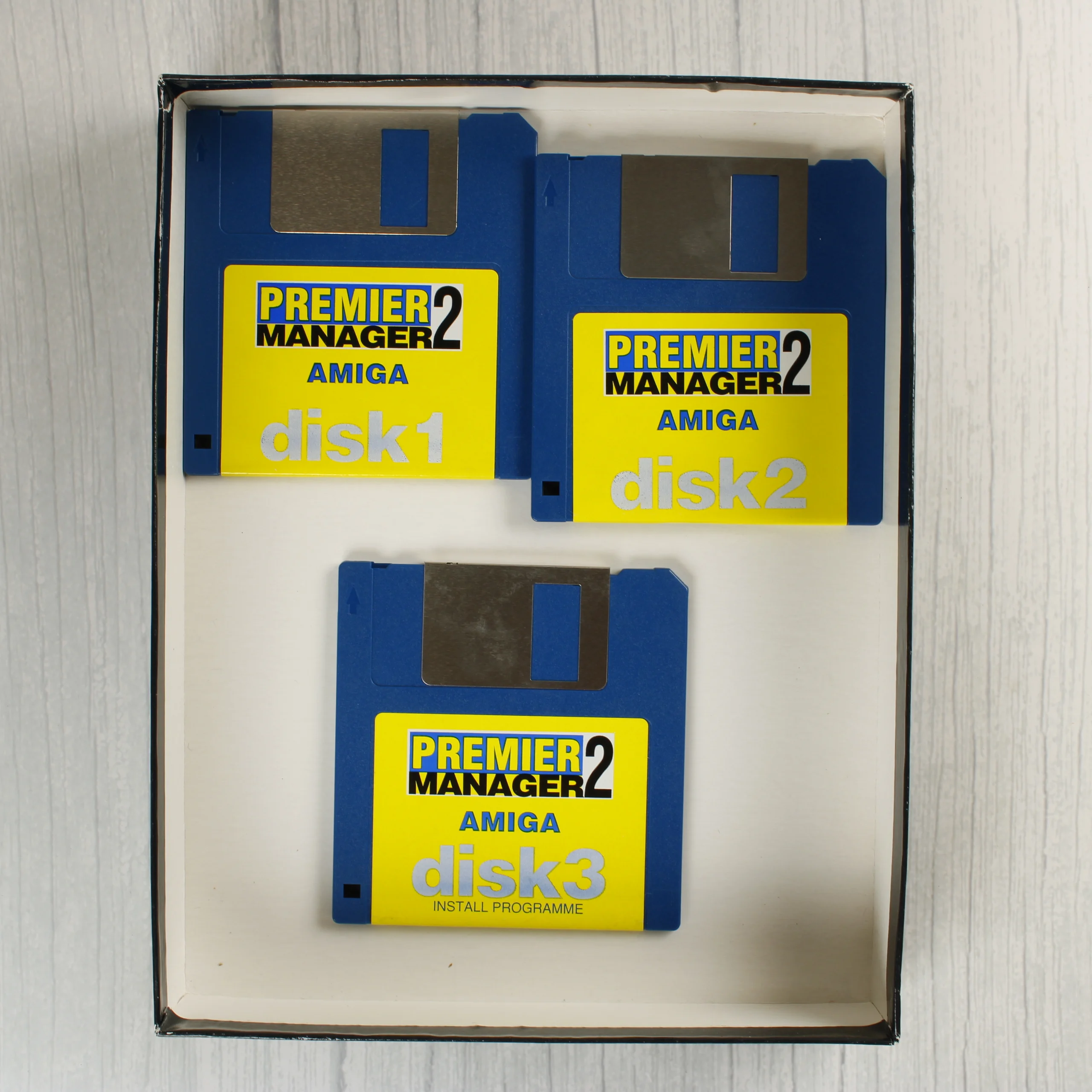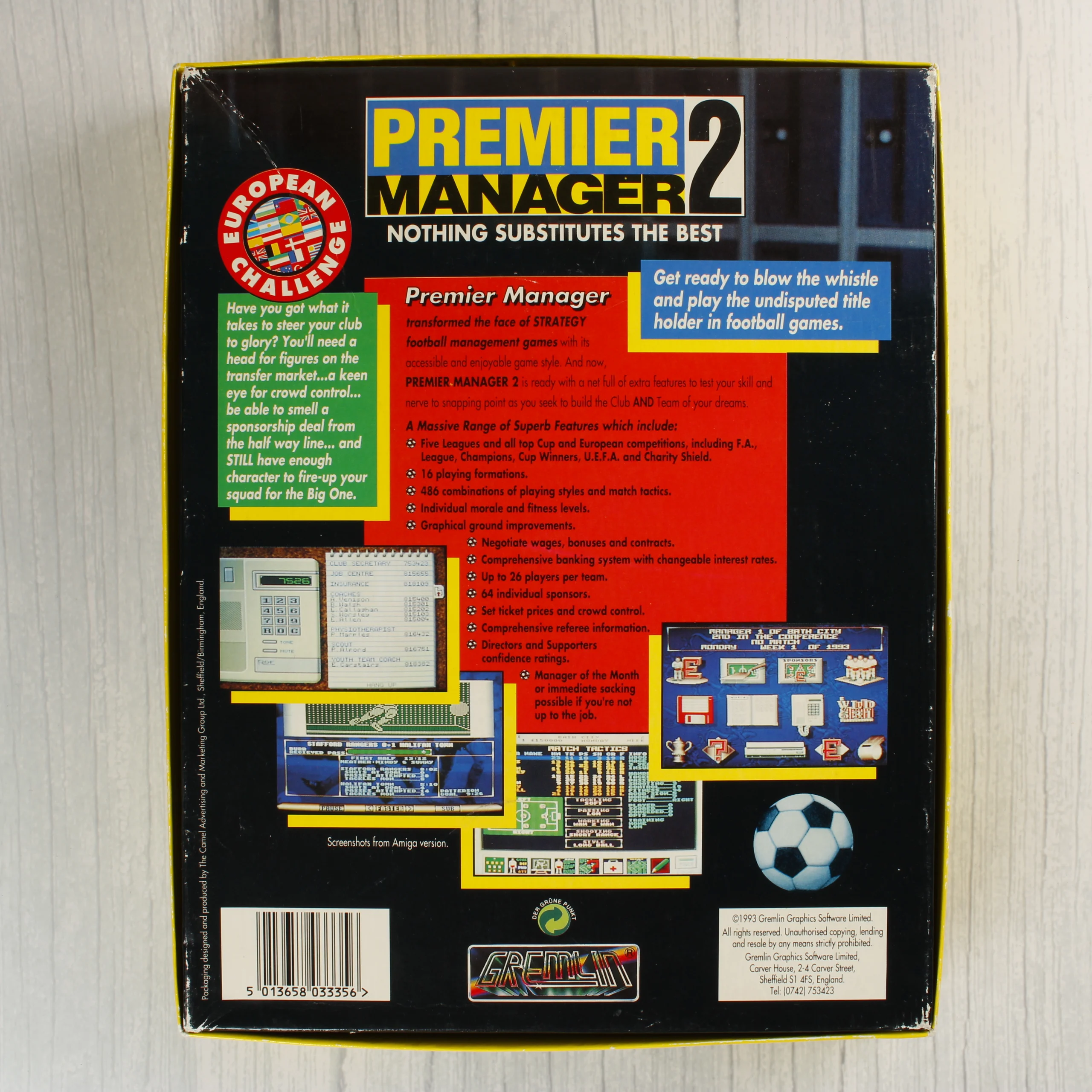 A Premier Manager 2 című videójáték Amiga platformra készült kiadása. A csomag tartalmazza az eredeti, színes illusztrációval ellátott kartondobozt, amelyen egy futballedző és csapata látható. A dobozban három darab kék színű, 3,5 colos floppy lemez található, sárga-kék címkékkel ellátva. Mellékelve van továbbá egy eredeti, színes borítójú használati útmutató és egy fekete színű, forgatható kódkerék, amely a másolásvédelemhez szükséges. A doboz hátoldalán angol nyelvű leírás és képernyőmentések láthatóak a játékból. A Gremlin Graphics által kiadott szoftver 1993-as évszámmal van jelölve.