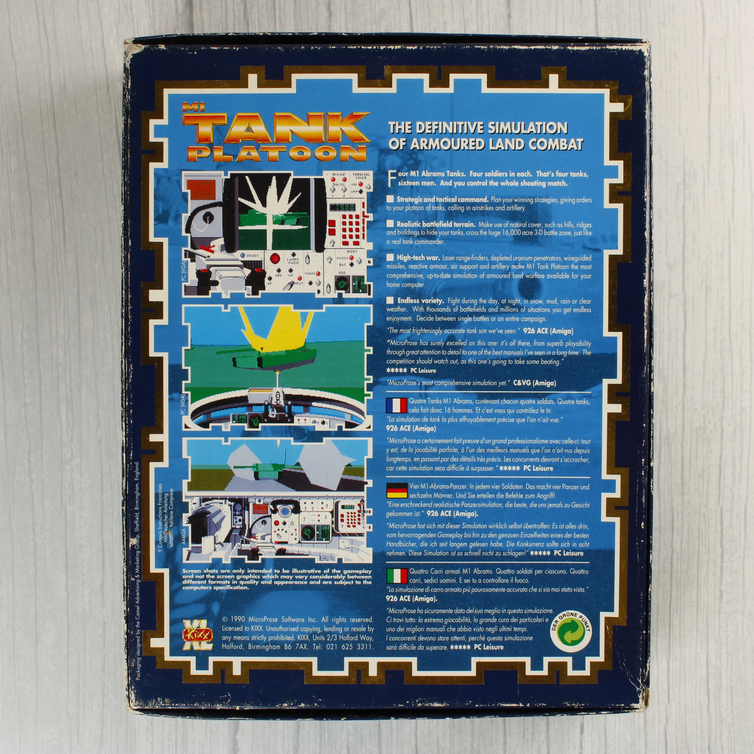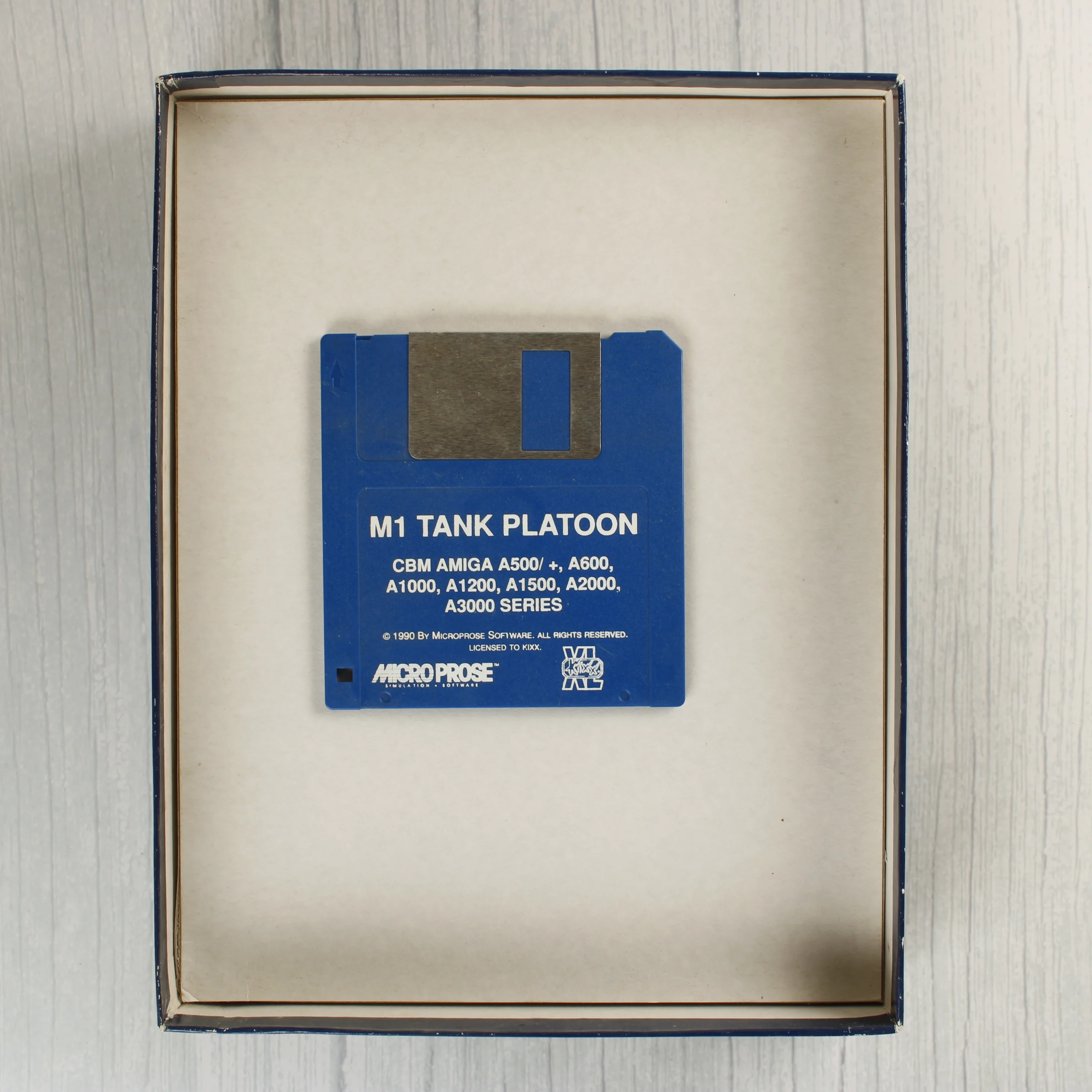 Az M1 Tank Platoon egy klasszikus harckocsi-szimulátor videójáték, amely Amiga platformra jelent meg. A csomag tartalmazza az eredeti, színes illusztrációval ellátott kartondobozt, egy fekete-fehér borítójú kézikönyvet és egy kék színű, 3,5 colos floppy lemezt. A doboz elején egy M1 Abrams harckocsi látható akció közben, a MicroProse és a Kixx XL logóival. A hátoldalon többnyelvű leírás és játékmenet-képek találhatók, amelyek bemutatják a taktikai és szimulációs elemeket. A floppy lemezen fehér felirat jelzi a kompatibilitást a különböző Amiga modellekkel (A500, A600, A1000, A1200, A1500, A2000, A3000). A kiadvány 1990-es szerzői jogi jelzéssel van ellátva. A doboz élei mentén látható némi kopás, de a grafika és a szövegek jól olvashatók maradnak.