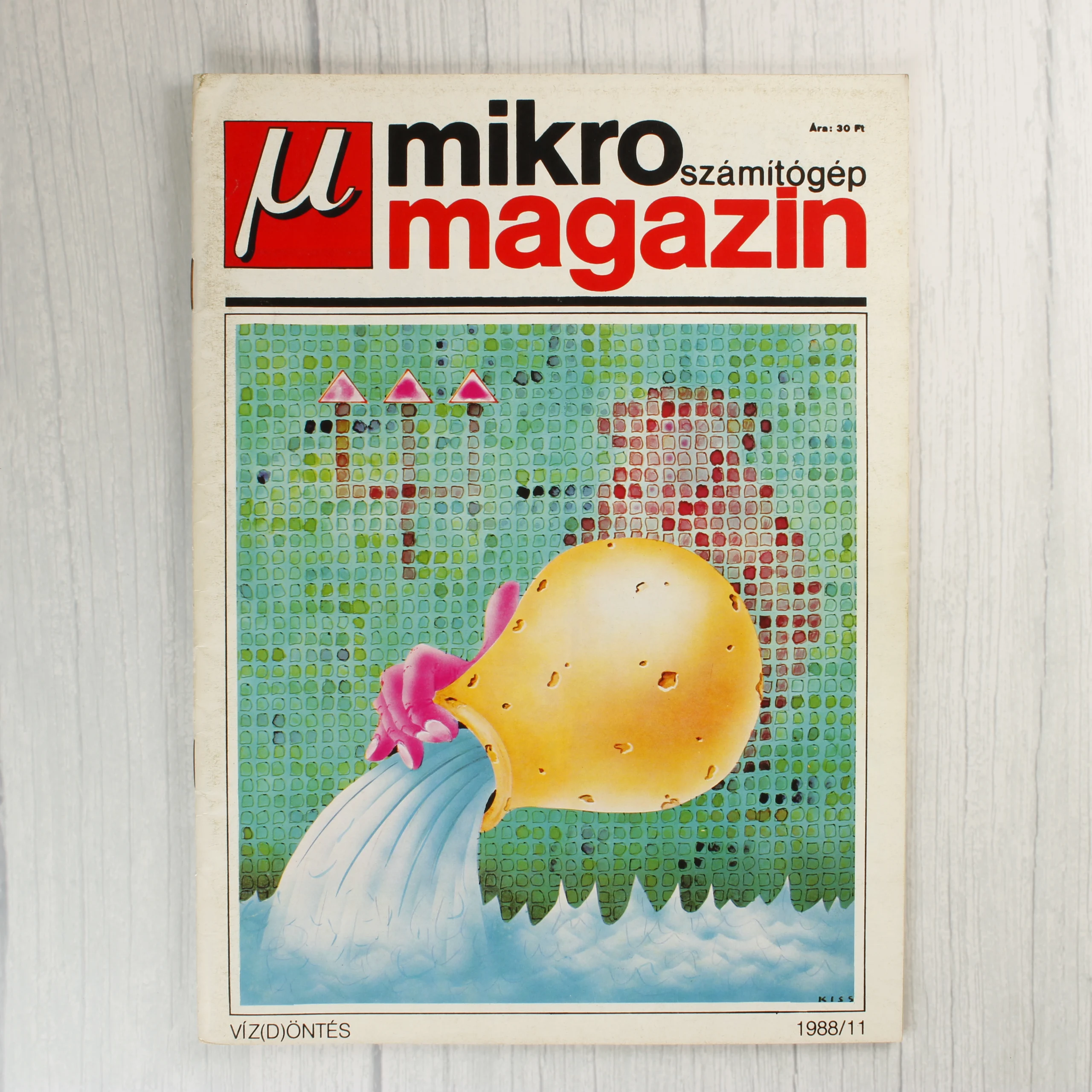 A Mikroszámítógép Magazin 1988. novemberi száma (1988/11). A címlapon egy szürrealista illusztráció látható, amely egy pixeles háttér előtt vizet öntő edényt ábrázol, alul a VÍZ(D)ÖNTÉS felirattal. A borító felső részén a jellegzetes piros-fekete logó és a 30 forintos ár szerepel. A belső oldalakon technikai jellegű cikkek találhatók, például a Mi van a cellában? című írás, amely ábrákkal és folyamatdiagramokkal szemlélteti a számítástechnikai ismereteket. A papír az idő múlásával enyhén sárgult, de a szövegek és az illusztrációk tisztán kivehetők.