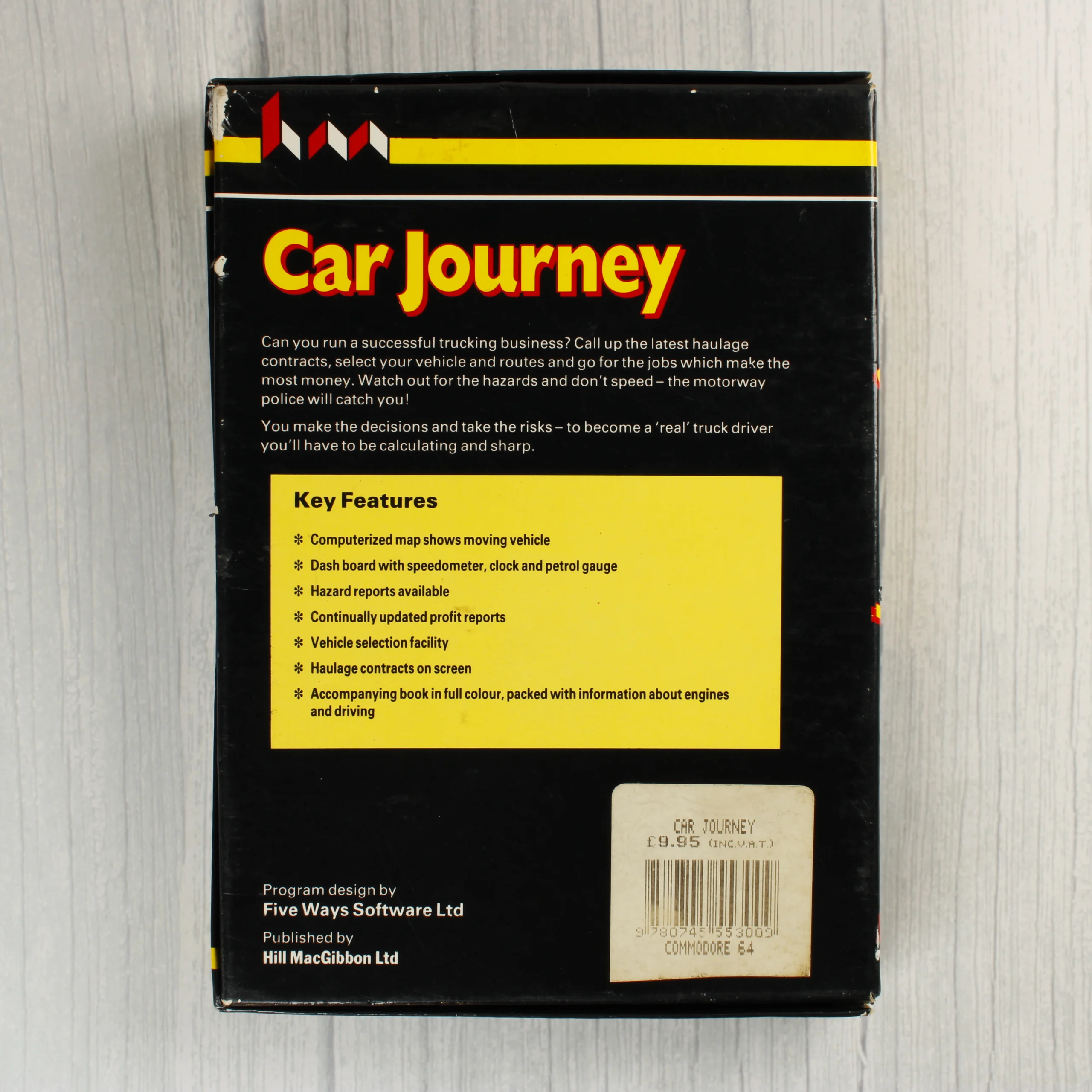 A Car Journey egy Commodore 64 platformra megjelent videójáték, amelyet a Hill MacGibbon adott ki. A csomag egy nagyméretű, illusztrált kartondobozt tartalmaz, amelynek elején egy piros sportautó és egy kék kamion látható. A doboz belsejében egy színes kézikönyv és egy fekete műanyag tálcába ágyazott magnetofonkazetta található. A kazetta kék címkével rendelkezik, amelyen a játék címe és a kiadó logója látható. A hátoldalon a játék főbb jellemzői olvashatók angol nyelven, valamint egy vonalkódos árcímke is látható. A csomagolás anyaga papír és műanyag. A grafika élénk színeket használ, a korszakra jellemző stílusban.