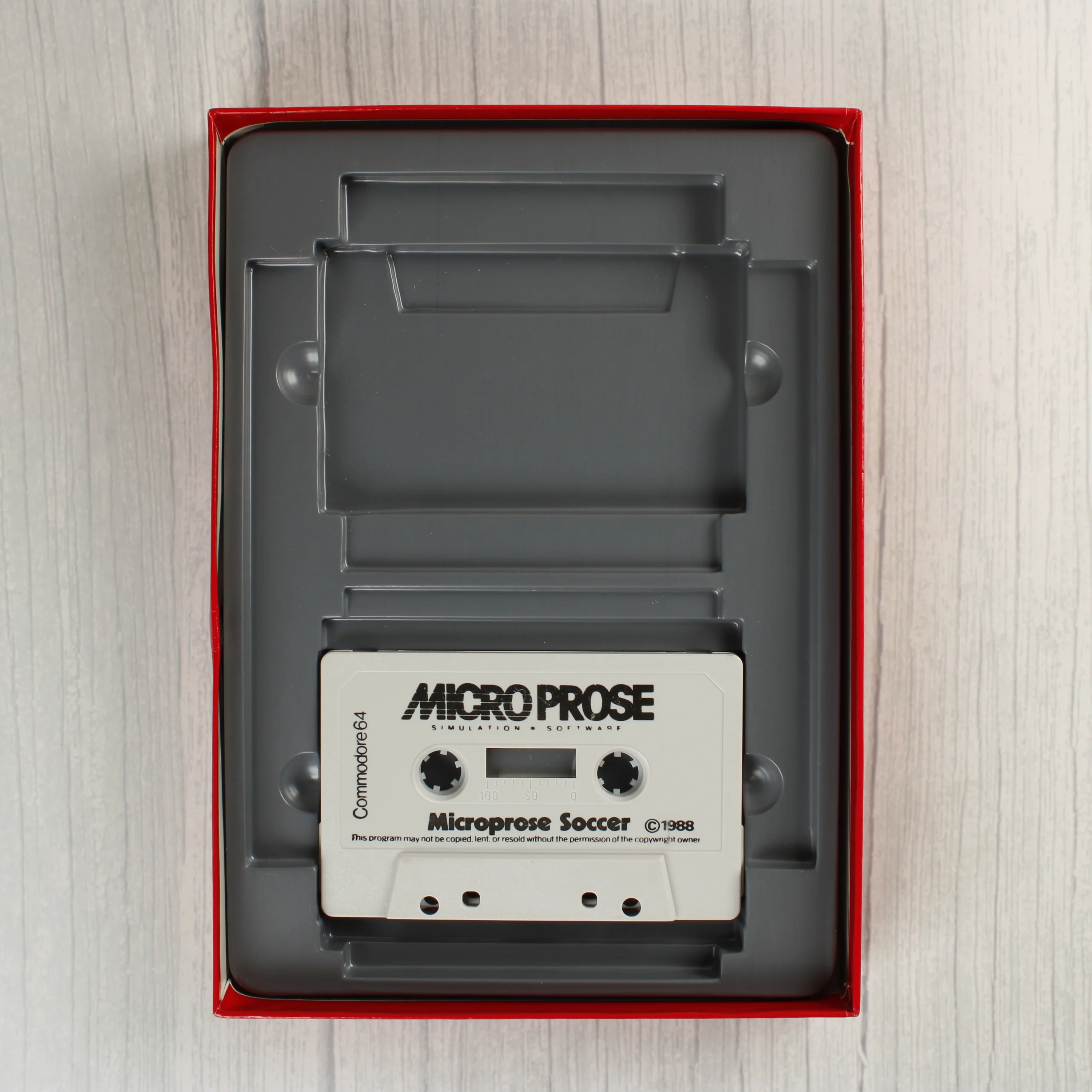 A MicroProse Soccer című videójáték Commodore 64/128 platformra készült kiadása. A csomag egy piros színű, kartonból készült dobozt tartalmaz, amelynek elején két labdarúgó látható játék közben. A doboz belsejében egy szürke műanyag tálca található, amelyben egy fehér színű magnókazetta helyezkedik el. A készlet részét képezi továbbá egy nyomtatott használati útmutató (Players Guide) és egy fekete színű, 5,25 colos floppy lemez is, amely papírtokban található. A doboz hátoldalán angol nyelvű leírás és képernyőmentések láthatóak a játékról. A csomagoláson régi árcímke és egy kék színű 'Game of the Month' matrica is megfigyelhető.