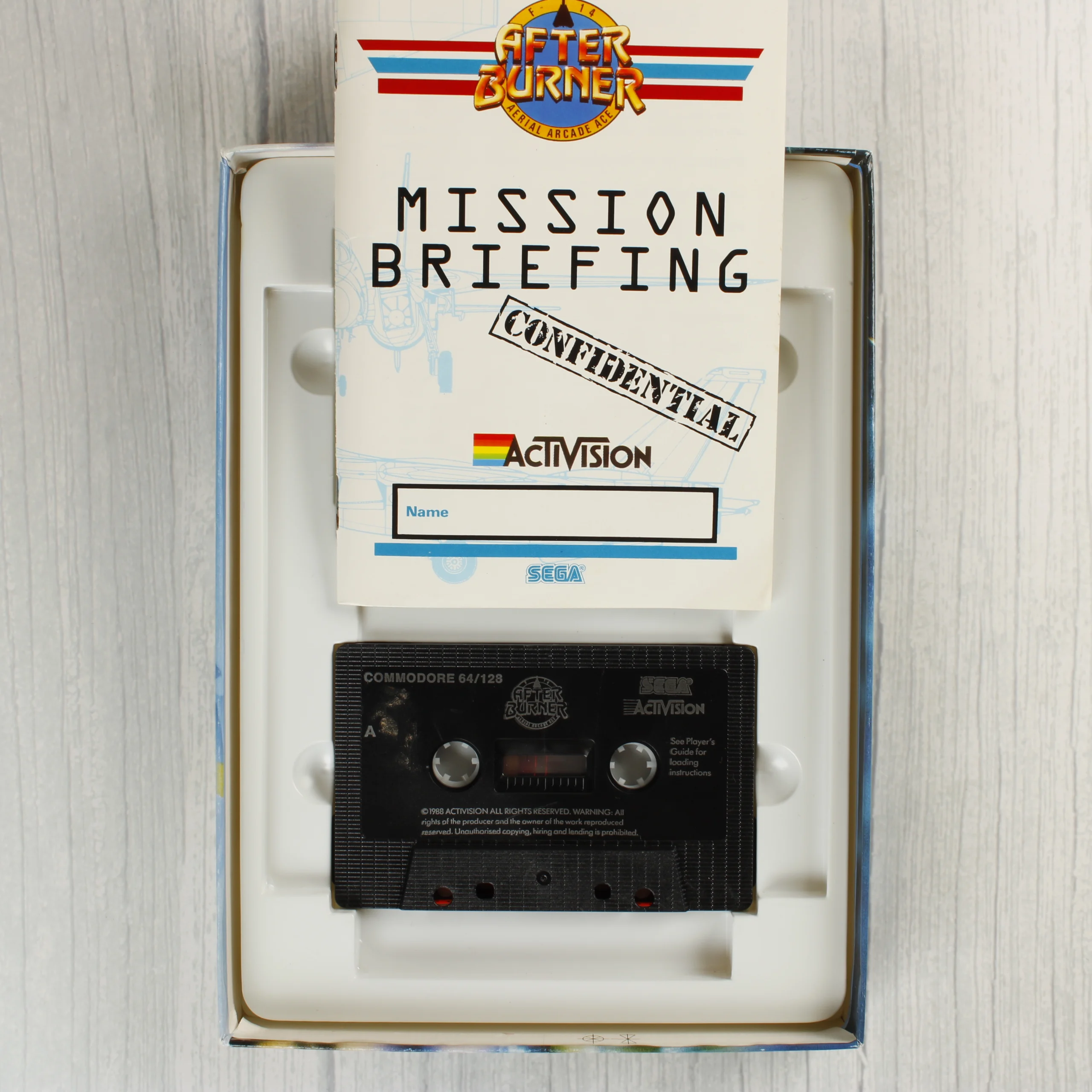 Az After Burner egy klasszikus légi harci videójáték Commodore 64/128 platformra. A csomag tartalmazza az eredeti színes kartondobozt, amelyen vadászgépek és egy repülőgép-hordozó látható. A doboz belsejében egy fehér műanyag tálca található, amelyben egy fekete színű kazetta és egy többnyelvű használati útmutató kapott helyet. A kazetta felirata szerint a játékot az Activision adta ki a Sega licencével 1988-ban. A doboz elején egy régi árcédula maradványa látható. A csomagolás grafikája dinamikus, repülőgépes jeleneteket ábrázol kék és sárga színek dominanciájával.