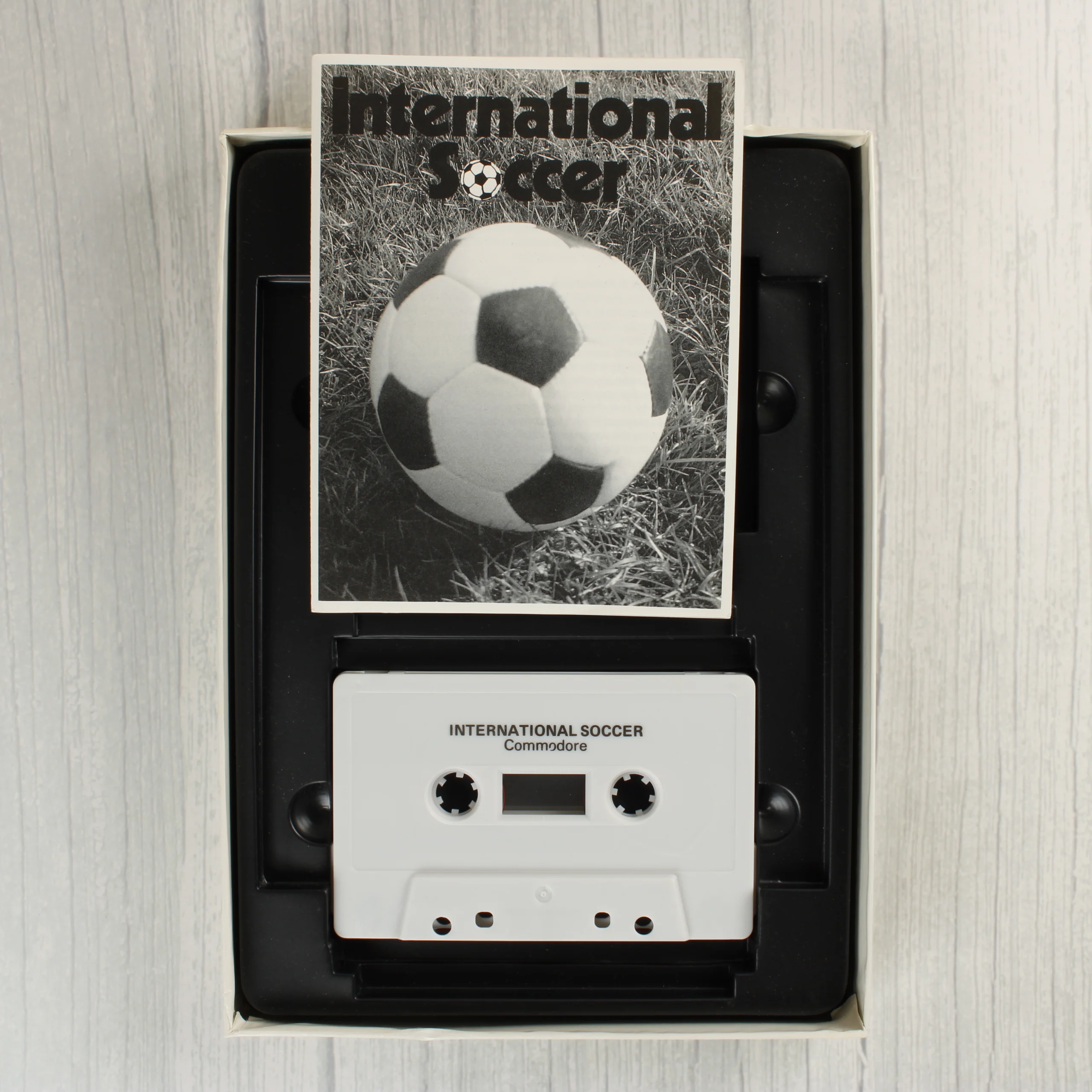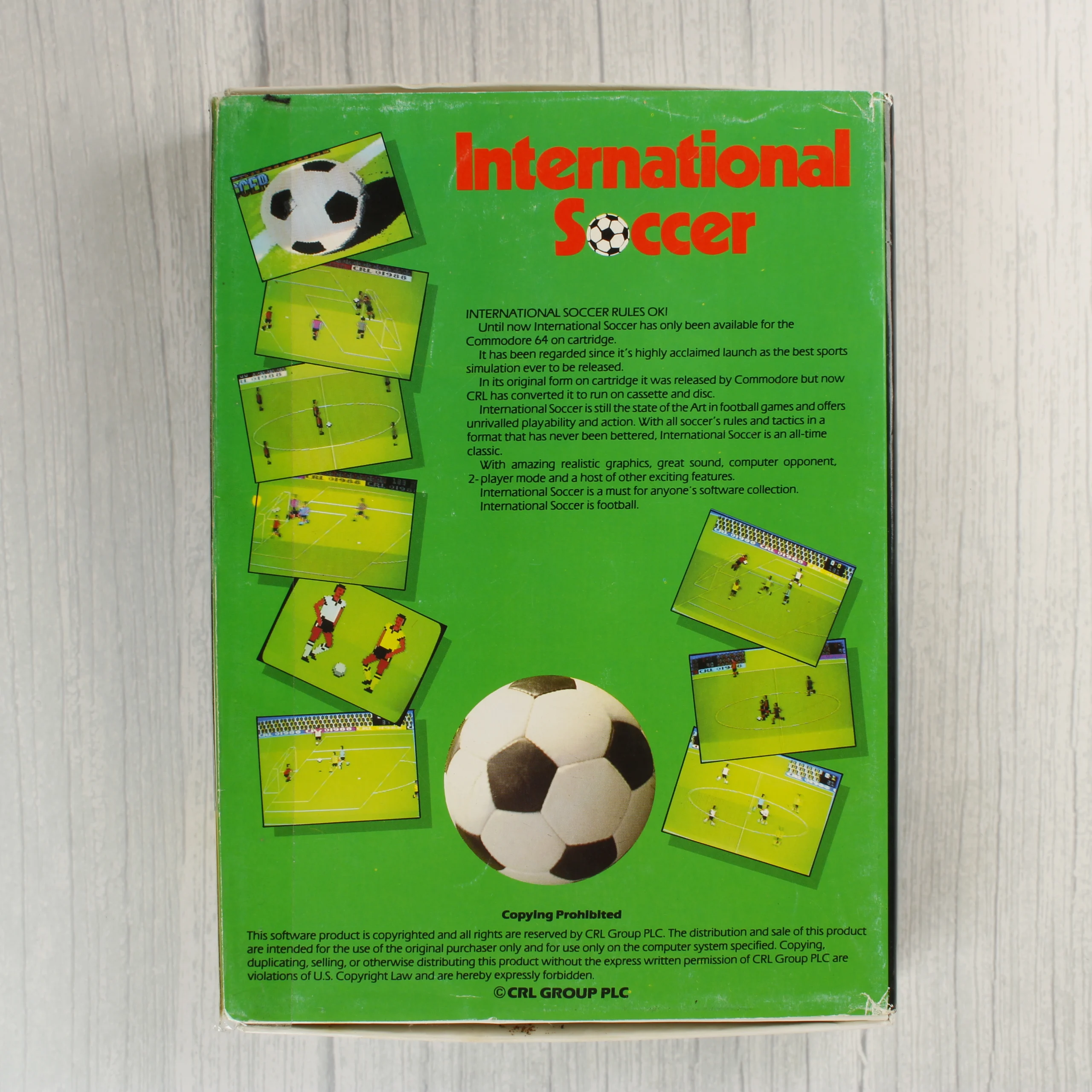 Az International Soccer egy klasszikus sport szimulációs videójáték Commodore 64 és 128 rendszerekre. A csomag tartalmazza az eredeti kartondobozt, amelynek elején egy fűben lévő futballabda látható, a CRL logóval és a sárga CBM 64/128 felirattal. A doboz hátoldalán zöld háttér előtt játékmenet-képernyőképek és angol nyelvű leírás olvasható. A készlet része egy fehér színű kazetta, amelyen fekete felirattal szerepel a játék címe és a platform megnevezése. Mellékelve van továbbá egy fekete-fehér nyomtatású használati útmutató vagy füzet, amely az előlapi grafikát ismétli meg. A hordozó és a dokumentáció egy fekete műanyag belső tálcában helyezkedik el a külső papírdobozon belül.