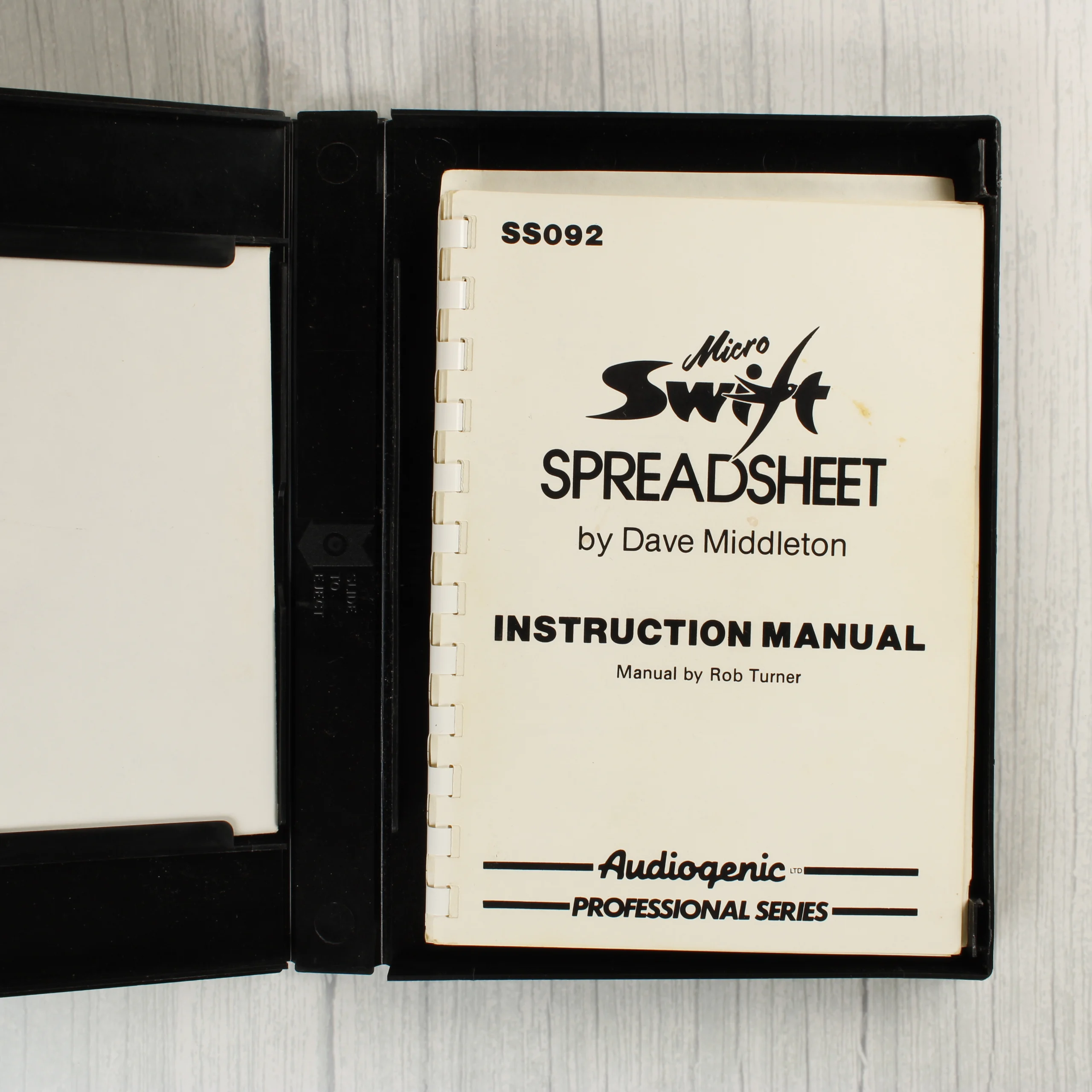A Swift Spreadsheet egy professzionális táblázatkezelő szoftver Commodore 128 és Commodore 64 számítógépekhez. A csomag egy fekete műanyag tokban található, amely tartalmazza az 5,25 colos floppy lemezt és egy spirálkötésű használati útmutatót. A borítón egy öltönyös férfi látható grafikonok és pénzügyi kulcsszavak előtt. A szoftvert az Audiogenic Software Ltd. adta ki 1985-ben. A tok hátoldalán részletes termékleírás, rendszerkövetelmények és egy vonalkód látható. A belső részben a floppy lemez egy fehér papírtokban pihen, alatta pedig a Rob Turner által írt kézikönyv található. A kiadvány a Professional Series sorozat része.