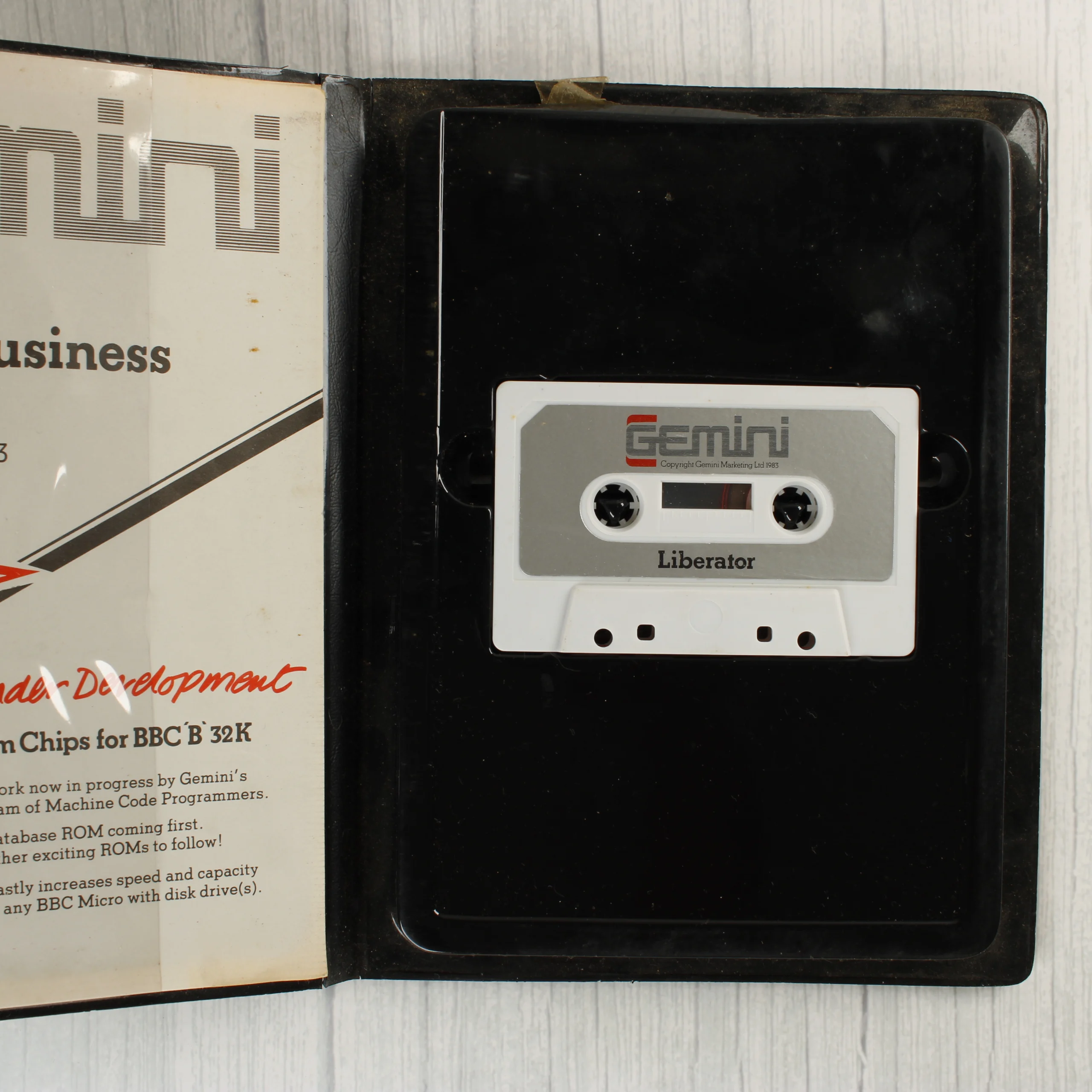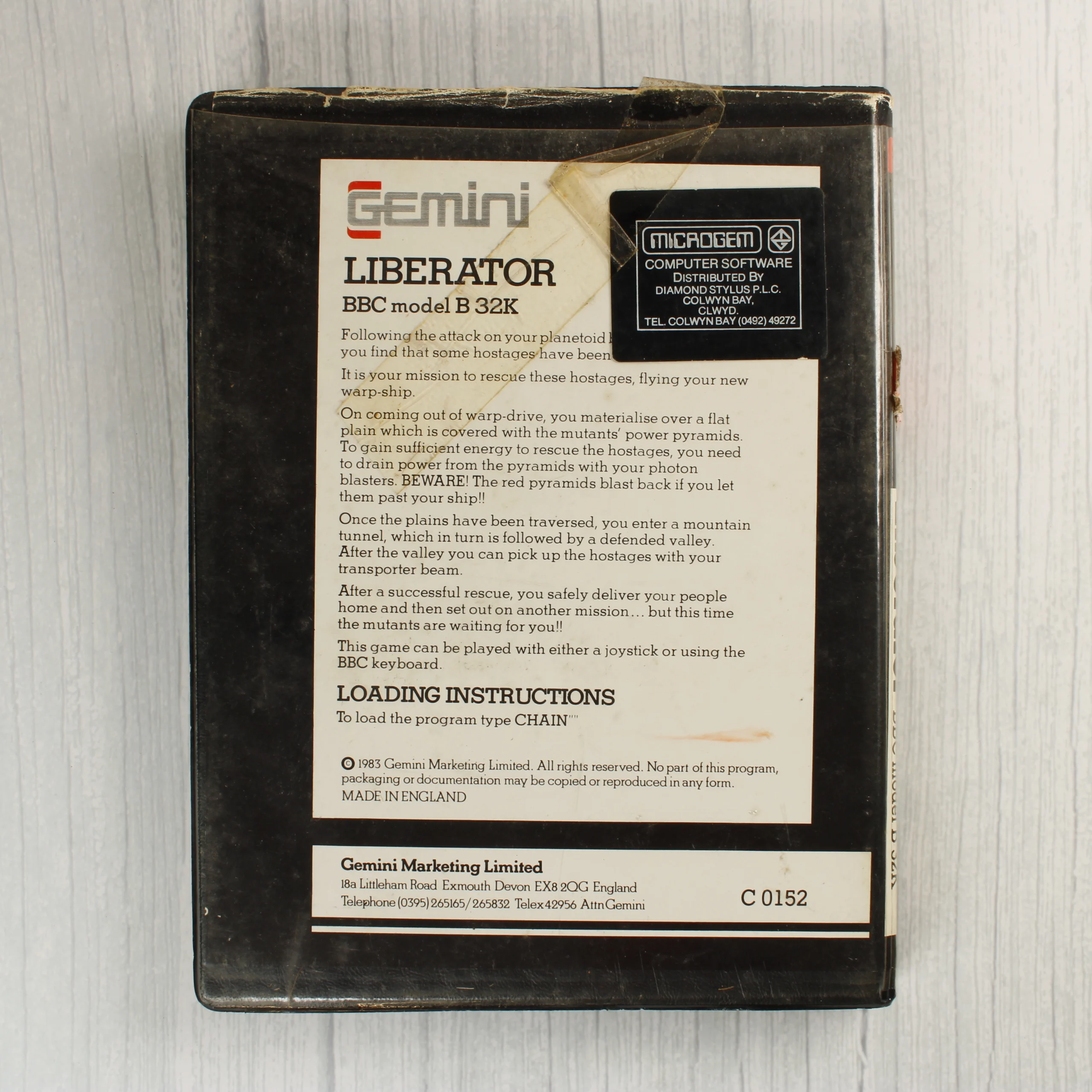 A Gemini Leisure Software által kiadott Liberator című videójáték BBC Model B 32K számítógépre. A termék egy fekete színű, műanyag borítású tokban található, amelynek előlapján színes, sci-fi tematikájú illusztráció látható egy számítógép előtt ülő apával és fiával, valamint űrhajókkal és fantasztikus lényekkel. A hátoldalon a játék leírása, betöltési útmutatója és a kiadó adatai szerepelnek. A tok belsejében egy fehér színű, szürke címkés magnókazetta helyezkedik el egy fekete műanyag tálcában. A csomagoláson látható a Microgem forgalmazói matrica is. A papírborítón és a műanyag tokon használatból eredő kopások, gyűrődések és kisebb szakadások figyelhetők meg, különösen a széleken és a sarkokon.