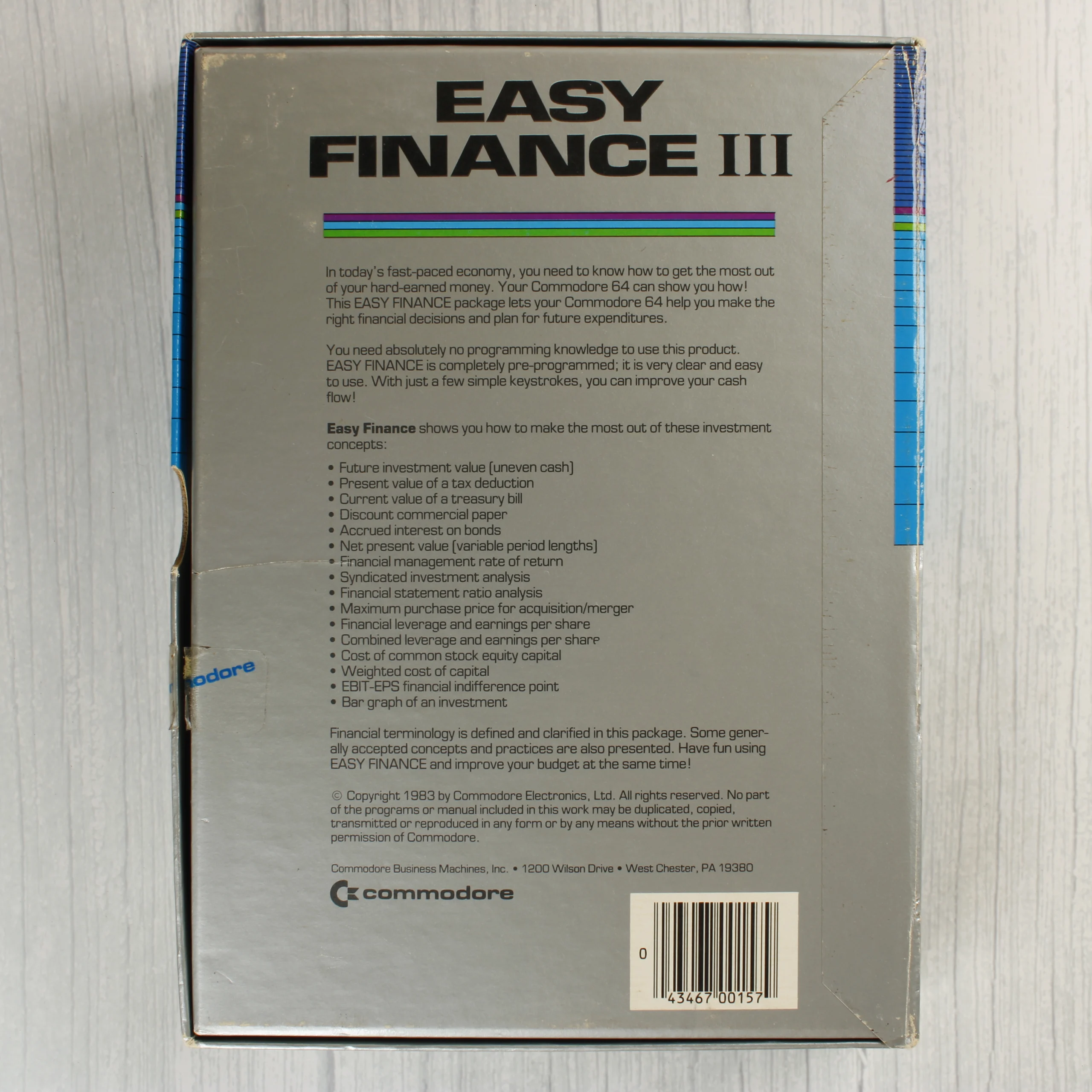 A Commodore 64 számítógéphez készült Easy Finance III pénzügyi szoftver eredeti dobozos kiadása. A csomag tartalmazza az 5,25 colos floppy lemezt, amely egy fehér, kék és piros csíkozású Commodore papírtokban helyezkedik el a fekete műanyag belső tálcában. A külső kartondoboz ezüst és kék alapszínű, előlapján színes illusztráció látható, amely üzleti és gazdasági életképeket ábrázol. A doboz hátoldalán a program funkcióinak részletes leírása és a vonalkód olvasható. A szoftver használatához Commodore 1541 lemezmeghajtó szükséges. A termék az 1980-as évekből származó eredeti szoftvercsomag.