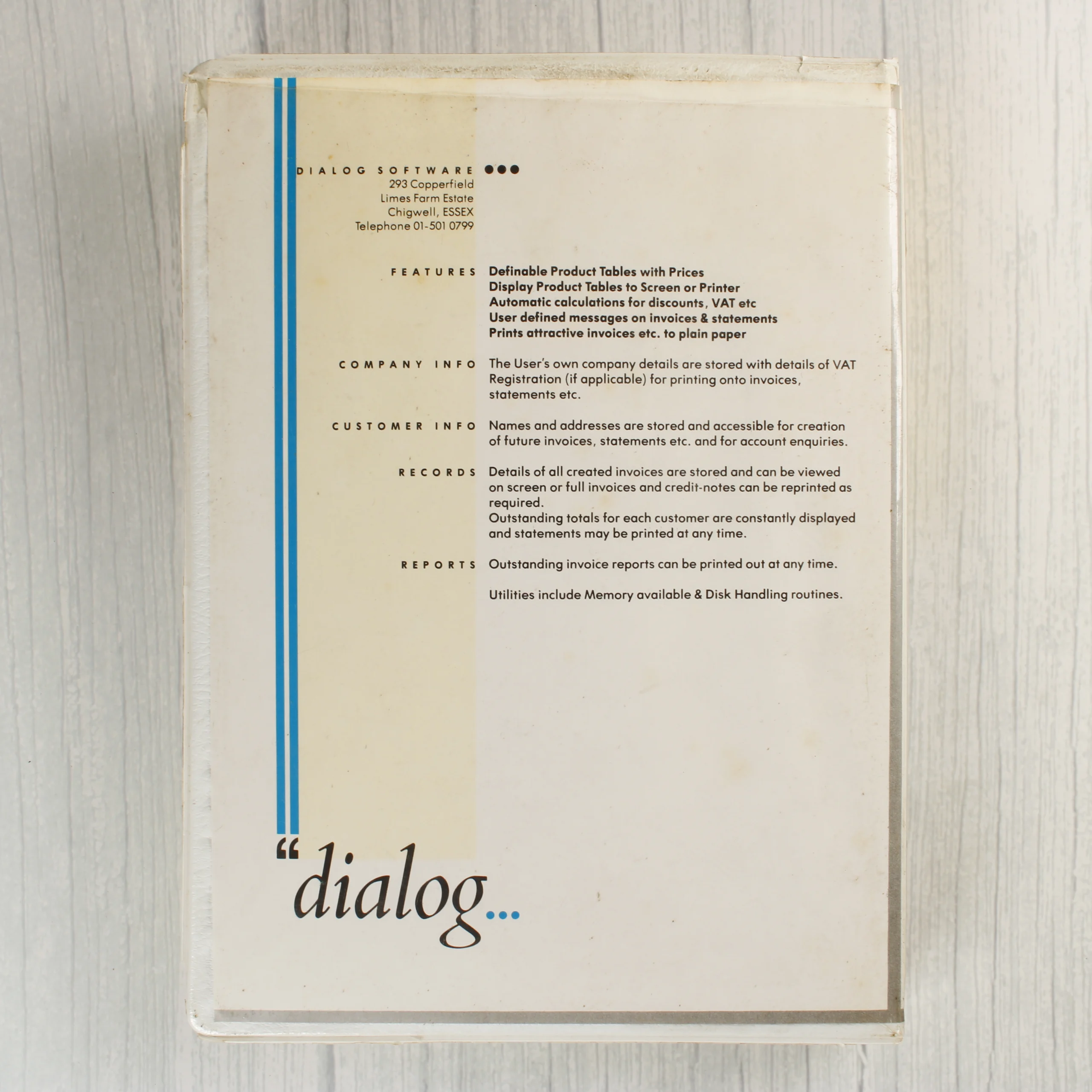 A Dialog Software által kiadott Invostat számlázó és kimutatáskészítő szoftver Commodore 64 számítógéphez. A csomag egy fehér színű, műanyagból készült, nagyméretű tokban található, amelyen sárga és kék grafikai elemek láthatók. A tok elején egy narancssárga matrica jelzi a kazettás verziót. A belső részben egy fekete színű, fehér címkés szoftverkazetta helyezkedik el, rajta a program nevével és az 1983-as évszámmal. A csomag tartalmaz továbbá egy PC Format magazinhoz tartozó, 1992. márciusi kiadású, 3,5 colos floppy lemezt is, amelyre kézzel írt feliratok kerültek. A műanyag tok és a papírborító láthatóan elszíneződött, sárgult az idő múlásával, a széleken kisebb kopások és gyűrődések tapasztalhatók.