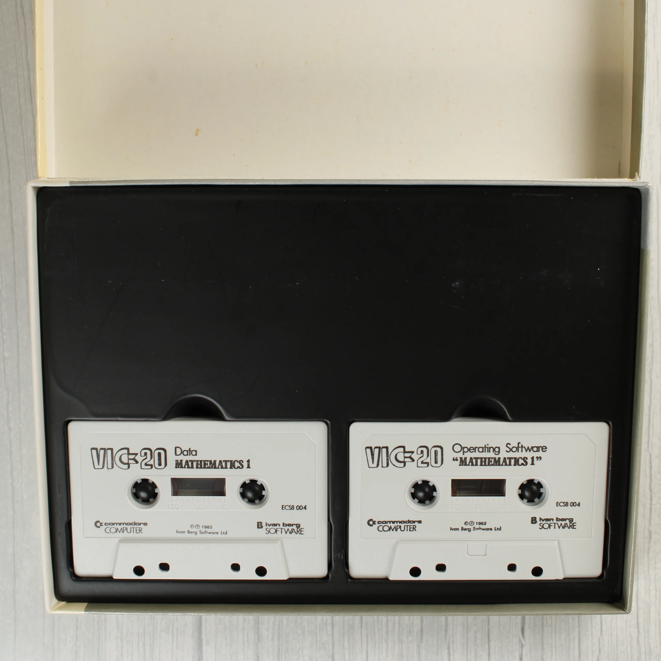 A Commodore VIC-20 számítógéphez készült Mathematics 1 oktatószoftver eredeti dobozos kiadása. A csomag két darab fehér színű magnókazettát tartalmaz, amelyek egy fekete műanyag tálcában helyezkednek el a kartondobozon belül. Az egyik kazetta az operációs szoftvert, a másik az adatokat tartalmazza. A doboz elején színes VIC-20 logó, egy számítógépet használó személyt ábrázoló illusztráció és a szoftver címe látható. A hátoldalon angol nyelvű leírás olvasható a programról és a rendszerkövetelményekről. A kiadvány az Ivan Berg Software és a Commodore Computer együttműködésében jelent meg 1982-ben. A doboz élei mentén enyhe kopás és sárgulás tapasztalható, de a szerkezete ép.