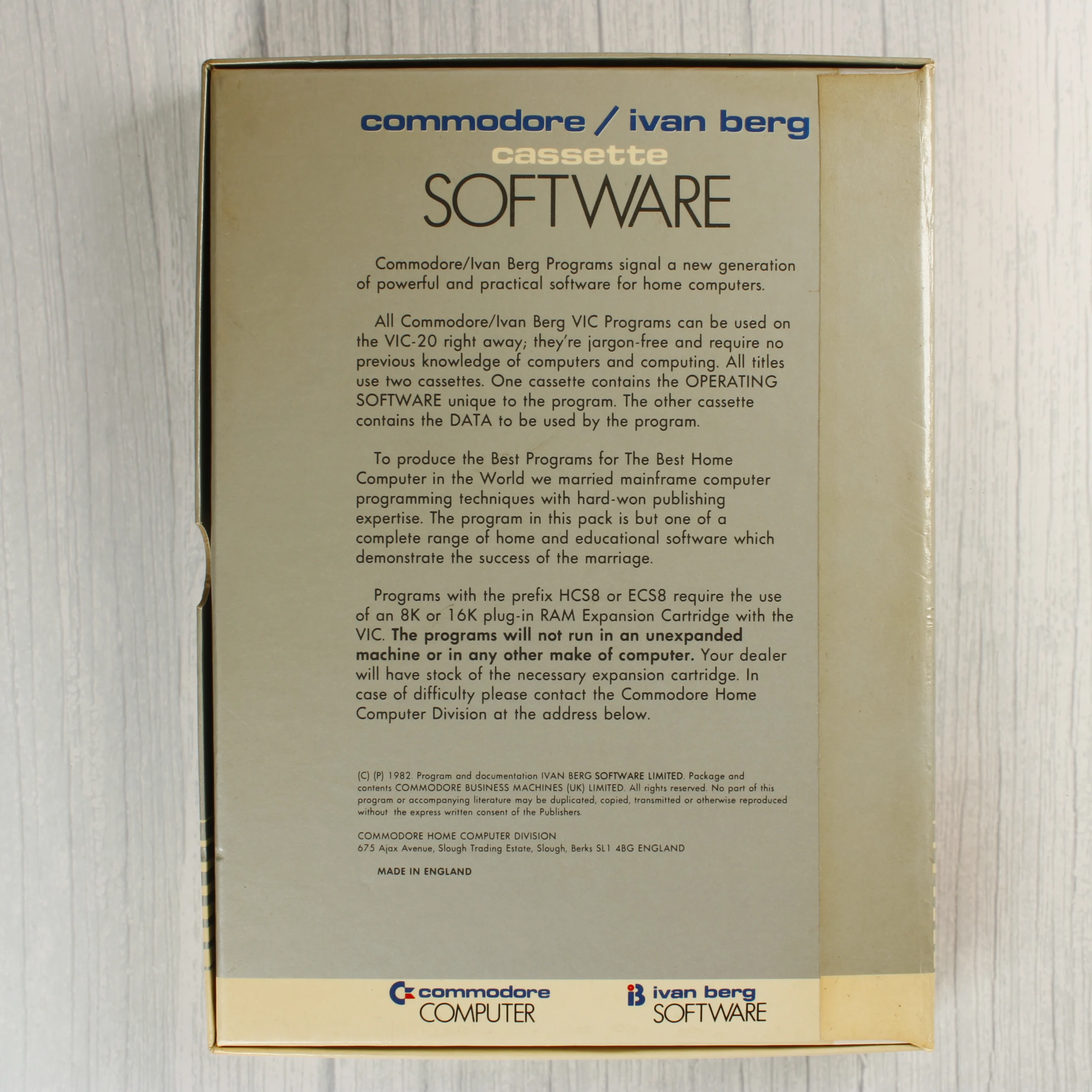 A Commodore VIC-20 otthoni számítógéphez készült BBC Mastermind videójáték szoftvercsomagja. A készlet egy nagyméretű, szürke alapszínű kartondobozban található, amelynek előlapján a televíziós vetélkedőre utaló ikonikus fekete szék látható. A csomag két darab magnókazettát tartalmaz, amelyek egy fekete műanyag tálcában kaptak helyet. Az egyik kazetta az operációs szoftvert, a másik pedig az általános műveltségi adatokat tartalmazza. A doboz hátoldalán részletes angol nyelvű leírás olvasható a program használatáról és a szükséges memóriabővítésről. A termék az Ivan Berg Software és a Commodore együttműködésében jelent meg 1982-ben. A doboz élei és sarkai enyhén kopottak, a felületen kisebb elszíneződések és használati nyomok láthatóak, de a szerkezeti állapota ép.