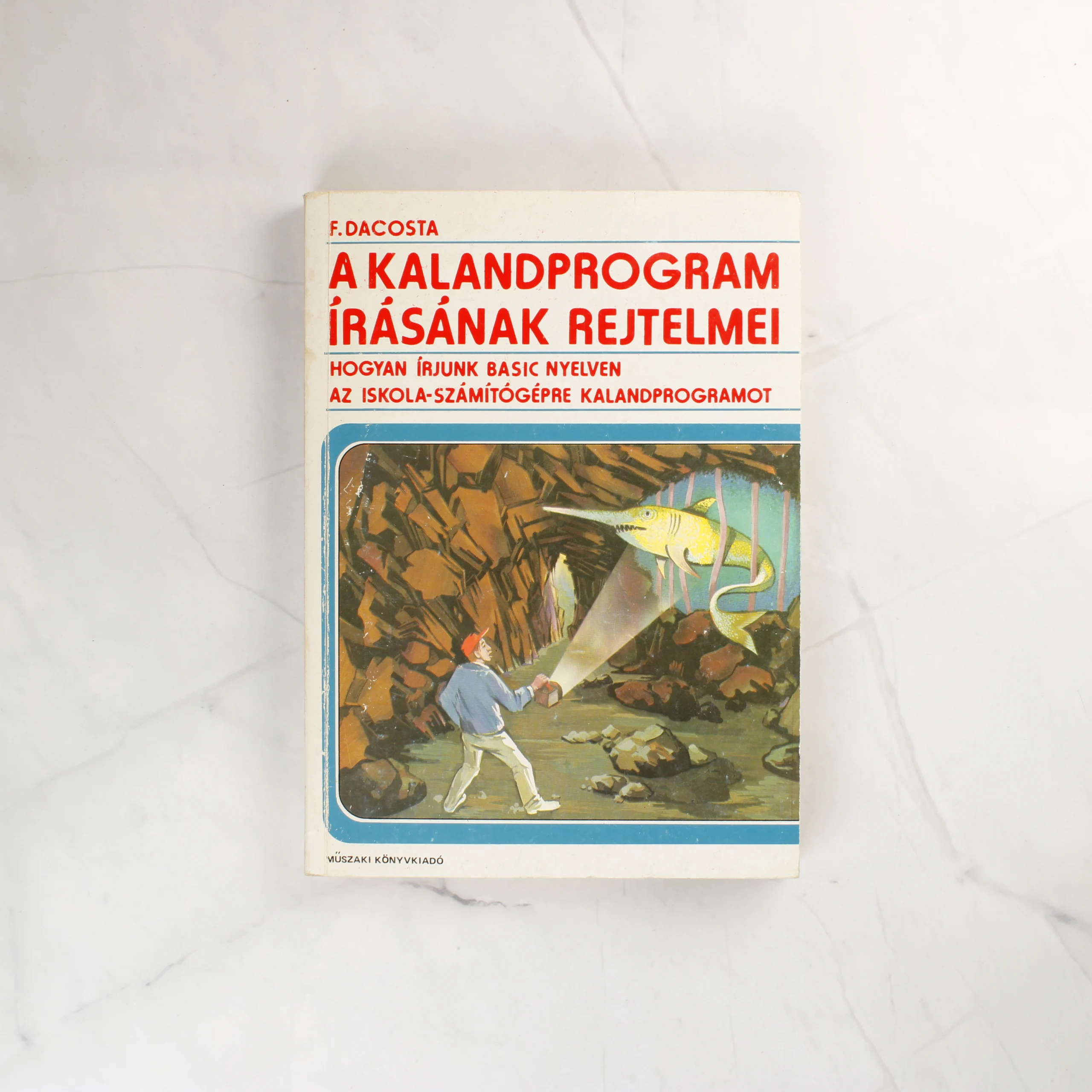 F. DaCosta A kalandprogram írásának rejtelmei című könyve a Műszaki Könyvkiadó gondozásában jelent meg. A puhafedeles kötet borítóján egy barlangban lámpával világító alak és egy rács mögötti kardhal látható. A fehér alapszínű borítón piros és kék feliratok olvashatók. A könyv a BASIC nyelven történő programozást mutatja be az iskola-számítógépek kontextusában. A belső oldalakon a tartalomjegyzék és a kiadói adatok láthatók, a papír enyhén sárgult. A borító élei mentén minimális kopás és használati nyom észlelhető, de a kötet egyben van és tiszta.