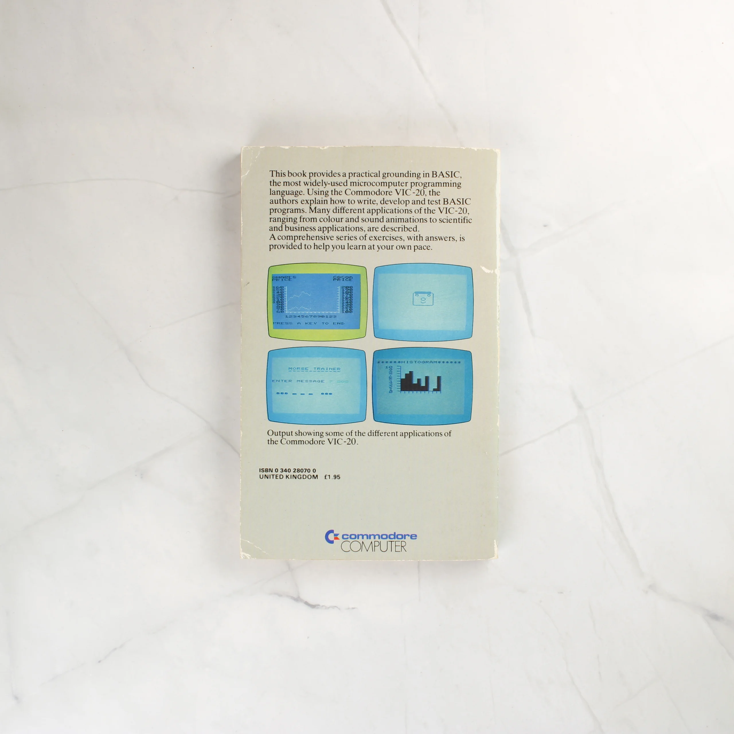 Ez a puhafedeles szakkönyv a Commodore VIC-20 számítógép programozásának alapjait mutatja be. Az előlapon egy család látható a készülék használata közben, felette kék és piros feliratokkal a cím és a szerzők nevei olvashatók. A hátoldalon a BASIC nyelvvel kapcsolatos rövid leírás, négy darab képernyőmentés a szoftveres alkalmazásokról, valamint a Commodore Computer logója szerepel. A borító anyaga papír, amelyen az idő múlásával járó enyhe sárgulás és a széleken apróbb kopások figyelhetők meg. A könyv gerince ép, a kötés stabilnak tűnik. A hátlapon az eredeti brit árfeltüntetés és az ISBN azonosító is látható.