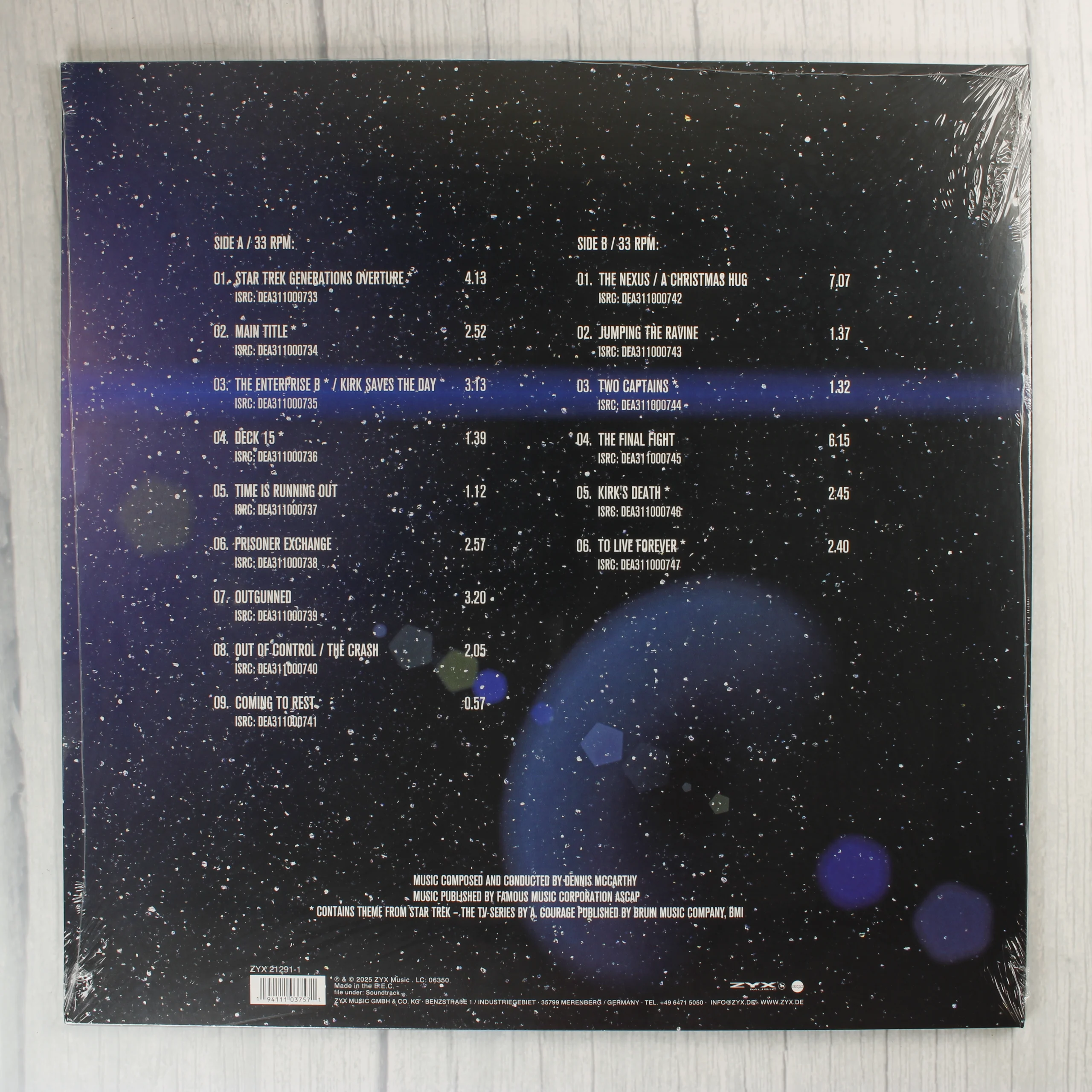 A Star Trek Generations című mozifilm eredeti filmzenéjét tartalmazó bakelit lemez. A borítón Jean-Luc Picard kapitány és James T. Kirk kapitány arcképe látható, valamint az Enterprise csillaghajó. A kiadvány különlegessége a Limited Coloured Vinyl jelzés, ami színes hanglemezre utal. A zeneszerző Dennis McCarthy. A hátsó borítón a számlista olvasható, amely két oldalon összesen 15 zeneművet tartalmaz. A termék gyári védőfóliában van, a sarkok épek, a csomagolás sértetlennek tűnik. A kiadó a GNP Crescendo Records és a ZYX Music. A borító grafikája űrbéli jelenetet ábrázol kék és fekete tónusokkal.