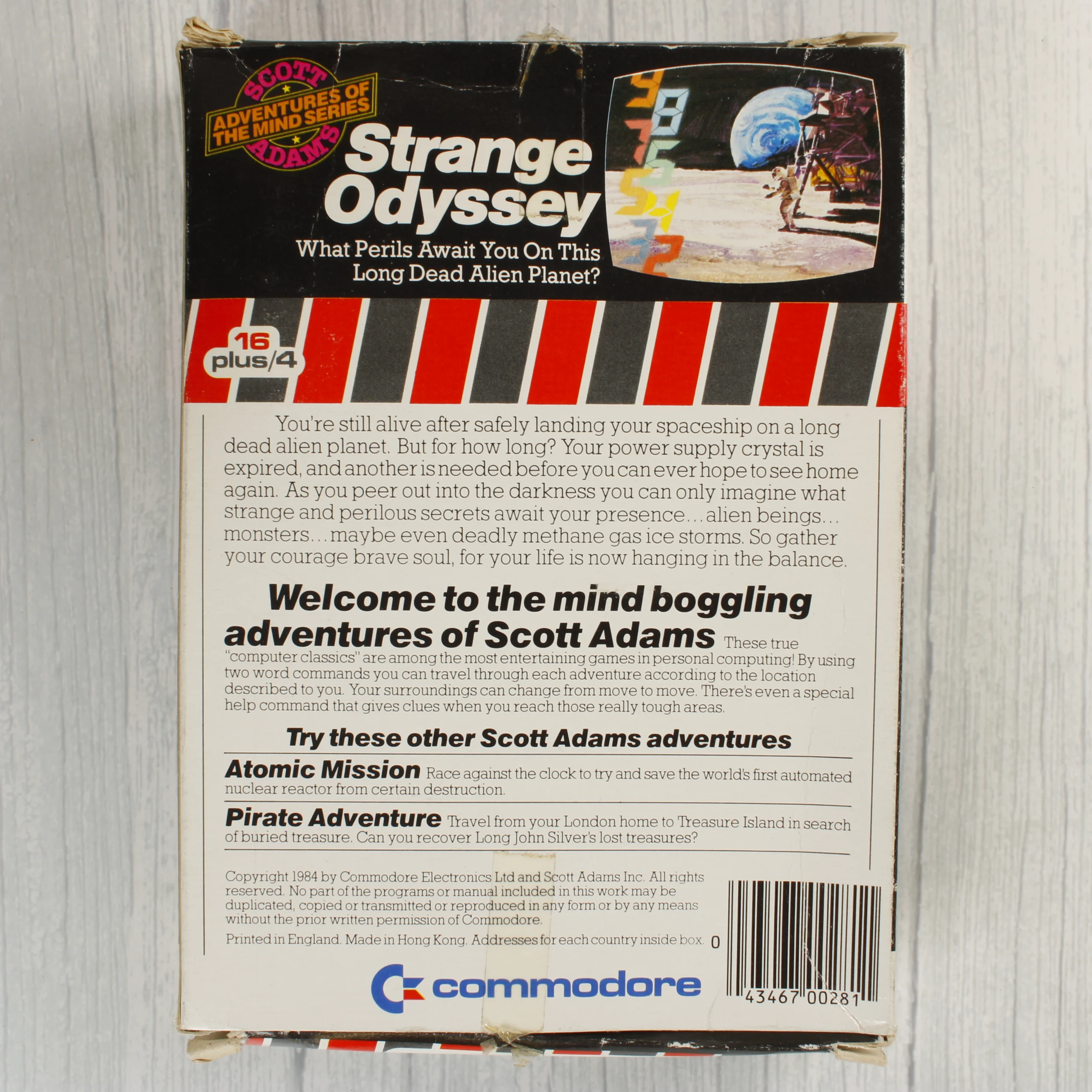 A Commodore 16 és Plus/4 számítógépekhez készült Strange Odyssey videójáték eredeti papírdobozos kiadása. A csomag tartalmazza a fekete műanyag házas szoftver cartridge-et is. A doboz elején színes illusztráció látható, amely egy űrhajóst és egy idegen bolygó felszínét ábrázolja, felette a Scott Adams' Adventures of the Mind Series logóval. A hátoldalon angol nyelvű leírás olvasható a játék történetéről és a játékmenetről, valamint feltüntették a Commodore Electronics Ltd. 1984-es szerzői jogi adatait. A cartridge címkéjén kézzel írt felirat és a Commodore 16 and Plus/4 megjelölés szerepel egy színes sáv kíséretében.