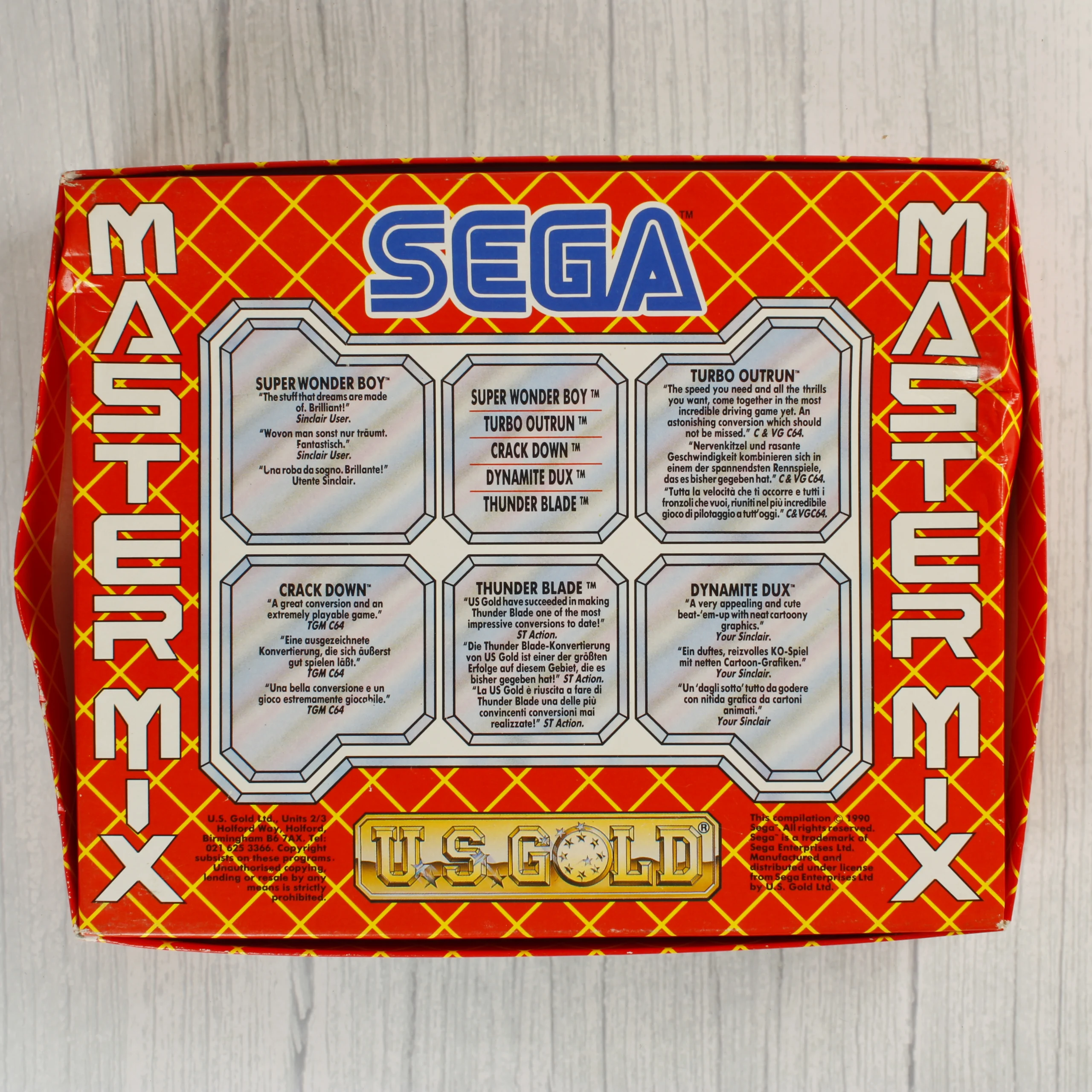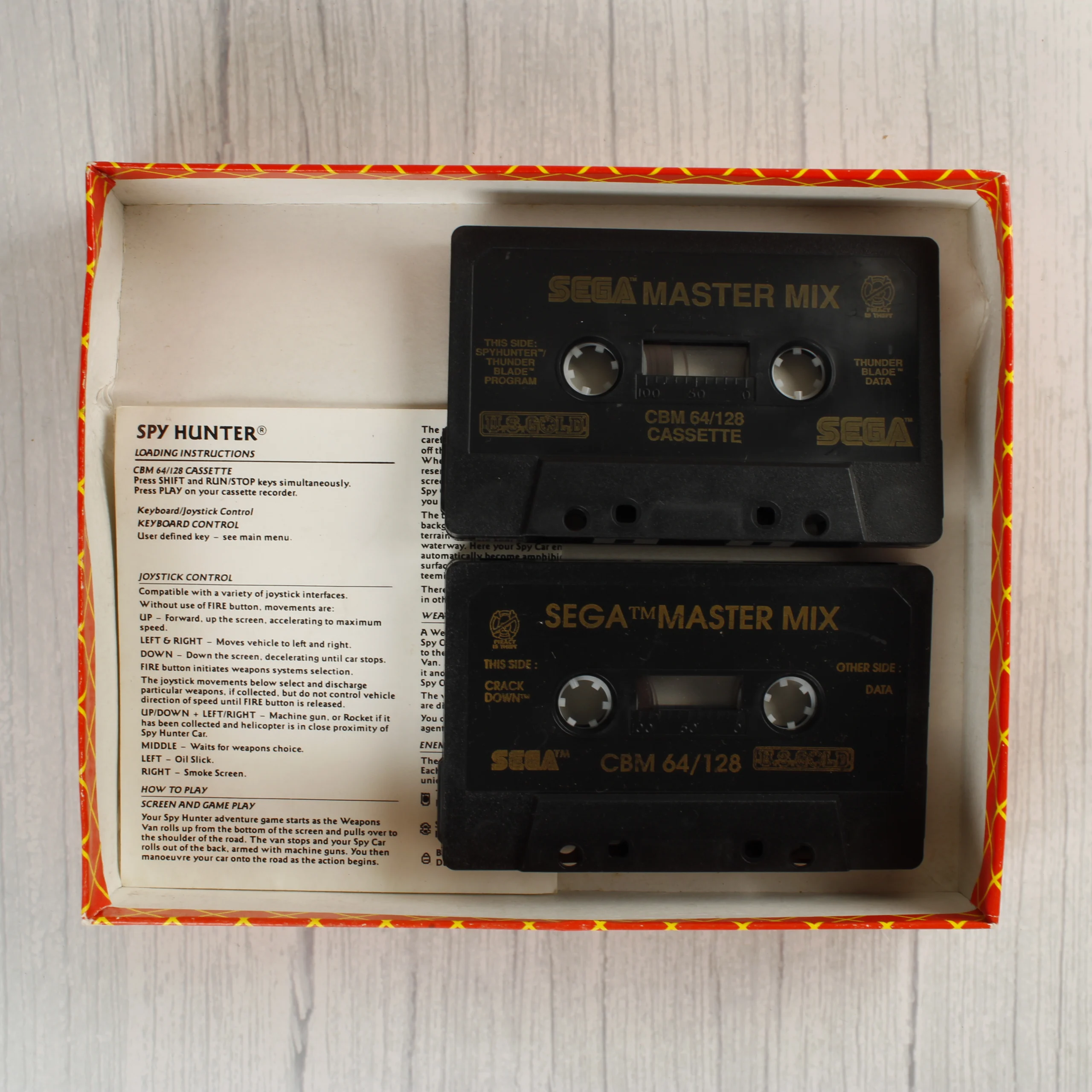 A Sega Master Mix egy videójáték-válogatás Commodore 64/128 platformra, amelyet az U.S. Gold adott ki. A csomag egy piros alapszínű, sárga rácsmintás kartondobozban található, amelyen a válogatásban szereplő játékok illusztrációi láthatók, mint például a Super Wonder Boy, Turbo Outrun és Crack Down. A dobozon egy piros matrica jelzi, hogy a Dynamite Dux játékot a Spy Hunter váltotta fel. A készlet két darab fekete színű magnókazettát tartalmaz, amelyeken aranyozott feliratok jelölik a tartalmat és a gyártót. A csomaghoz tartozik egy fekete-fehér nyomtatású használati útmutató is, amely a Spy Hunter játék irányítását és betöltési folyamatát részletezi. A doboz élei mentén enyhe kopás és használati nyomok láthatók, de a grafika és a szövegek jól olvashatóak maradnak.