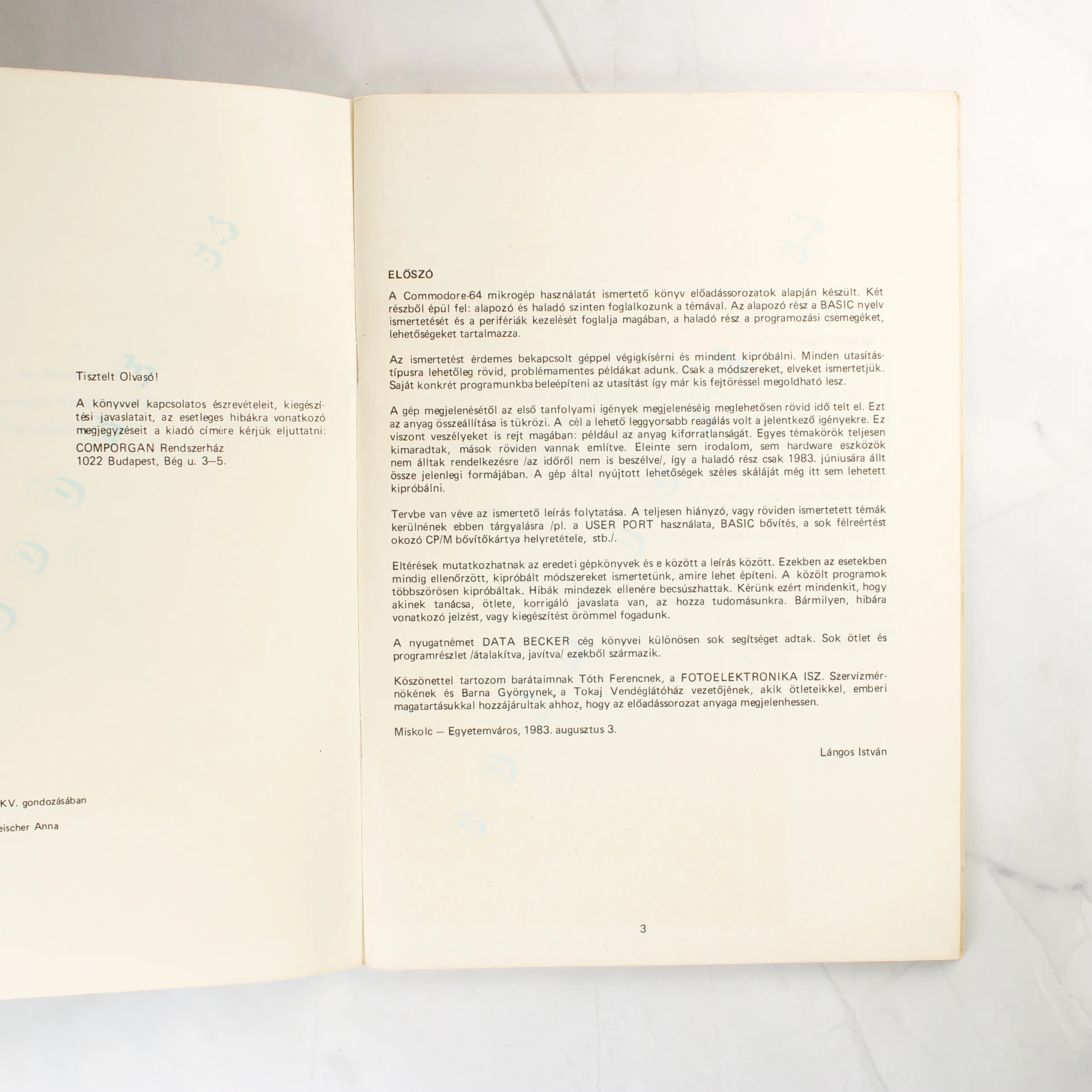 Lángos István: A Commodore 64 mikrogép kezelése és programozása című szakkönyve. A puhafedeles kiadvány borítója kék alapszínű, felső részén narancssárga és fehér négyzetekből álló absztrakt grafika látható. A könyv a COMPORGAN Rendszerház gondozásában jelent meg. A belső oldalakon látható szöveg szerint a kézirat 1983-ban készült. A borítón és a gerinc mentén enyhe használati nyomok, kopások és apróbb gyűrődések figyelhetők meg. A papír az idő múlásával enyhén sárgult, de a szöveg és a grafika tisztán kivehető.
