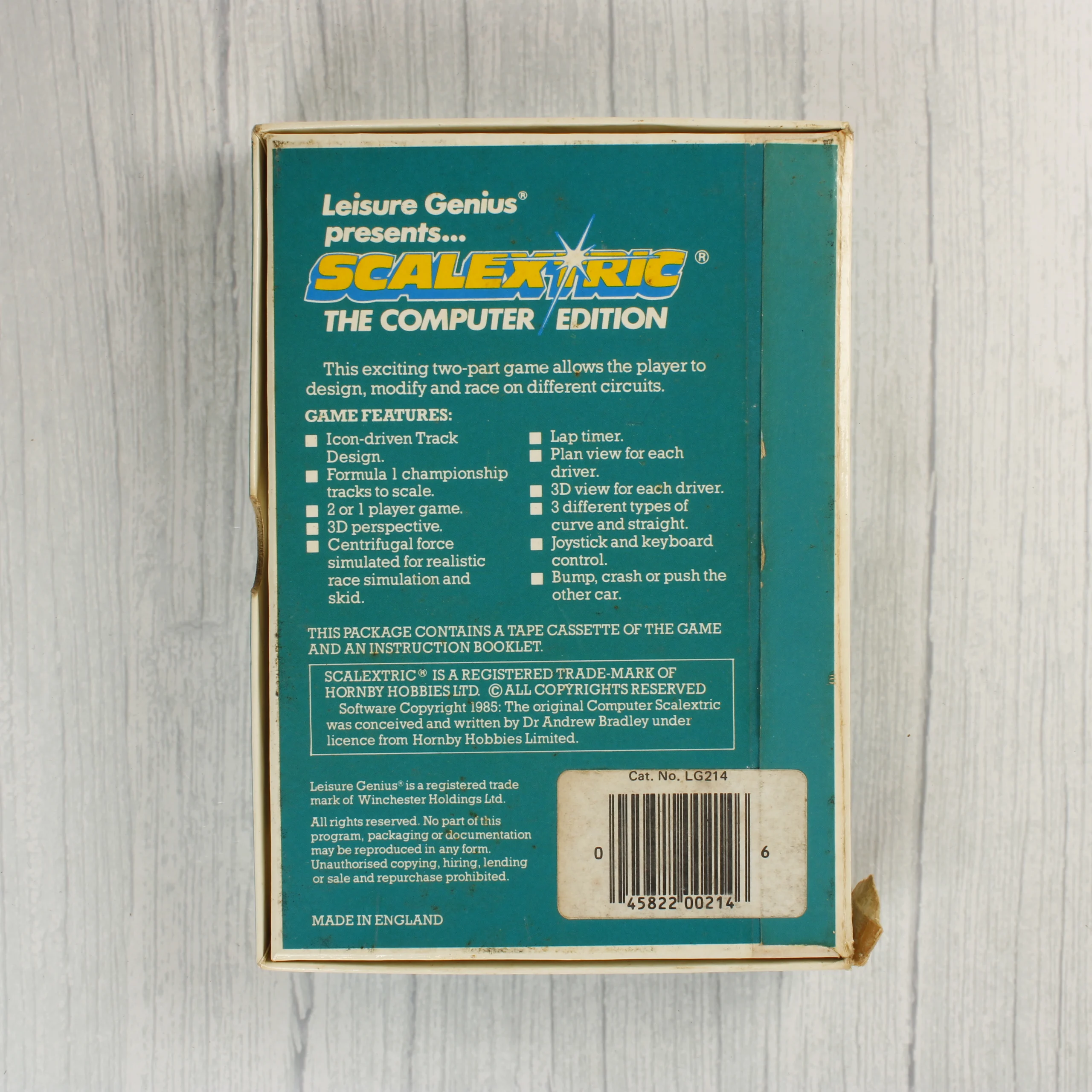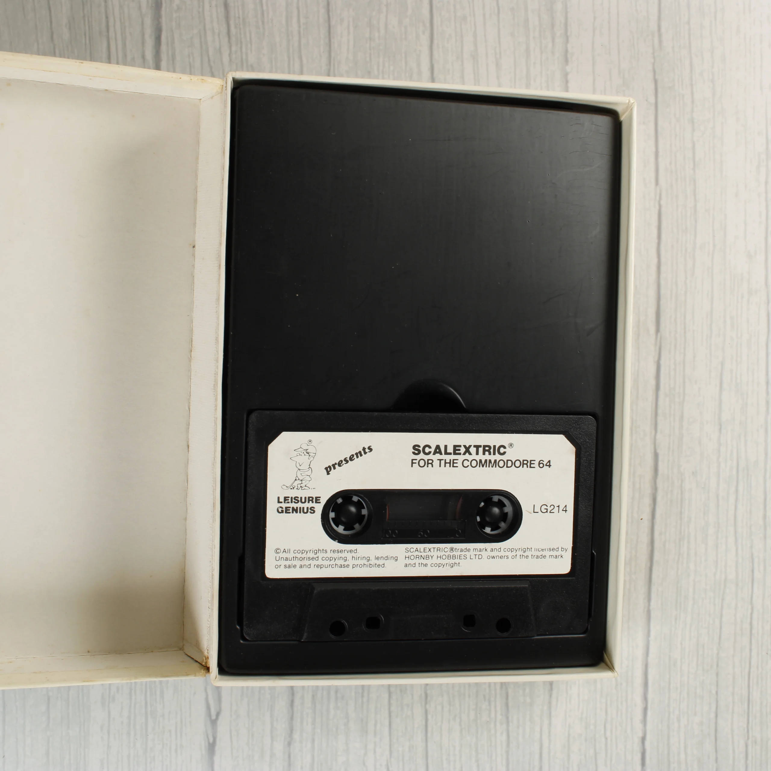 A Scalextric: The Computer Edition videójáték Commodore 64 platformra készült kiadása. A csomagolás egy illusztrált kartondobozt tartalmaz, amelyen Forma-1-es versenyautók láthatók a versenypályán. A doboz hátoldalán a játék jellemzői és a vonalkód olvasható. A készlet része egy fekete műanyag tokban elhelyezett magnetofonkazetta, amelyen fehér címke található a játék címével és a Leisure Genius logójával. A doboz élei mentén kopások és kisebb sérülések láthatók, különösen az egyik alsó saroknál, ahol a karton jelentősebben megnyomódott és beszakadt. A kazetta és a belső műanyag tartó jó állapotúnak tűnik, felületi karcok előfordulhatnak.