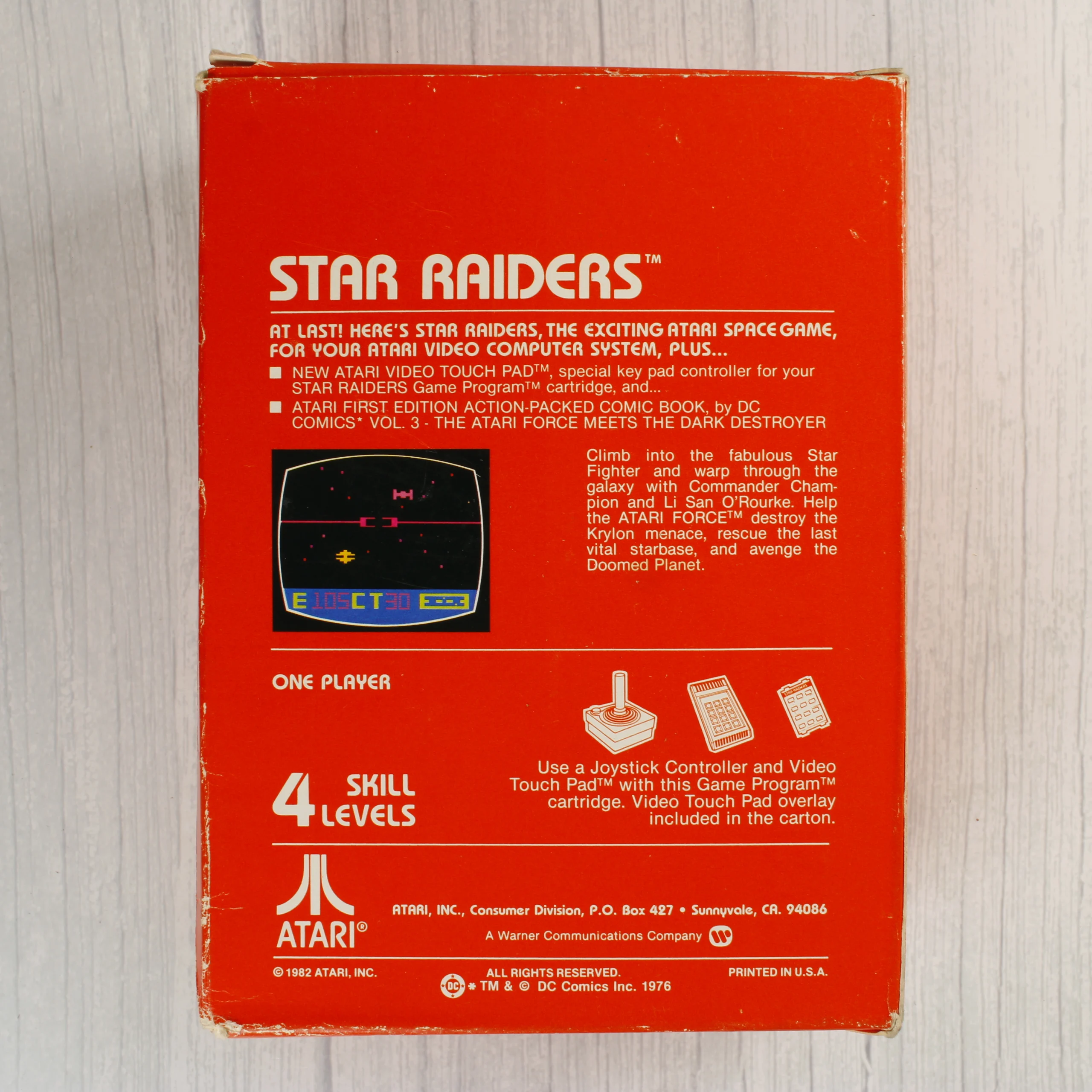 Az Atari Video Computer System konzolhoz készült Star Raiders videójáték dobozos kiadása, amely tartalmazza a Video Touch Pad vezérlőt is. A csomagolás egy élénkvörös kartondoboz, amelyen a játék illusztrációja látható: egy űrhajó pilótafülkéje és egy robbanás az űrben. A doboz felirata szerint a csomag része egy DC Comics által készített képregény is. A mellékelt Video Touch Pad egy fekete színű, numerikus gombokkal ellátott kiegészítő vezérlő, amely kábellel csatlakozik a géphez. A doboz hátoldalán angol nyelvű leírás, játékmenet-fotó és a szükséges irányítók ábrái láthatóak. A termék az 1982-es évből származik, az Atari Inc. gyártmánya.