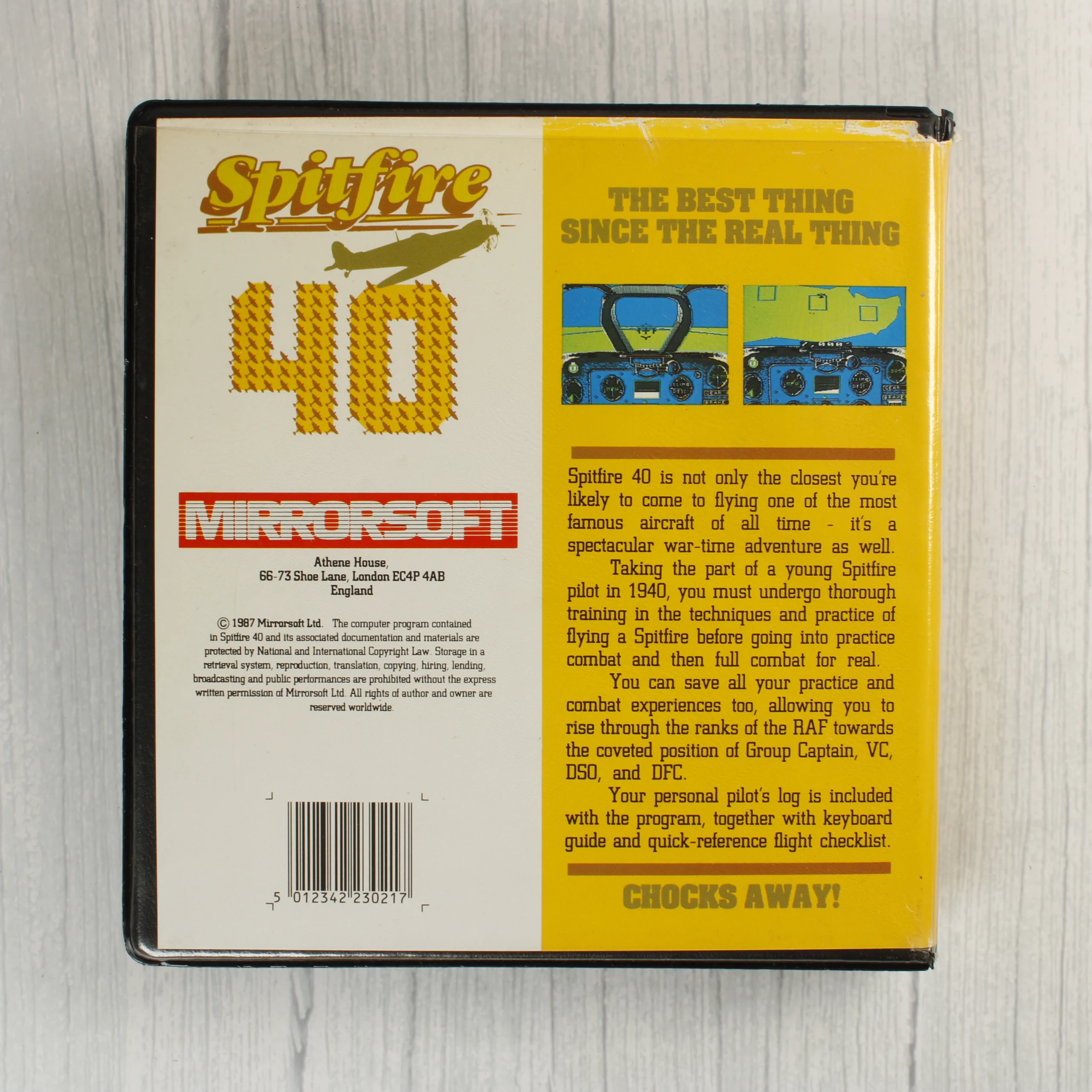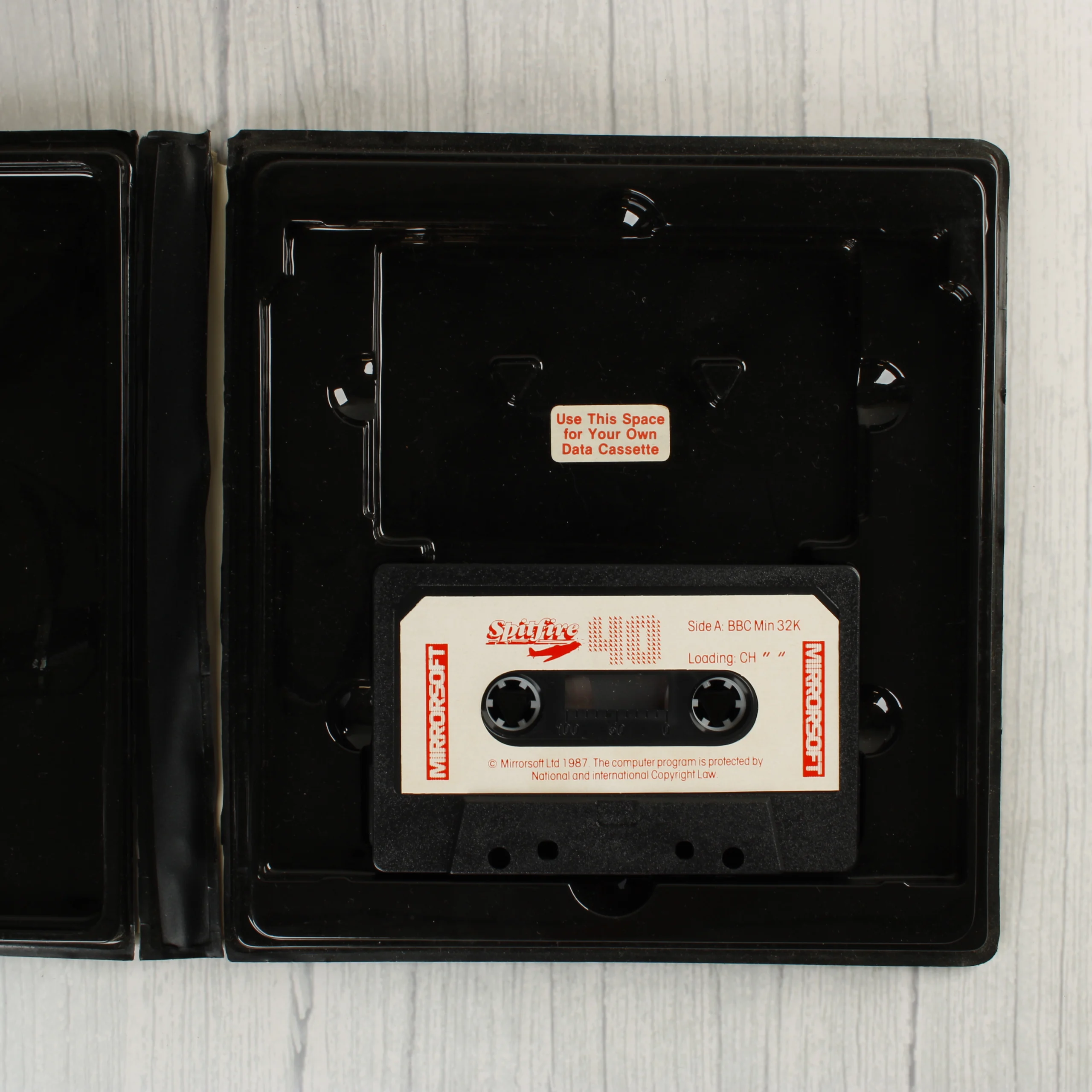 A Spitfire 40 című repülőgép-szimulátor videójáték BBC B és Electron számítógépekre készült kiadása. A szoftver egy fekete műanyag tokban található, amely egy darab mágnesszalagos kazettát tartalmaz. A borítón egy Spitfire vadászgép látható repülés közben, kék égbolt előtt, Mirrorsoft márkajelzéssel. A hátoldalon angol nyelvű leírás és képernyőmentések találhatók a játékról, valamint egy vonalkód. A belső részben a kazetta mellett egy üres hely is ki van alakítva saját adatkazetta számára. A csomagolás és a hordozó fizikai állapota megkímélt, a korának megfelelő jelekkel.