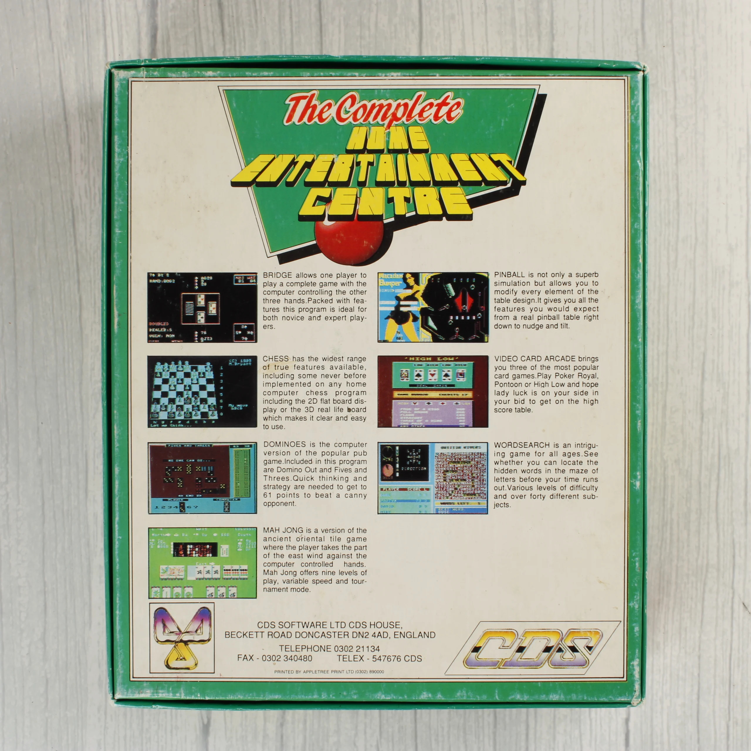 A The Complete Home Entertainment Centre egy Commodore 64 platformra megjelent videójáték-gyűjtemény a CDS Software gondozásában. A csomag egy nagyméretű, zöld alapszínű kartondobozban érkezik, amelynek előlapján különféle játékokat (például sakk, mahjong, dominó) ábrázoló illusztrációk láthatók. A doboz hátoldala részletes leírást és képernyőképeket tartalmaz a válogatásban szereplő programokról, mint a Bridge, Pinball, Chess és Wordsearch. A belső részben egy fekete műanyag tálca tartja a szoftvert tartalmazó 5,25 colos floppy lemezt, amely sárga címkével van ellátva. A lemez papírtokban pihen, a csomagolás pedig korának megfelelő, használt állapotban van, a széleken látható kopásokkal.