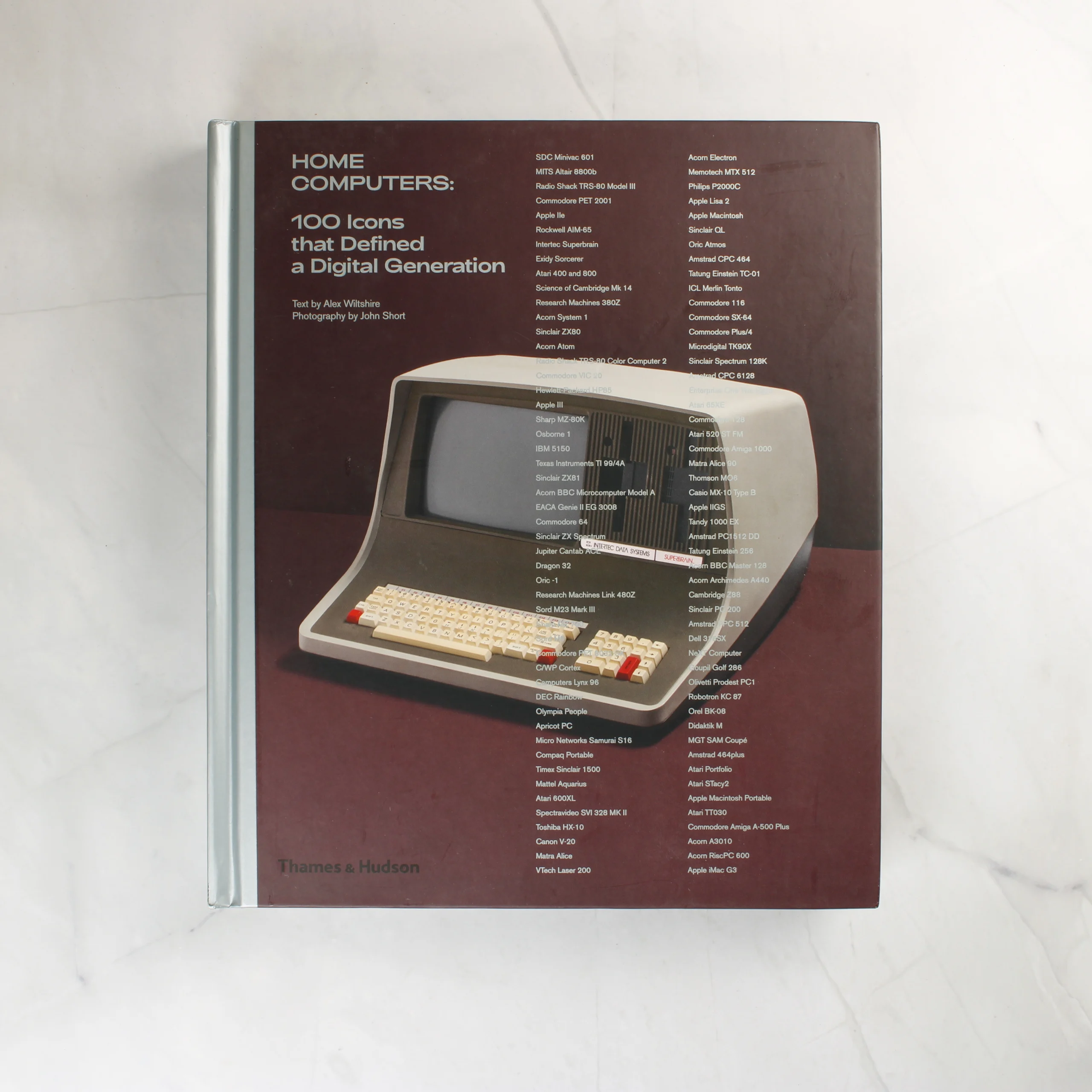 Ez a keménytáblás könyv a korai otthoni számítógépek világát mutatja be száz ikonikus modellen keresztül. A borítón egy barna alapszínű dizájn látható, amelyen egy Intertec Superbrain számítógép fotója és a bemutatott gépek listája szerepel. A belső oldalak gazdagon illusztráltak, nagy felbontású színes fotókkal és részletes angol nyelvű leírásokkal olyan klasszikusokról, mint a Commodore PET 8032-SK vagy a hordozható Commodore SX-64. A kiadvány a Thames & Hudson gondozásában jelent meg, Alex Wiltshire szövegével és John Short fotóival. A könyv gerince ép, a lapok tiszták, a nyomtatás minősége kiváló. A hátsó borítón további termékfotók, egy rövid összefoglaló és az ISBN vonalkód található. A kötet átfogó technikai adatokat és történelmi kontextust nyújt a digitális korszak meghatározó eszközeiről.