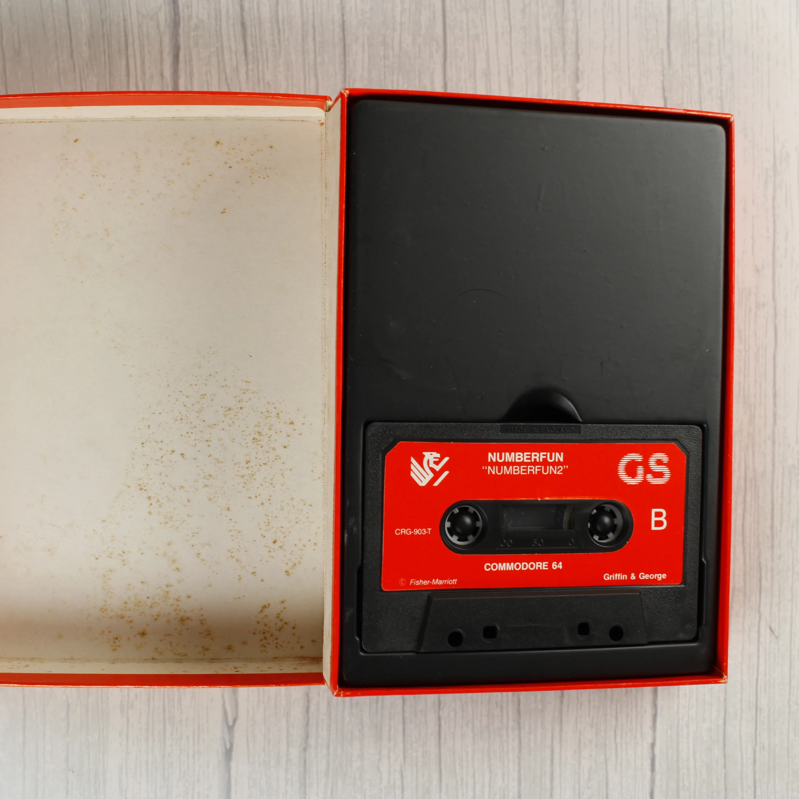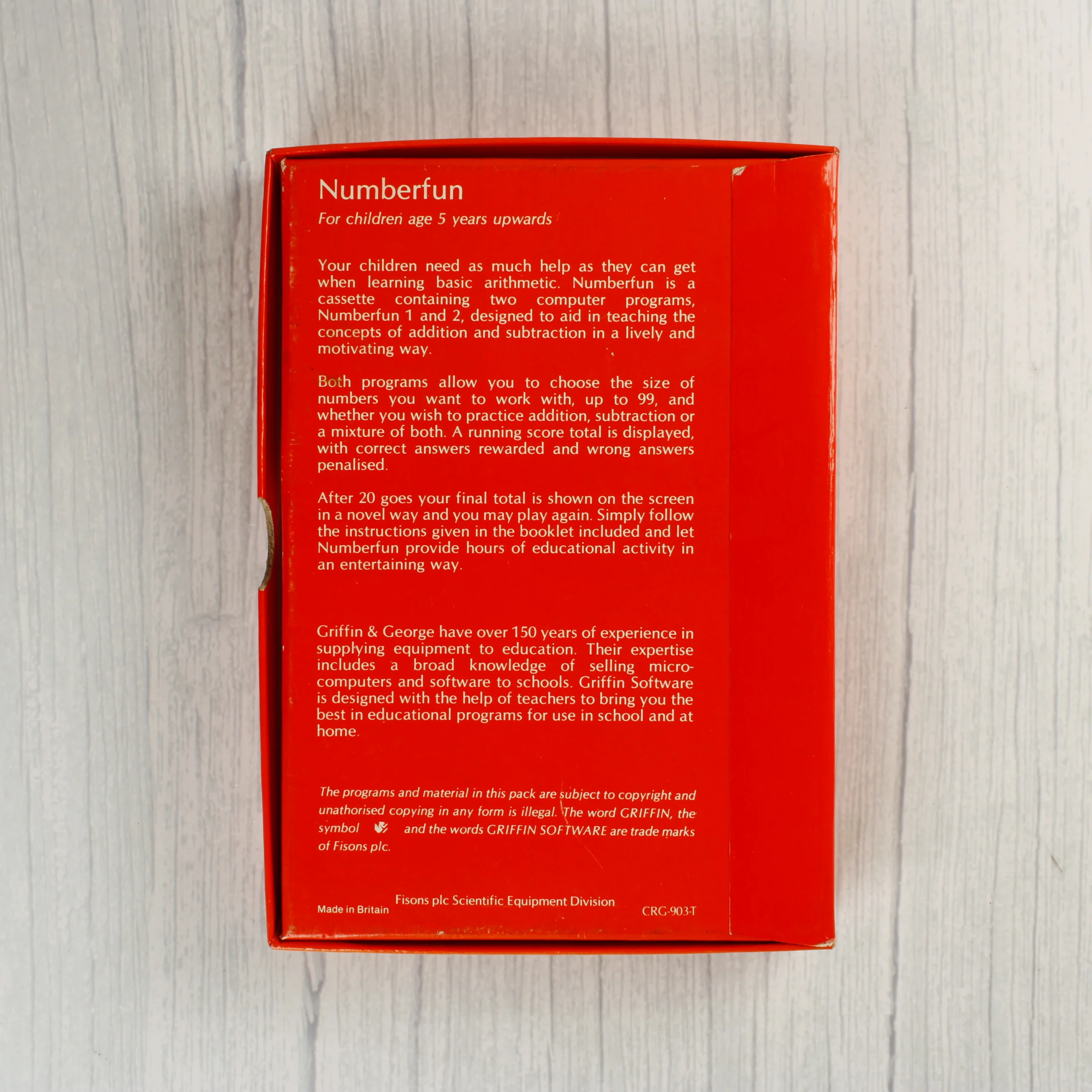 A Griffin Software által kiadott Numberfun egy oktatóprogram Commodore 64 számítógéphez. A termék egy piros színű, kartonból készült dobozban található, amelynek elején sárga alapon zöld és kék színű, pixeles számjegyek és egy plusz jel látható. A csomag tartalmaz egy fekete műanyag kazettát, amelyen piros címke jelzi a szoftver címét és a platformot. A doboz hátoldalán angol nyelvű leírás olvasható a program funkcióiról, amely az összeadás és kivonás alapjait tanítja 5 éves kortól. A belső tárolórekesz fekete műanyagból készült, a doboz belsejében pedig némi sárgás elszíneződés és apró foltok láthatóak az öregedés jeleként.