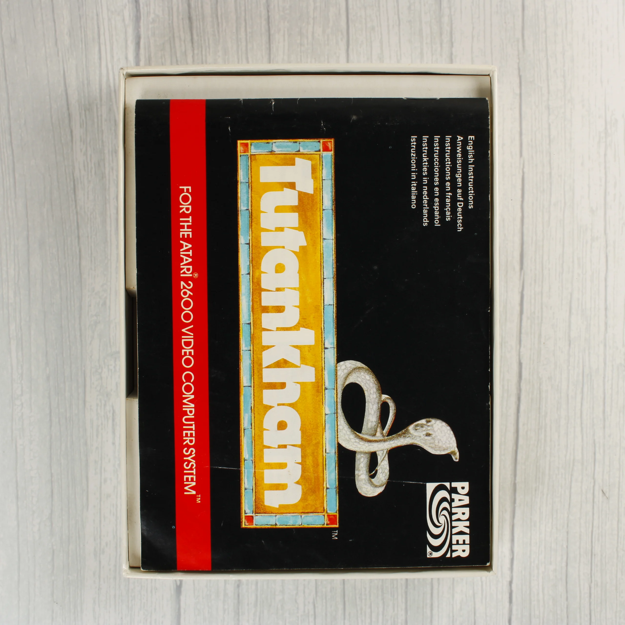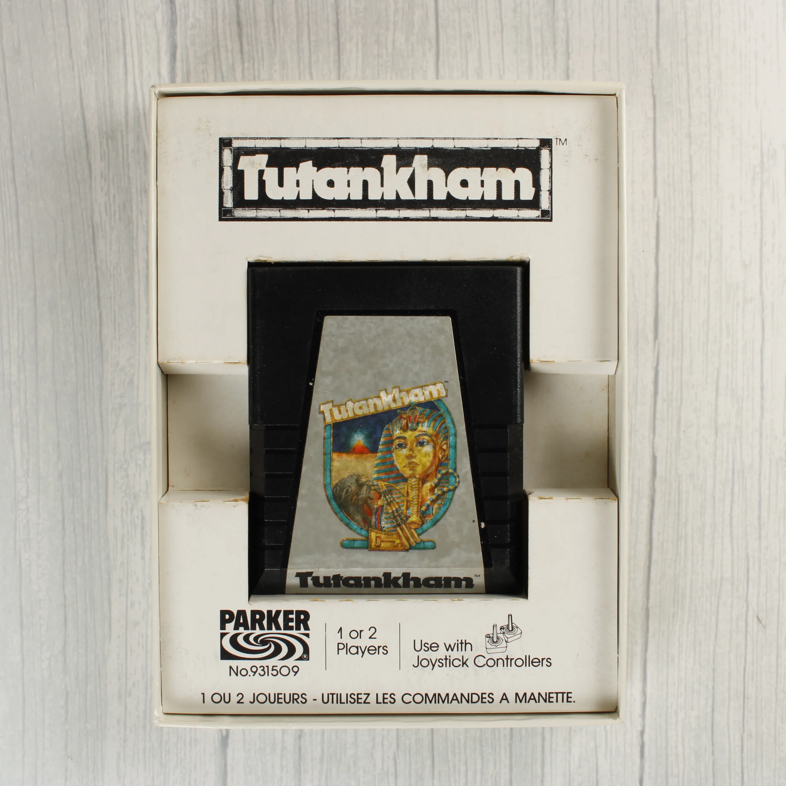 A Parker Brothers által kiadott Tutankham videójáték Atari 2600 konzolhoz. A csomag tartalmazza az eredeti kartondobozt, a belső papírtartót, a fekete műanyag házas cartridge-et és a többnyelvű használati útmutatót. A doboz elején Tutanhamon fáraó maszkja, egy kobra és egy piramis látható illusztrációként. A hátoldalon többnyelvű játékleírás és három színes képernyőkép mutatja be a játékmenetet. A cartridge címkéje megegyezik a doboz grafikájával. A használati útmutató fekete alapon sárga felirattal és egy kobra rajzával készült. A termék az Arcade Game Series sorozat része, a Konami Industry Co., Ltd. licence alapján készült.
