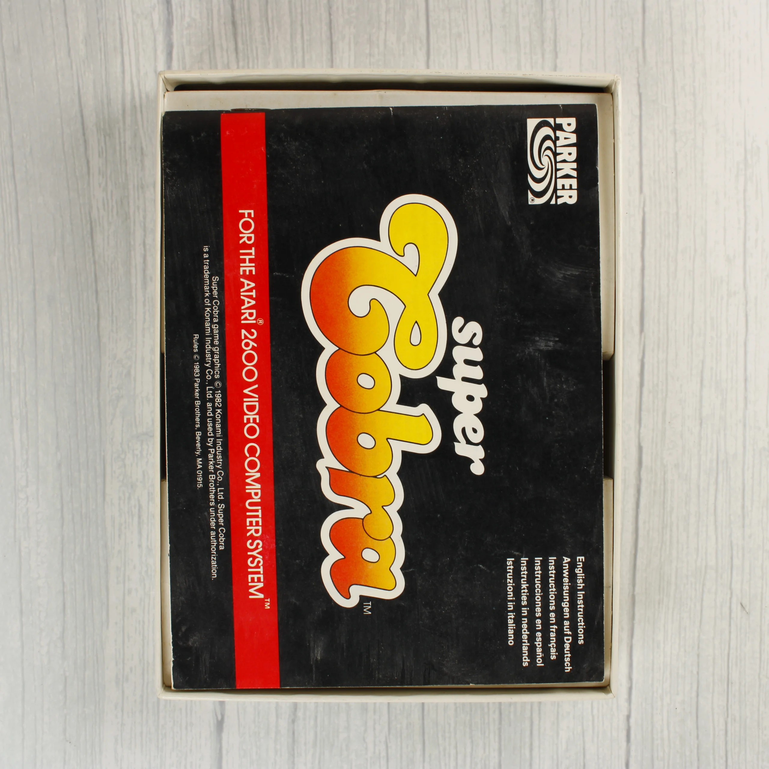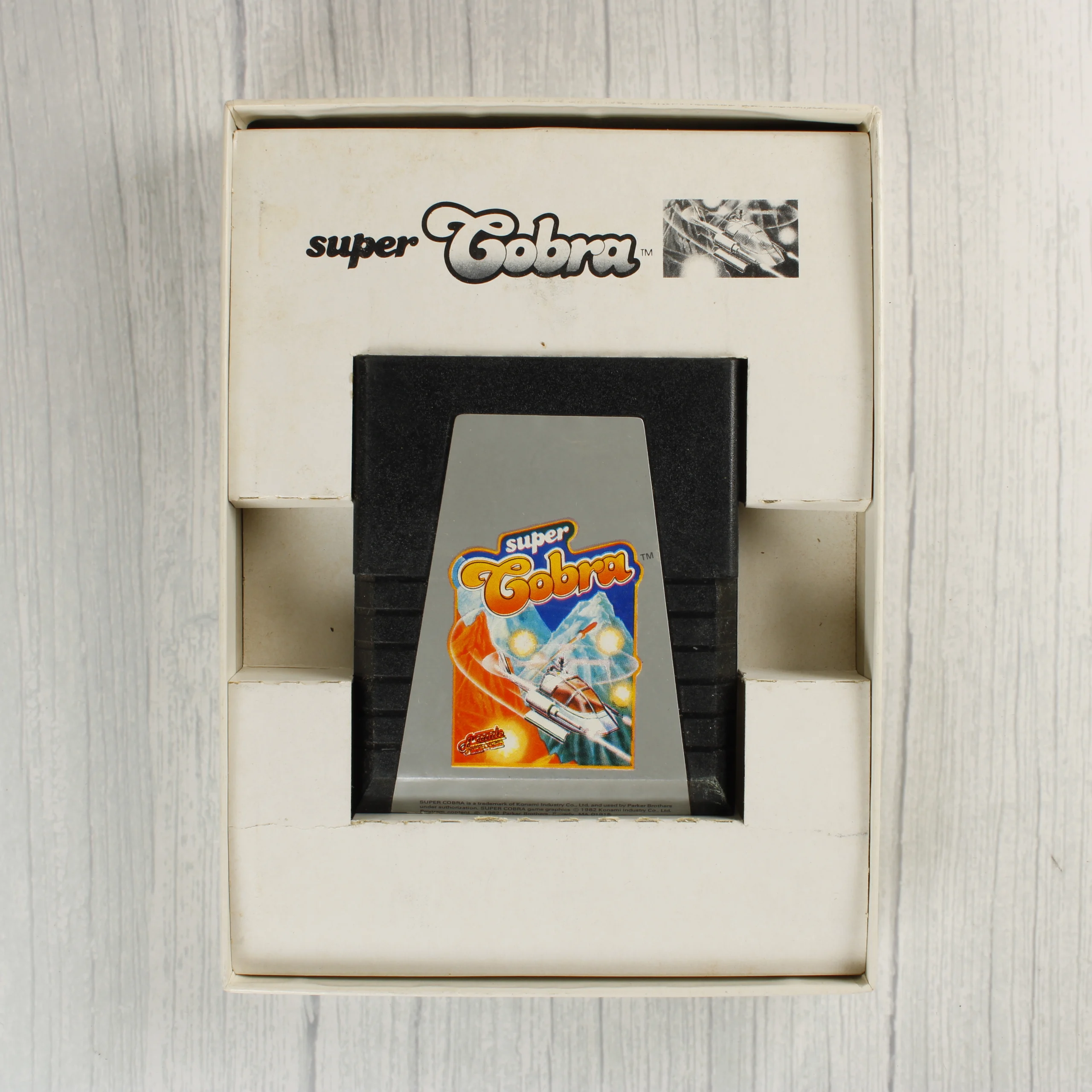 A Super Cobra videójáték eredeti dobozos kiadása Atari 2600 konzolhoz. A csomag tartalmazza a szürke alapszínű, illusztrált kartondobozt, a fekete műanyag házas játék cartridge-et, a belső fehér papírtartót és a többnyelvű használati útmutatót. A doboz elején egy helikopter látható akció közben, hegyvidéki környezetben. A hátoldalon hat különböző nyelven olvasható a játék leírása, valamint egy képernyőkép is helyet kapott a játékmenetről. A termék a Parker Brothers gondozásában jelent meg a Konami licence alapján.