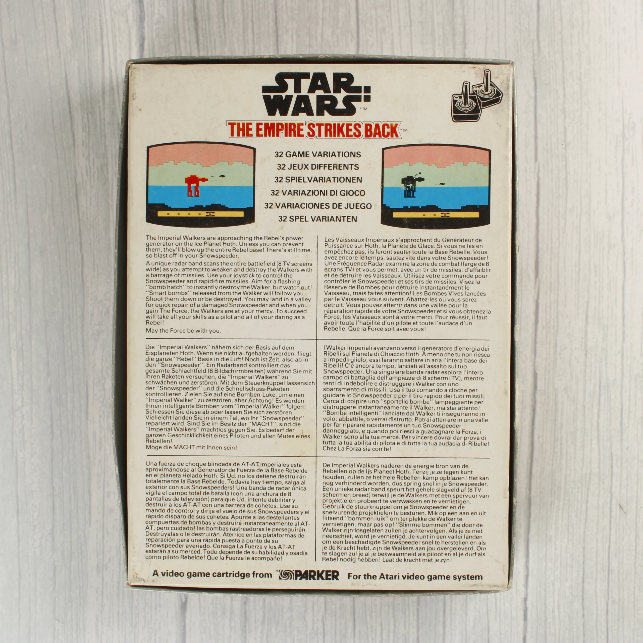 A Star Wars: The Empire Strikes Back videójáték Atari 2600 (Atari Video Computer System) konzolhoz. A csomag tartalmazza az eredeti kartondobozt, a fekete műanyag házas cartridge-et és a többnyelvű használati útmutatót. A doboz elején egy AT-AT lépegető látható harci jelenetben, a hátoldalon pedig többnyelvű leírás és játékmenet-képek szerepelnek. A cartridge címkéje megegyezik a doboz grafikájával. Az útmutató fekete borítóján fehér feliratok és egy Snowspeeder illusztrációja látható. A termék a Parker Brothers gondozásában jelent meg.