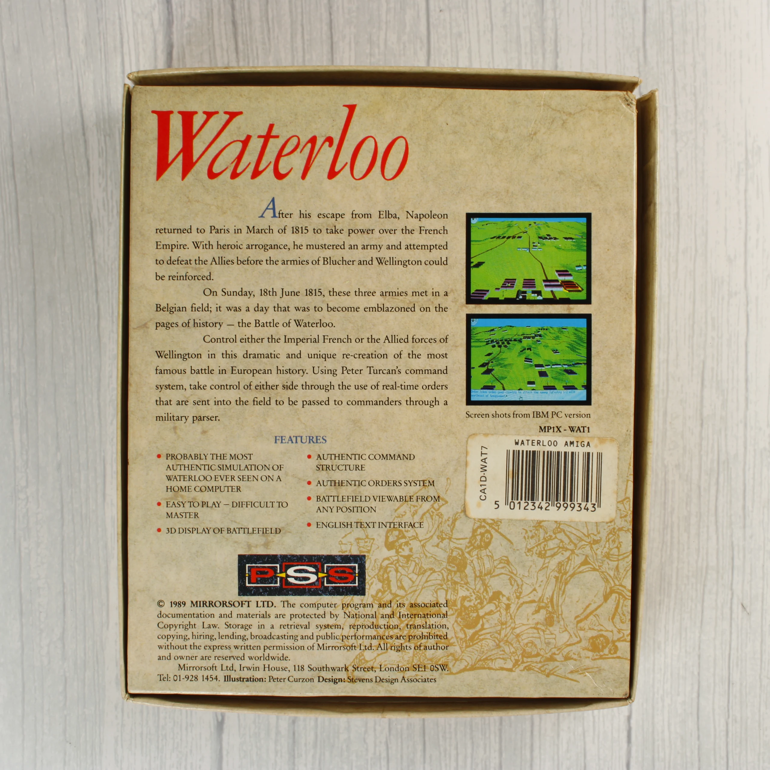 A Waterloo című stratégiai videójáték Amiga platformra kiadott változata. A csomag tartalmazza az eredeti kartondobozt, egy fekete-fehér illusztrációval ellátott kézikönyvet és egy kék színű, 3,5 colos floppy lemezt. A doboz elején Napóleon portréja, lovas katonák és egy ágyú látható, a jobb felső sarokban egy narancssárga árcímke maradványa és egy Amiga logó található. A hátoldalon a játék leírása, képernyőmentések és a PSS kiadó logója látható. A termék az 1989-es Mirrorsoft kiadás része. A doboz élei mentén enyhe kopás és benyomódás látható, a kézikönyv borítóján pedig kisebb elszíneződések és foltok fedezhetők fel.