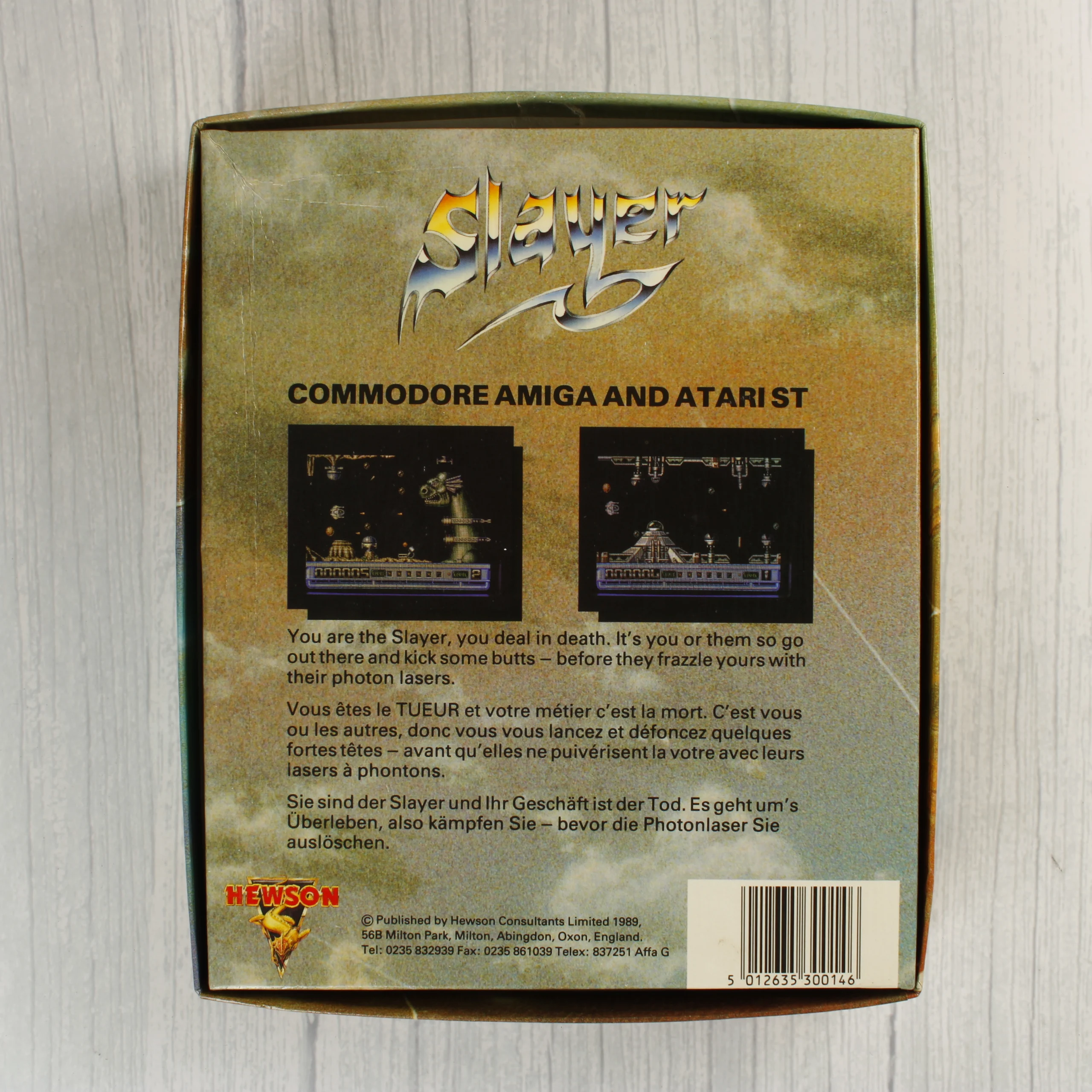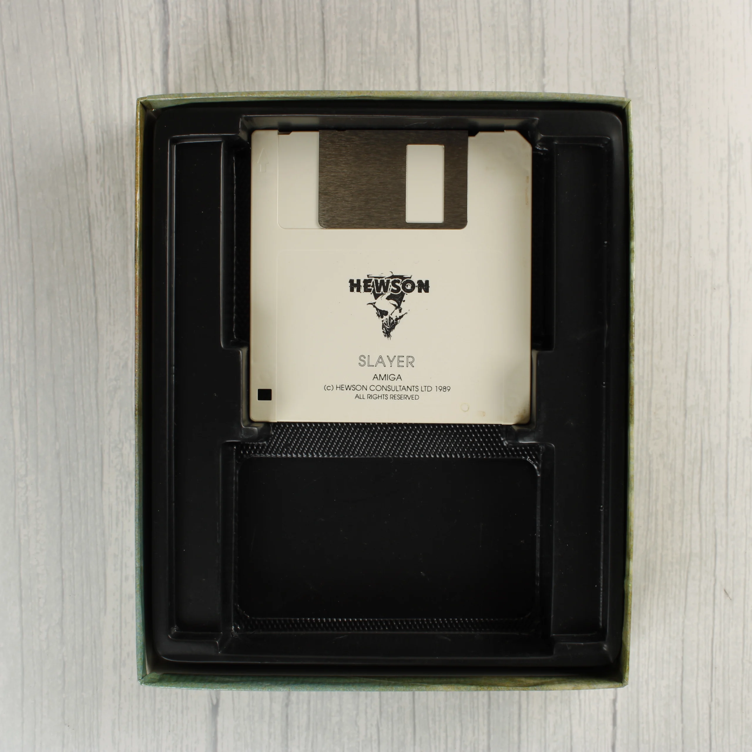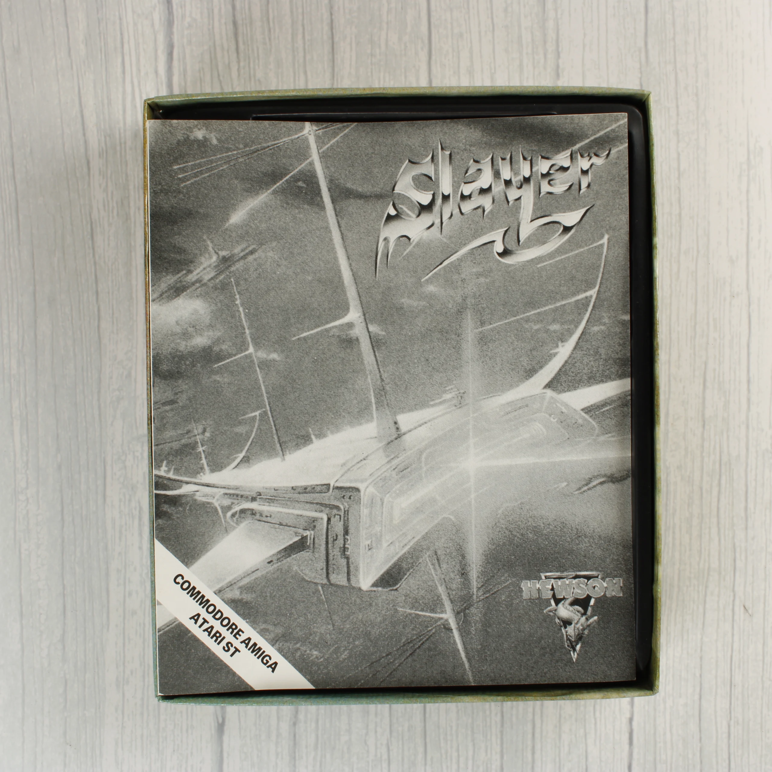 A Slayer című videójáték Commodore Amiga platformra készült kiadása, eredeti kartondobozos csomagolásban. A doboz elején egy futurisztikus űrhajót ábrázoló színes illusztráció látható, a bal alsó sarokban kék sáv jelzi a kompatibilitást. A csomag tartalmazza az eredeti 3,5 colos floppy lemezt, amely egy fekete műanyag tálcában helyezkedik el, valamint egy fekete-fehér borítójú használati útmutatót. A doboz hátoldalán többnyelvű leírás és két képernyőkép látható a játékmenetből. A kiadó a Hewson Consultants, a termék 1989-es évszámmal van jelölve. A doboz élei és sarkai enyhén kopottak, de a szerkezete ép. A floppy lemez címkéje tiszta, a feliratok jól olvashatóak.