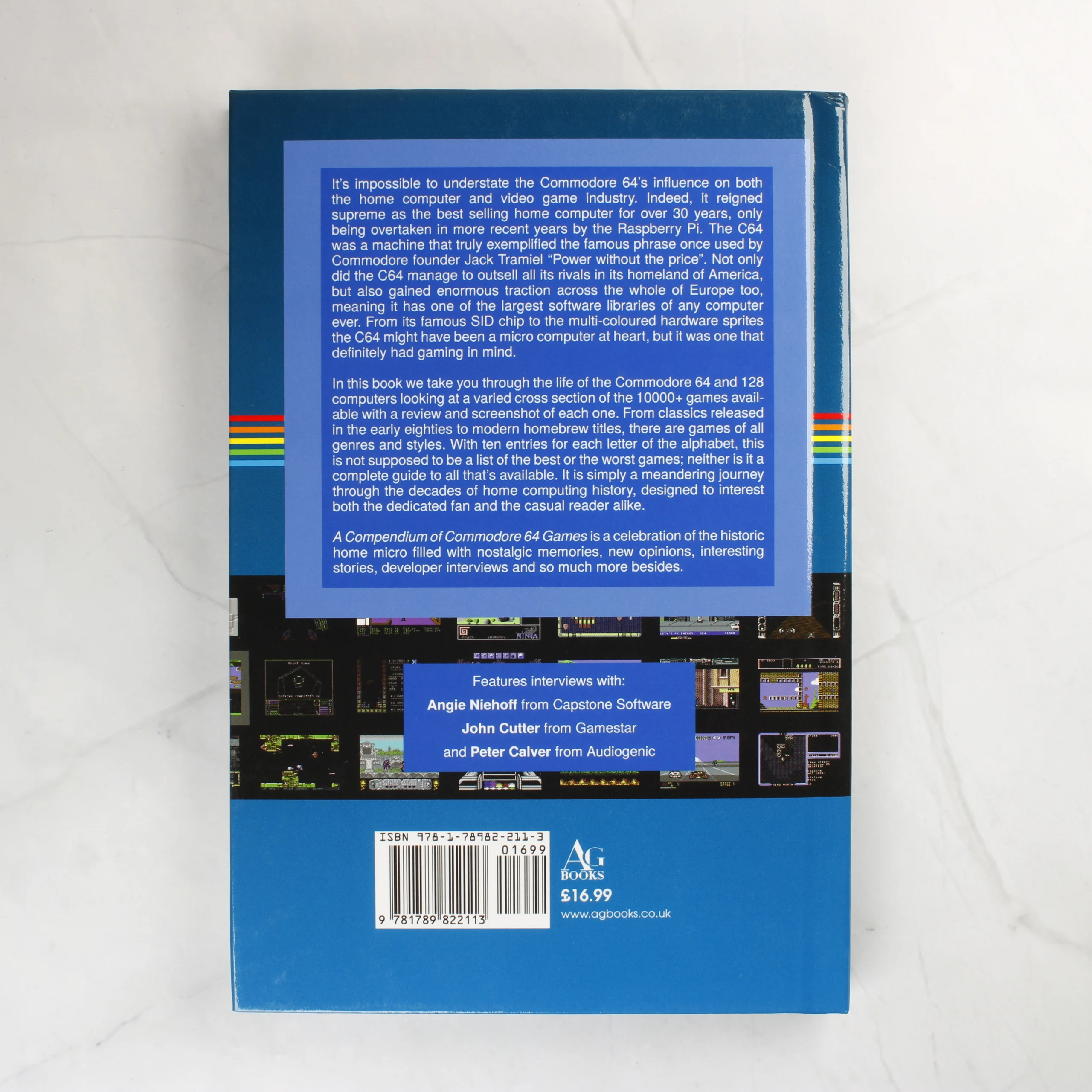 A Compendium of Commodore 64 Games Volume One című keménytáblás könyv, Kieren Hawken tollából. A kiadvány a Collector's Edition változat, amely kék alapszínű borítóval rendelkezik. Az előlapon egy Commodore 64 számítógép fotója, videójátékokból származó képernyőmentések és a jellegzetes szivárványszínű sáv látható. A hátsó borítón részletes ismertető szöveg, interjúalanyok névsora, vonalkód és az AG Books kiadó logója szerepel. A könyv fizikai állapota kiváló, a sarkok épek, a borító felülete tiszta és karcmentes, a kötés szorosnak tűnik.